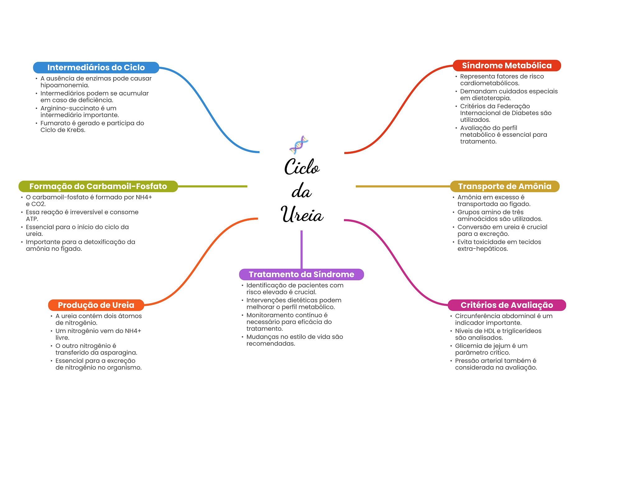 Intermediários do Ciclo Síndrome Metabólica A ausência de enzimas pode causar Representa fatores de risco hipoamonemia. cardiometabólicos. Intermediários podem se acumular Demandam cuidados especiais em caso de deficiência. em dietoterapia. Arginino-succinato é um Critérios da Federação intermediário importante. Internacional de Diabetes são utilizados. Fumarato é gerado e participa do Ciclo de Krebs. Avaliação do perfil metabólico é essencial para tratamento. Ciclo Formação do Carbamoil-Fosfato da Transporte de Amônia carbamoil-fosfato é formado por NH4+ Amônia em excesso é e CO2. transportada ao fígado. Essa reação é irreversível e consome Ureia Grupos amino de três ATP. aminoácidos são utilizados. Essencial para início do ciclo da Conversão em ureia é crucial ureia. para a excreção. Importante para a detoxificação da Evita toxicidade em tecidos amônia no fígado. extra-hepáticos. Tratamento da Síndrome Identificação de pacientes com risco elevado é crucial. Intervenções dietéticas podem Produção de Ureia melhorar perfil metabólico. Critérios de Avaliação A ureia contém dois átomos Monitoramento contínuo é Circunferência abdominal é um de nitrogênio. necessário para eficácia do indicador importante. Um nitrogênio vem do NH4+ tratamento. Níveis de HDL e triglicerídeos livre. Mudanças no estilo de vida são são analisados. outro nitrogênio é recomendadas. Glicemia de jejum é um transferido da asparagina. parâmetro crítico. Essencial para a excreção Pressão arterial também é de nitrogênio no organismo. considerada na avaliação.