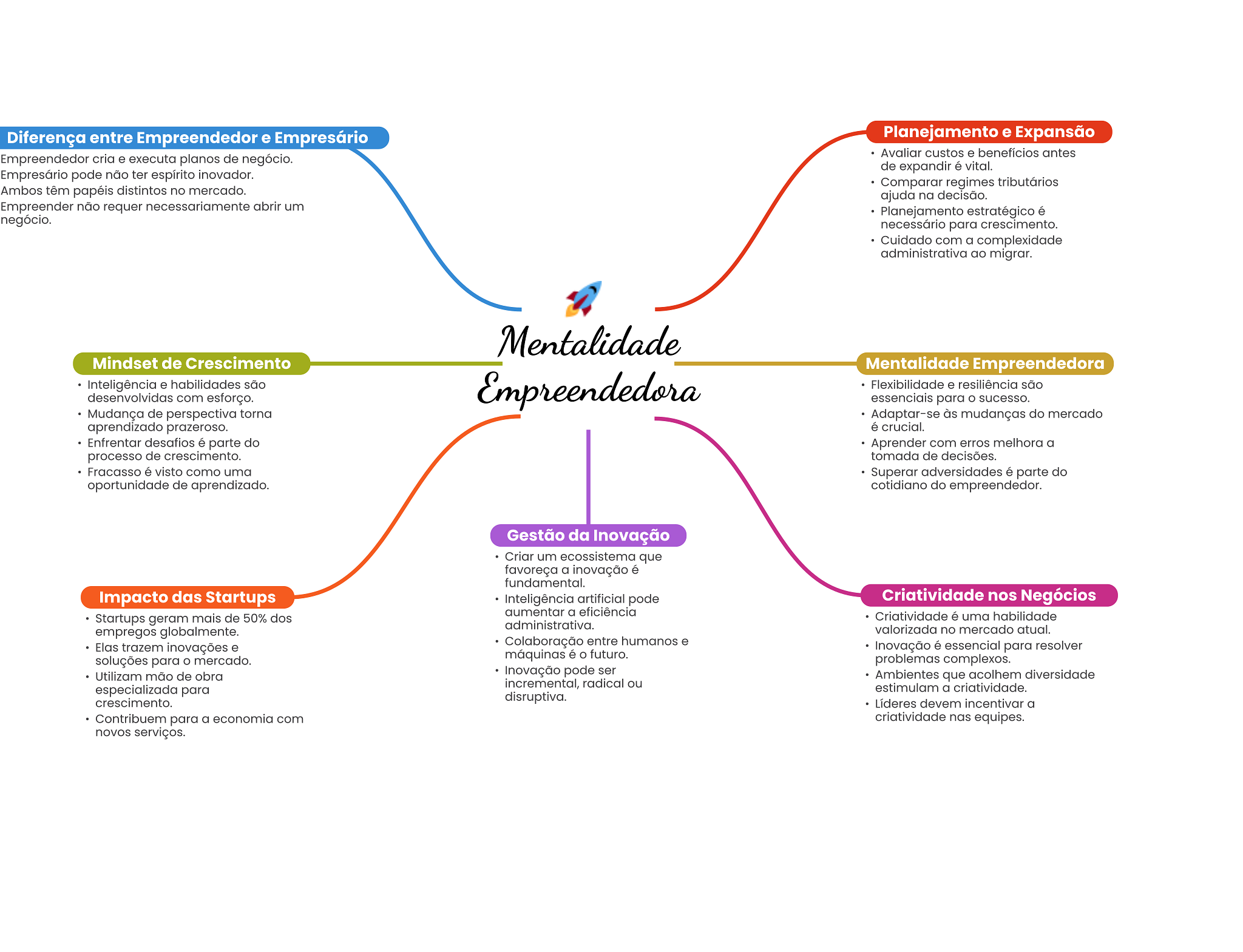 Diferença entre Empreendedor e Empresário Planejamento e Expansão Avaliar custos e benefícios antes Empreendedor cria e executa planos de negócio. de expandir é vital. Empresário pode não ter espírito inovador. Comparar regimes tributários Ambos têm papéis distintos no mercado. ajuda na decisão. Empreender não requer abrir um Planejamento estratégico é negócio. necessário para crescimento. Cuidado com a complexidade administrativa ao migrar. Mentalidade Mindset de Crescimento Mentalidade Empreendedora Inteligência e habilidades são Empreendedora Flexibilidade e resiliência são desenvolvidas com esforço. essenciais para sucesso. Mudança de perspectiva torna Adaptar-se às mudanças do mercado aprendizado prazeroso. é crucial. Enfrentar desafios é parte do Aprender com erros melhora a processo de crescimento. tomada de decisões. Fracasso é visto como uma Superar adversidades é parte do oportunidade de aprendizado. cotidiano do empreendedor. Gestão da Inovação Criar um ecossistema que favoreça a inovação é fundamental. Impacto das Startups Inteligência artificial pode Criatividade nos Negócios aumentar a eficiência Startups geram mais de 50% dos Criatividade é uma habilidade administrativa. empregos globalmente. valorizada no mercado atual. Elas trazem inovações e Colaboração entre humanos e Inovação é essencial para resolver soluções para mercado. máquinas é O futuro. problemas complexos. Utilizam mão de obra Inovação pode ser Ambientes que acolhem diversidade incremental, radical ou especializada para estimulam a criatividade. crescimento. disruptiva. Líderes devem incentivar a Contribuem para a economia com criatividade nas equipes. novos serviços.