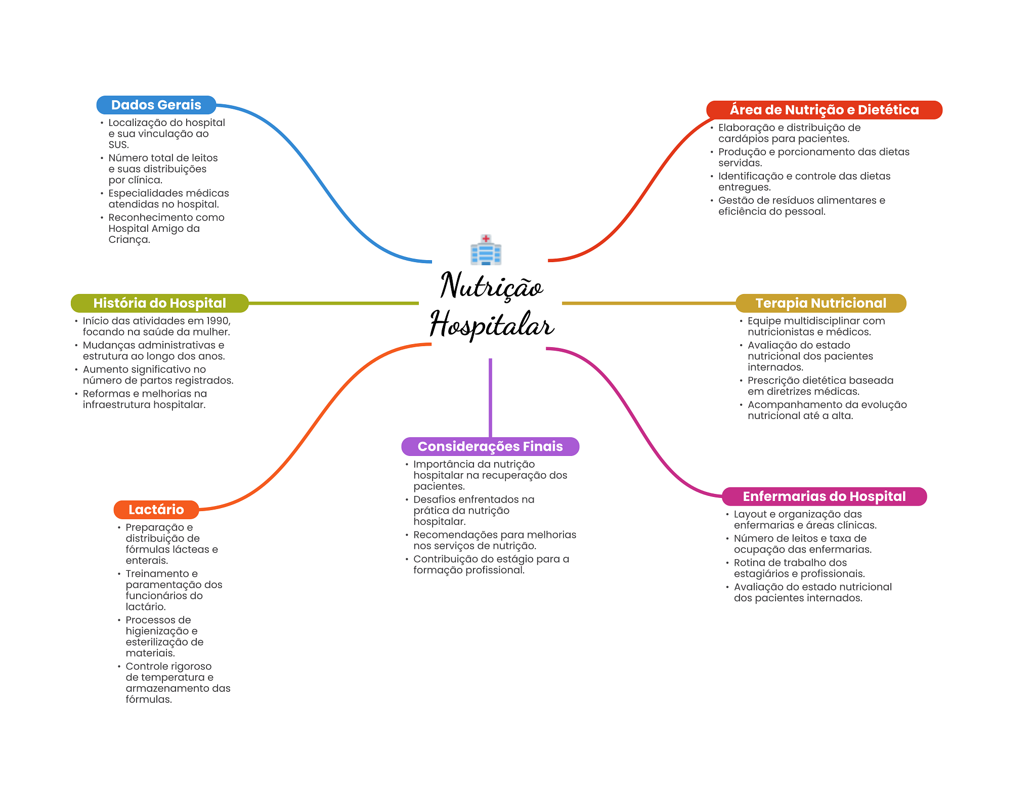 Dados Gerais Área de Nutrição e Dietética Localização do hospital e sua vinculação ao Elaboração e distribuição de SUS. cardápios para pacientes. Número total de leitos Produção e porcionamento das dietas servidas. e suas distribuições por clínica. Identificação e controle das dietas Especialidades médicas entregues. atendidas no hospital. Gestão de resíduos alimentares e Reconhecimento como eficiência do pessoal. Hospital Amigo da Criança. Nutrição História do Hospital Terapia Nutricional Início das atividades em 1990, Hospitalar Equipe multidisciplinar com focando na saúde da mulher. nutricionistas e médicos. Mudanças administrativas e Avaliação do estado estrutura ao longo dos anos. nutricional dos pacientes Aumento significativo no internados. número de partos registrados. Prescrição dietética baseada Reformas e melhorias na em diretrizes médicas. infraestrutura hospitalar. Acompanhamento da evolução nutricional até a alta. Considerações Finais Importância da nutrição hospitalar na recuperação dos pacientes. Desafios enfrentados na Enfermarias do Hospital Lactário prática da nutrição Layout e organização das Preparação e hospitalar. enfermarias e áreas clínicas. distribuição de Recomendações para melhorias Número de leitos e taxa de fórmulas lácteas e nos serviços de nutrição. ocupação das enfermarias. enterais. Contribuição do estágio para a Rotina de trabalho dos Treinamento e formação profissional. estagiários e profissionais. paramentação dos Avaliação do estado nutricional funcionários do dos pacientes internados. lactário. Processos de higienização e esterilização de materiais. Controle rigoroso de temperatura e armazenamento das fórmulas.