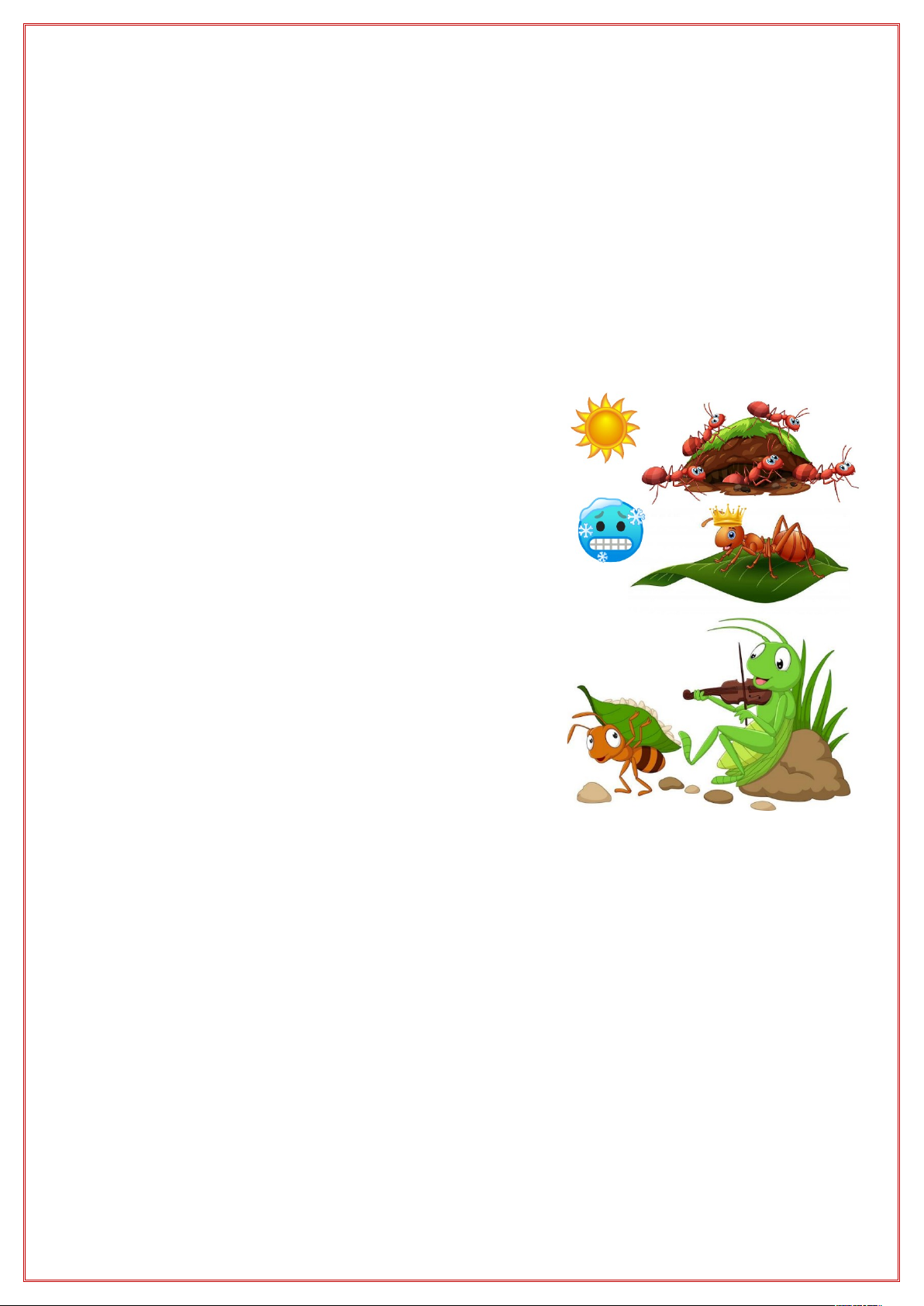 LEIA A FÁBULA E RESPONDA AS SEGUINTES PERGUNTAS ABAIXO. A CIGARRA E A FORMIGA A CIGARRA PASSOU TODO O VERÃO CANTANDO, ENQUANTO A FORMIGA JUNTAVA SEUS GRÃOS. QUANDO CHEGOU O INVERNO. A CIGARRA VEIO À CASA DA FORMIGA PARA PEDIR, QUE LHE DESSE O QUE COMER. A FORMIGA ENTÃO PERGUNTOU A ELA. — E O QUE VOCÊ FEZ DURANTE O VERÃO? — DURANTE O VERÃO EU CANTEI – DISSE A CIGARRA. — E A FORMIGA RESPONDEU. — MUITO BEM, POIS AGORA DANCE! RUTH ROCHA DE ACORDO COM O TEXTO RESPONDA: A) QUAL O TÍTULO DO TEXTO? ( ) A CIGARRA E A FORMIGA ( ) A FORMIGA E A CIGARRA ( ) A CIGARRA E A CANTORA B) ENQUANTO A FORMIGA JUNTAVA SEUS GRÃOS, O QUE A CIGARRA FAZIA? ( ) DANÇAVA ( ) BRINCAVA ( ) CANTAVA C) O QUE A FORMIGA MANDOU A CIGARRA FAZER? ( ) AGORA CANTE! ( ) AGORA DANCE! ( ) AGORA BRINQUE! CRUZADINHA COMPLETE A CRUZADINHA OBSERVANDO AS DICAS. 1. PEQUENO INSETO QUE TRABALHA MUITO, CARREGANDO FOLHAS E ALIMENTOS PARA O FORMIGUEIRO. 2. INSETO QUE CANTA MUITO NO VERÃO E VIVE NO CAMPO OU NAS ÁRVORES. 3. ESTAÇÃO DO ANO EM QUE O CLIMA É MAIS FRIO E AS PESSOAS GERALMENTE USAM CASACOS. 4. ESTAÇÃO DO ANO COM CALOR, EM QUE AS PESSOAS COSTUMAM IR À PRAIA E TOMAR SOL. 5. LUGAR ONDE MORAMOS, PROTEGIDOS DO FRIO, CALOR E CHUVA. F1 3 O 4 I N V E R N O V 2 M E C I G A R R A 5 G Ã C A S A 0 M M M M M M M M M M PINTE DE ACORDO COM AS CORES CORRESPONDENTES: VERMELHO AZUL AMARELO MARROM LARANJA ROSA CINZA ROXO PRETO VERDE image1.png image2.png