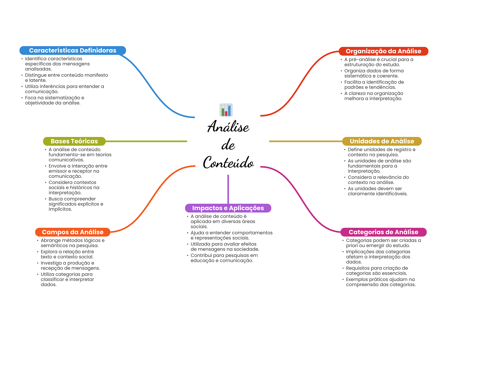 Características Definidoras Organização da Análise Identifica características A pré-análise é crucial para a específicas das mensagens estruturação do estudo. analisadas. Organiza dados de forma Distingue entre conteúdo manifesto sistemática e coerente. e latente. Facilita a identificação de Utiliza inferências para entender a padrões e tendências. comunicação. A clareza na organização Foca na sistematização e melhora a interpretação. objetividade da análise. Análise Bases Teóricas de Unidades de Análise A análise de conteúdo Define unidades de registro e fundamenta-se em teorias contexto na pesquisa. comunicativas. Conteúdo As unidades de análise são Envolve a interação entre fundamentais para a emissor e receptor na interpretação. comunicação. Considera a relevância do Considera contextos contexto na análise. sociais e históricos na As unidades devem ser interpretação. claramente identificáveis. Busca compreender significados explícitos e implícitos. Impactos e Aplicações A análise de conteúdo é aplicada em diversas áreas sociais. Campos da Análise Ajuda a entender comportamentos Categorias de Análise Abrange métodos lógicos e e representações sociais. Categorias podem ser criadas a semânticos na pesquisa. Utilizada para avaliar efeitos priori ou emergir do estudo. Explora a relação entre de mensagens na sociedade. Implicações das categorias texto e contexto social. Contribui para pesquisas em afetam a interpretação dos Investiga a produção e educação e comunicação. dados. recepção de mensagens. Requisitos para criação de Utiliza categorias para categorias são essenciais. classificar e interpretar Exemplos práticos ajudam na dados. compreensão das categorias.