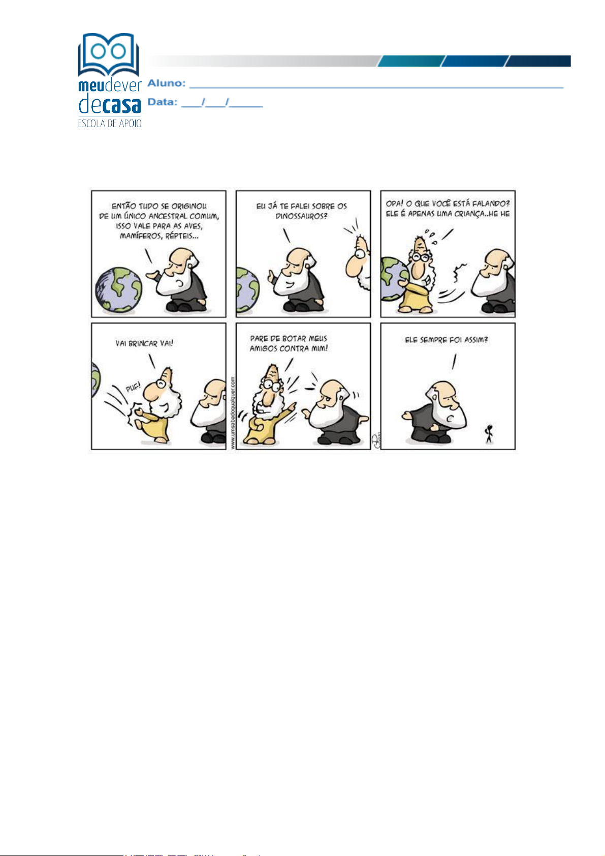 ATIVIDADE SURGIMENTO DA HUMANIDADE E POVOAMENTO DAS AMERICAS – 6° ANO Observe a tirinha abaixo e responda às questões 1 e 2: 1. De acordo com a tirinha, o homem que aparece explicando no primeiro quadrinho é Deus ou Charles Darwin? O que fez você chegar a essa conclusão? _____________________________________________________________________________ _____________________________________________________________________________ _____________________________________________________________________________ _____________________________________________________________________________ 2. Na frase: “Pare de botar meus amigos contra mim! ”, pode-se compreender que: a) a teoria Evolucionista é igual a Teoria Criacionista. b) a teoria de Darwin tenta desacreditar da teoria bíblica. c) só existe uma teoria para a origem do homem. d) a teoria Evolucionista nunca foi aceita por ninguém. 3. Segundo a teoria evolucionista, os seres humanos pertencem à ordem dos primatas, ou seja, dos mamíferos. Acredita-se que um grupo de primatas deu origem aos primeiros hominídeos, seres que já possuíam algumas características humanas. Como se chama o primeiro hominídeo? _____________________________________________________________________________ _____________________________________________________________________________ 4. Observe a imagem abaixo e aponte as principais mudanças que o homem sofreu durante seu processo de evolução. _____________________________________________________________________________ _____________________________________________________________________________ _____________________________________________________________________________ _____________________________________________________________________________ _____________________________________________________________________________ _____________________________________________________________________________ _____________________________________________________________________________ _____________________________________________________________________________ 5. Qual a espécie do Homem no mundo contemporâneo e qual sua principal característica? _____________________________________________________________________________ _____________________________________________________________________________ 6. De acordo com as teorias e achados arqueológicos, acredita-se que as duas últimas espécies humanas haviam convivido na terra, e a menos evoluída teria desaparecido por conta das condições climáticas e dos embates com a outra espécie de homem mais evoluída. Quais as duas espécies humanas que podem ter convivido na terra? a) Homo Neanderthalensis e Homo sapiens sapiens. b) Australopithecus afarensis e Homo habilis. c) Homo habilis e Homo erectus. d) Homo erectus e Homo Neanderthalensis. 7. A África é considerada o berço da humanidade, pois lá foram encontrados os fósseis mais antigos da espécie humana. Assim, conclui-se que o homem teria surgido na África. Sabendo disso, posturas onde pessoas tentam classificar os africanos como inferiores perde a lógica, pois todos os seres humanos têm uma raiz africana. Com base nessa afirmação e observando a imagem abaixo, comente sua opinião sobre o assunto. _____________________________________________________________________________ _____________________________________________________________________________ _____________________________________________________________________________ _____________________________________________________________________________ _____________________________________________________________________________ _____________________________________________________________________________ 8. A Pré-História pode ser definida como: a) O período em que os Dinossauros dominaram o planeta. b) O período anterior ao surgimento da escrita. c) O período que vai do surgimento da escrita até o início da civilização grega. d)O período em que o ser humano vivia em cavernas, caçava com pedaços de pedras e ossos e escrevia textos em blocos de pedras. 9. Qual das alternativas abaixo apresenta as principais características do período da Pré-História conhecido como Paleolítico? a) Os homens praticavam a agricultura e domesticavam animais. b) Os homens viviam em casas, organizadas em vilas, o poder ficava nas mãos de um chefe. c) Os homens faziam artefatos (ferramentas, armas, utensílios domésticos) de ferro e construíam suas casas de madeira e argila. d) Os homens habitavam cavernas, viviam da caça de animais e coleta de vegetais, usavam instrumentos feitos com ossos e pedras lascadas. 10. Qual das alternativas abaixo apresenta importantes características do período da Pré-História conhecido como Neolítico? a) O ser humano vivia em cavernas, caçava com pedaços de pedras e ossos e escrevia textos em blocos de argila. b) A religião estava bem desenvolvida e organizada, assim como o sistema político baseado na democracia. c) Neste período ocorreu a sedentarização com a prática da agricultura e a domesticação de animais. d) Os seres humanos não falavam, apenas emitiam ruídos para se comunicarem. 11. Qual das alternativas abaixo apresenta importantes características do período da Pré-História conhecido como Idade dos Metais? a) O homem passou a cunhar moedas e desenvolveu um avançado sistema financeiro b) Na Idade dos Metais, os homens da Pré-História inventaram várias máquinas de ferro e bronze, fato que aumentou a produtividade de objetos manufaturados. c) O desenvolvimento de técnicas de fundir e moldar metais (cobre, ferro e bronze) trouxe muitos avanços na vida cotidiana do homem pré-histórico. d) Embora conhecessem as técnicas de fundição de metais, os homens deste período continuaram a fazer ferramentas de ossos e pedras lascadas. 12. No Paleolítico (Idade da Pedra Lascada) destacou-se a arte rupestre. Qual das alternativas abaixo explica o que era a arte rupestre? a) A arte rupestr