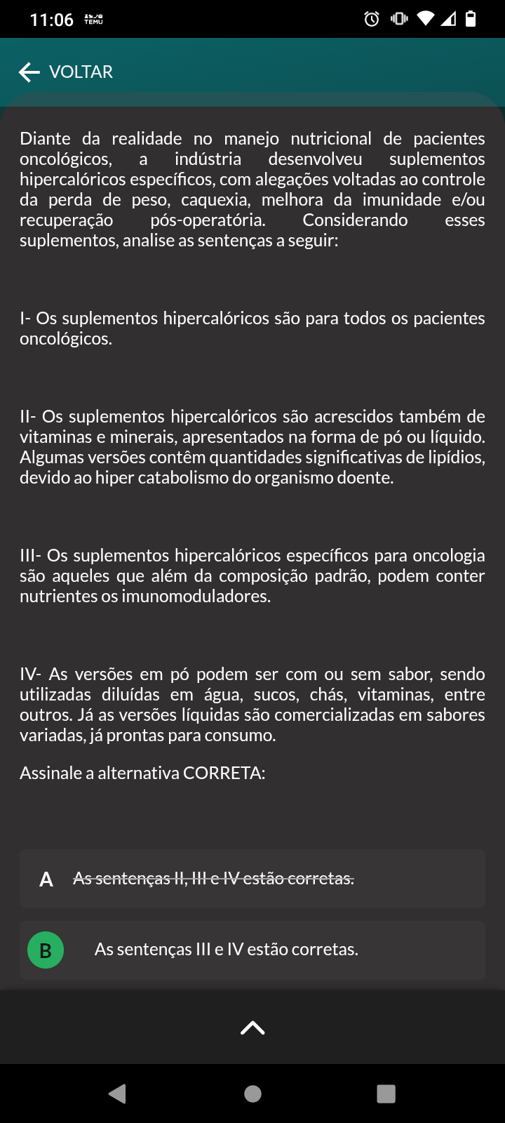 11:06 TEMU VOLTAR Diante da realidade no manejo nutricional de pacientes oncológicos, a indústria desenvolveu suplementos hipercalóricos específicos, com alegações voltadas ao controle da perda de peso, caquexia, melhora da imunidade e/ou recuperação pós-operatória. Considerando esses suplementos, analise as sentenças a seguir: I- Os suplementos hipercalóricos são para todos pacientes oncológicos. II- Os suplementos hipercalóricos são acrescidos também de vitaminas e minerais, apresentados na forma de pó ou líquido. Algumas versões contêm quantidades significativas de lipídios, devido ao hiper catabolismo do organismo doente. III- Os suplementos hipercalóricos específicos para oncologia são aqueles que além da composição padrão, podem conter nutrientes os imunomoduladores. IV- As versões em pó podem ser com ou sem sabor, sendo utilizadas diluídas em água, sucos, chás, vitaminas, entre outros. Já as versões líquidas são comercializadas em sabores variadas, já prontas para consumo. Assinale a alternativa CORRETA: A As sentenças H, e IV estão corretas. As sentenças III e IV estão corretas.