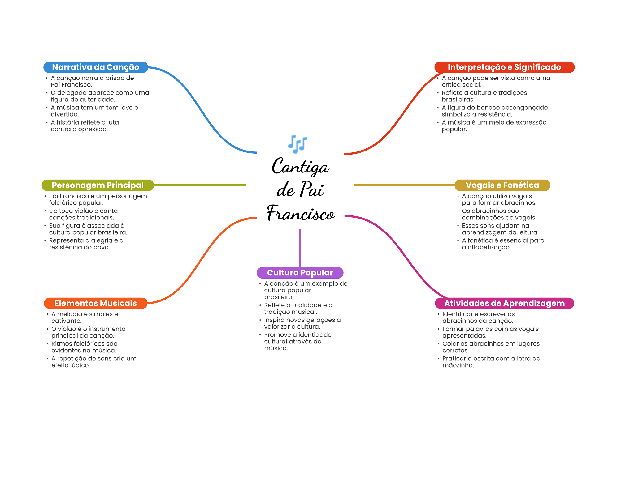 Narrativa da Canção Interpretação e Significado A canção narra a prisão de A canção pode ser vista como uma Pai Francisco. crítica social. delegado aparece como uma Reflete a cultura e tradições figura de autoridade. brasileiras. A música tem um tom leve e A figura do boneco desengonçado divertido. simboliza a resistência. A história reflete a luta A música é um meio de expressão contra a opressão. popular. Cantiga Personagem Principal de Pai Vogais e Fonética Pai Francisco é um personagem A canção utiliza vogais folclórico popular. para formar abracinhos. Ele toca violão e canta canções tradicionais. Francisco Os abracinhos são combinações de vogais. Sua figura é associada à Esses sons ajudam na cultura popular brasileira. aprendizagem da leitura. Representa a alegria e a A fonética é essencial para resistência do povo. a alfabetização. Cultura Popular A canção é um exemplo de cultura popular brasileira. Elementos Musicais Reflete a oralidade e a Atividades de Aprendizagem A melodia é simples e tradição musical. Identificar e escrever cativante. Inspira novas gerações a abracinhos da canção. violão é instrumento valorizar a cultura. Formar palavras com as vogais principal da canção. Promove a identidade apresentadas. Ritmos folclóricos são cultural através da Colar os abracinhos em lugares evidentes na música. música. corretos. A repetição de sons cria um Praticar a escrita com a letra da efeito lúdico. mãozinha.