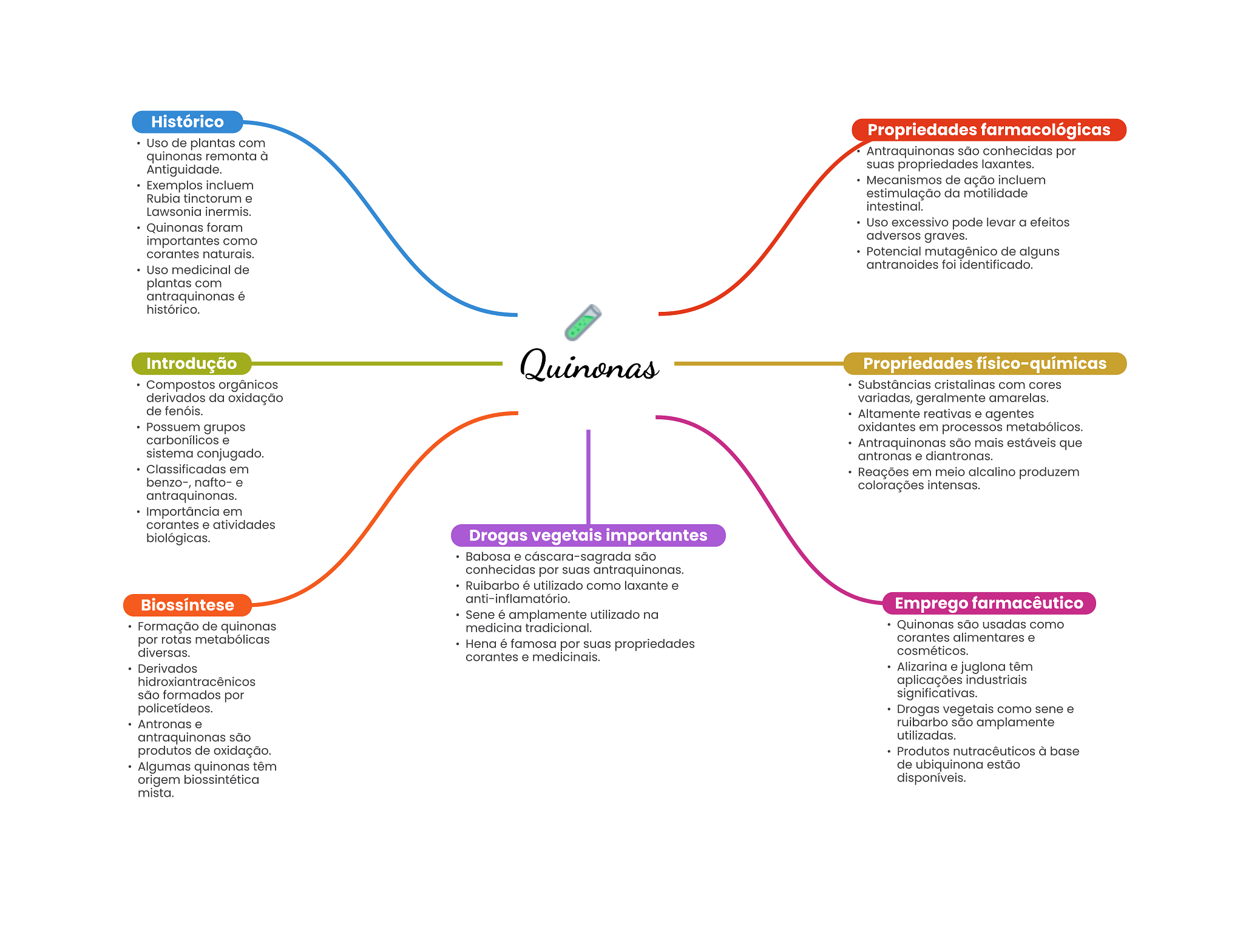 Histórico Propriedades farmacológicas Uso de plantas com quinonas remonta à Antraquinonas são conhecidas por Antiguidade. suas propriedades laxantes. Exemplos incluem Mecanismos de ação incluem Rubia tinctorum e estimulação da motilidade Lawsonia inermis. intestinal. Quinonas foram Uso excessivo pode levar a efeitos importantes como adversos graves. corantes naturais. Potencial mutagênico de alguns Uso medicinal de antranoides foi identificado. plantas com antraquinonas é histórico. Introdução Quinonas Propriedades físico-químicas Compostos orgânicos Substâncias cristalinas com cores derivados da oxidação variadas, geralmente amarelas. de fenóis. Altamente reativas e agentes Possuem grupos oxidantes em processos metabólicos. carbonílicos e Antraquinonas são mais estáveis que sistema conjugado. antronas e diantronas. Classificadas em Reações em meio alcalino produzem benzo-, nafto- e colorações intensas. antraquinonas. Importância em corantes e atividades biológicas. Drogas vegetais importantes Babosa e cáscara-sagrada são conhecidas por suas antraquinonas. Ruibarbo é utilizado como laxante e Biossíntese anti-inflamatório. Emprego farmacêutico Sene é amplamente utilizado na Formação de quinonas medicina tradicional. Quinonas são usadas como por rotas metabólicas corantes alimentares e Hena é famosa por suas propriedades diversas. cosméticos. corantes e medicinais. Derivados Alizarina e juglona têm hidroxiantracênicos aplicações industriais são formados por significativas. Drogas vegetais como sene e Antronas e ruibarbo são amplamente antraquinonas são utilizadas. produtos de oxidação. Produtos nutracêuticos à base Algumas quinonas têm de ubiquinona estão origem biossintética disponíveis. mista.