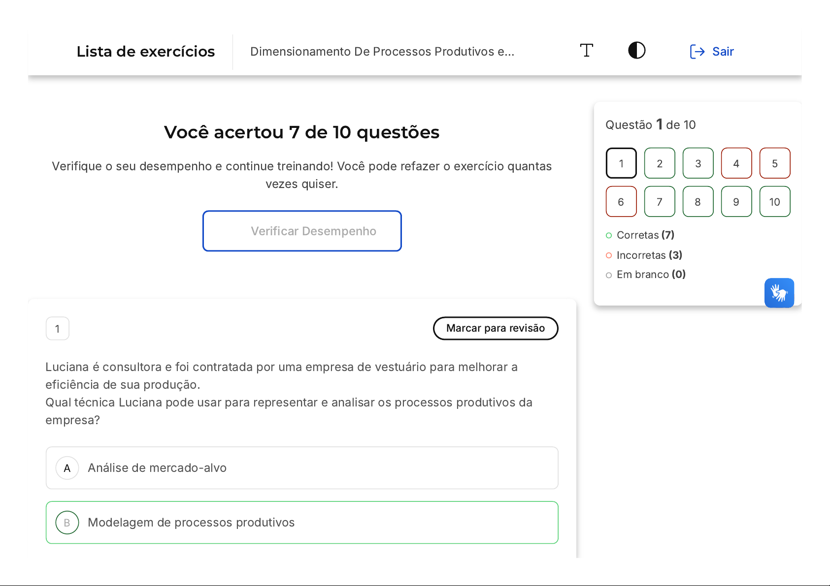 Você acertou 7 de 10 questões Verifique o seu desempenho e continue treinando! Você pode refazer o exercício quantas vezes quiser. Verificar Desempenho A B 1 Marcar para revisão Luciana é consultora e foi contratada por uma empresa de vestuário para melhorar a eficiência de sua produção. Qual técnica Luciana pode usar para representar e analisar os processos produtivos da empresa? Análise de mercado-alvo Modelagem de processos produtivos Questão 1 de 10 Corretas (7) Incorretas (3) Em branco (0) 1 2 3 4 5 6 7 8 9 10 Lista de exercícios Dimensionamento De Processos Produtivos e… Sair C D E Estudo de branding Análise de redes sociais Pesquisa de satisfação do cliente Resposta correta Parabéns, você selecionou a alternativa correta. Confira o gabarito comentado! Gabarito Comentado A modelagem de processos produtivos é uma técnica que permite representar, analisar e otimizar os fluxos de produção. É uma ferramenta valiosa para empresas que buscam melhorar a eficiência e a qualidade de seus processos 2 Marcar para revisão Ao longo de uma semana, um profissional percebe que seu trabalho diário é frequentemente interrompido por mensagens e outras distrações. Qual das alternativas a seguir demonstra uma atitude produtiva para melhorar a concentração e a eficiência? A B C D E Organizar todas as tarefas no início da semana e seguir à risca o planejamento. Definir intervalos específicos para responder mensagens e focar em períodos de trabalho concentrado. Ignorar as mensagens e responder apenas ao final do expediente. Concentrar-se em várias tarefas simultaneamente para reduzir o tempo total de trabalho. Delegar todas as atividades que causam distrações. Resposta correta Parabéns, você selecionou a alternativa correta. Confira o gabarito comentado! Gabarito Comentado Planejar intervalos específicos para responder mensagens e manter períodos de foco contínuo permite reduzir interrupções e maximizar a produtividade. Essa estratégia ajuda a manter o fluxo de trabalho sem comprometer a comunicação necessária para o desempenho. A B C D E 3 Marcar para revisão Durante a realização de tarefas domésticas, você percebe que, mesmo concluindo-as rapidamente, o ambiente volta a ficar desorganizado pouco tempo depois. Qual prática pode melhorar sua gestão da organização neste cenário? Concluir as tarefas de maneira mais rápida para evitar acúmulo de serviço. Focar apenas nas tarefas que demandam menos esforço físico para evitar desgaste. Definir uma rotina de manutenção constante e delegar tarefas com clareza. Executar todas as tarefas ao mesmo tempo para finalizar o serviço mais cedo. Procrastinar tarefas menores para ter mais tempo para as principais. Resposta correta Parabéns, você selecionou a alternativa correta. Confira o gabarito comentado! Gabarito Comentado A B C Estabelecer uma rotina de manutenção e delegar responsabilidades auxilia na organização eficiente e no controle do ambiente. Essa prática evita que as tarefas se acumulem e permite uma gestão produtiva e sustentável do espaço. 4 Marcar para revisão Mariana é uma especialista em logística contratada por uma empresa de moda para ajudá- la a decidir a localização de sua próxima loja. Ela enfatiza a necessidade de considerar vários fatores e técnicas ao tomar essa decisão para garantir o sucesso da loja. Qual das seguintes técnicas Mariana poderia usar para ajudar a empresa a tomar uma decisão informada sobre a localização? Basear a decisão exclusivamente nas tendências de moda da região Considerar apenas a disponibilidade de grandes espaços de varejo na área Analisar o perfil demográfico e os padrões de compra dos consumidores na região D E Decidir a localização com base apenas nas opiniões dos influenciadores de moda Escolher uma localização com base apenas na proximidade com a residência dos executivos da empresa Resposta incorreta Opa! A alternativa correta é a letra C. Confira o gabarito comentado! Gabarito Comentado Ao decidir sobre a localização de uma nova loja, é crucial considerar o perfil e os comportamentos dos consumidores potenciais. Compreender o perfil demográfico e os padrões de compra permite que a empresa identifique áreas onde há uma demanda significativa por seus produtos 5 Marcar para revisão Antes de decidir a localização de uma instalação produtiva, é essencial realizar uma análise abrangente. Isso envolve avaliar _____, pois pode afetar diretamente os custos de produção e a eficiência operacional. Também é crucial entender o _____, que é a representação detalhada de processos em ambientes controlados para prever comportamentos e A B C D E resultados. Além disso, a empresa deve considerar os _____ que podem fornecer insights valiosos sobre as oportunidades e ameaças do mercado. a simulação, planejamento de capacidade instalada, planos táticos a logística, modelagem, planos estratégicos o acesso a matéria-prima, simulação, objetivos de curto prazo o acesso a fornecedores, modelagem, planos estratégicos o acesso a matéria-prima, simulação, planos estratégicos Resposta incorreta Opa! A alternativa correta é a letra E. Confira o gabarito comentado! Gabarito Comentado Na decisão sobre a localização de instalações produtivas, vários elementos devem ser ponderados. O "acesso à matéria-prima" é um fator essencial, pois impacta diretamente nos custos e na eficiência da produção. A "simulação" permite que as empresas visualizem e testem diferentes cenários, ajudando a prever possíveis desafios e oportunidades. Além disso, os "planos estratégicos" da empresa fornecem A B C D E uma direção clara e insights sobre o mercado, que podem informar a decisão sobre onde localizar uma instalação produtiva 6 Marcar para revisão Ao lidar com várias tarefas no dia a dia, um dos desafios é manter a produtividade sem comprometer a saúde mental. Qual das alternativas abaixo melho