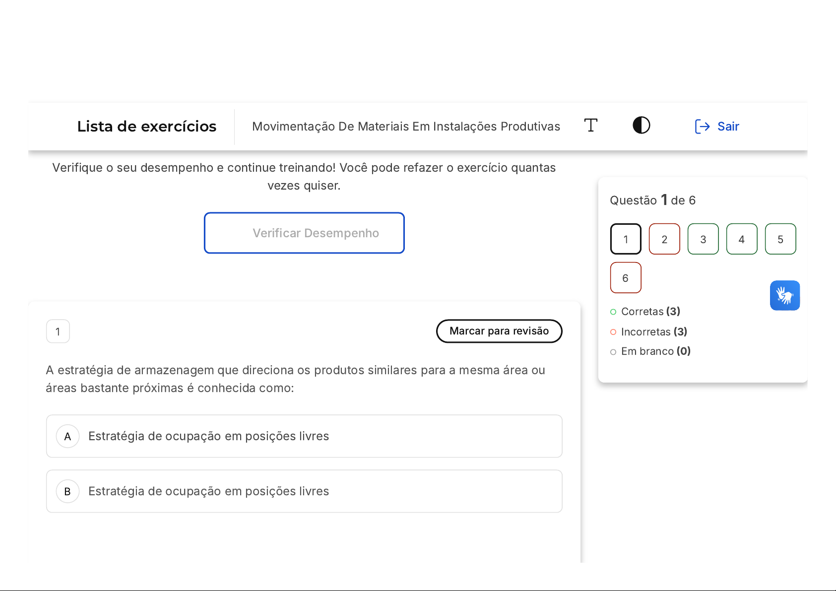 Você acertou 3 de 6 questões Verifique o seu desempenho e continue treinando! Você pode refazer o exercício quantas vezes quiser. Verificar Desempenho A B 1 Marcar para revisão A estratégia de armazenagem que direciona os produtos similares para a mesma área ou áreas bastante próximas é conhecida como: Estratégia de ocupação em posições livres Estratégia de ocupação em posições livres Questão 1 de 6 Corretas (3) Incorretas (3) Em branco (0) 1 2 3 4 5 6 Lista de exercícios Movimentação De Materiais Em Instalações Produtivas Sair C D E Estratégia de Rápida Movimentação Estratégia uniforme Estratégia de Zoneamento Resposta incorreta Opa! A alternativa correta é a letra E. Confira o gabarito comentado! Gabarito Comentado A alternativa correta é a "Estratégia de Zoneamento". Esta estratégia de armazenagem é utilizada para organizar os produtos similares em uma mesma área ou em áreas próximas. Isso facilita a localização e o manuseio dos produtos, otimizando o processo de armazenagem e distribuição. 2 Marcar para revisão Para a seleção do tipo de equipamento de movimentação de materiais a ser utilizado, é importante termos conhecimento sobre vários fatores. Abaixo estão listadas algumas afirmativas sobre estes fatores. Assinale a opção VERDADEIRA I- Conhecer os produtos a serem movimentados, suas dimensões, pesos, quantidades a serem movimentadas e A B C D E características é de extrema importância para a seleção do equipamento de movimentação a ser utilizado II- Conhecer o Fluxo Operacional é importante para fins de estudos de layout porém não interferem no processo de seleção dos equipamentos de movimentação de materiais. III- Obter informações de máquinas e equipamentos não é relevante para a seleção dos equipamentos de movimentação de materiais Apenas a afirmativa I está correta Apenas a afirmativa II está correta Apenas a afirmativa III está correta Apenas as afirmativas I e II estão corretas Apenas as afirmativas II e III estão corretas Resposta incorreta Opa! A alternativa correta é a letra A. Confira o gabarito comentado! Gabarito Comentado Para a seleção do tipo de equipamento de movimentação de materiais a ser utilizado, é importante termos conhecimento sobre vários fatores, como os produtos a serem A B C movimentados, suas dimensões, pesos, quantidades a serem movimentadas e características. Além disso, é importante conhecer o fluxo operacional e obter informações de máquinas e equipamentos. 3 Marcar para revisão Battesini define em sua obra uma série de princípios que devem ser adotados no desenvolvimento de projetos de sistemas logísticos, visando garantir um desempenho operacional eficiente do sistema como um todo. Qual princípio está relacionado à redução dos tempos de ocupação dos operadores com atividades improdutivas e à minimização do manuseio e movimentações de materiais? Acessibilidade. Ergonomia. Automação. D E Integração. Uso de espaço. Resposta correta Parabéns, você selecionou a alternativa correta. Confira o gabarito comentado! Gabarito Comentado O princípio relacionado à redução dos tempos de ocupação dos operadores e à minimização do manuseio e movimentações de materiais é a automação, como indicado por Battesini. BATTESINI, Marcelo. Projeto e leiaute de instalações produtivas. Curitiba: Intersaberes, 2016. 4 Marcar para revisão São atividades integrantes dos processos logísticos, exceto: A B C D E Compras Importação e Exportação Movimentação de Materiais Armazenamento de Materiais Pagamento de Fornecedores Resposta correta Parabéns, você selecionou a alternativa correta. Confira o gabarito comentado! Gabarito Comentado A alternativa correta é "Pagamento de Fornecedores". Isso ocorre porque, embora o pagamento de fornecedores seja uma atividade importante dentro de uma empresa, ela não é considerada parte dos processos logísticos. Os processos logísticos envolvem atividades como compras, importação e exportação, movimentação e armazenamento de materiais. Essas atividades estão diretamente relacionadas à A B C D E gestão do fluxo de bens, serviços e informações de uma empresa, enquanto o pagamento de fornecedores é uma atividade financeira. 5 Marcar para revisão Uma empresa deseja manter em estoque 300 unidades do produto A, cuja embalagem tem 40 cm x 40 cm x 50 cm, sendo embalados em lotes de 1000 unidades e 5000 unidades do produto B, que é embalado em Cargas Unitárias (1 m3) de 1000 unidades. A empresa decidiu estocar os produtos em estantes, com capacidade de 2 m3 por posição. Qual será o volume total de materiais a serem estocados? 15 m3 20 m3 29 m3 30 m3 35 m3 A B Resposta correta Parabéns, você selecionou a alternativa correta. Confira o gabarito comentado! Gabarito Comentado Para calcular o volume total de materiais a serem estocados, precisamos somar o volume de cada produto. O volume do produto A é calculado multiplicando-se as dimensões da embalagem, que resulta em 0,08 m3 para 300 unidades. O produto B é embalado em Cargas Unitárias de 1 m3 para 1000 unidades, portanto, para 5000 unidades, temos 5 m3. Somando os volumes dos produtos A e B, obtemos um total de 29 m3, que é o volume total de materiais a serem estocados. Portanto, a alternativa correta é a C: 29 m3. 6 Marcar para revisão O sistema onde o produto acabado, recebido dos fornecedores, é recebido na empresa e enviado diretamente ao cliente, é conhecido como: Pull System Efeito Chicote C D E Milk Run Cross Docking Transbordo Resposta incorreta Opa! A alternativa correta é a letra D. Confira o gabarito comentado! Gabarito Comentado O sistema conhecido como Cross Docking é o que se refere ao processo onde o produto acabado, recebido dos fornecedores, é recebido na empresa e enviado diretamente ao cliente. Esse sistema minimiza a necessidade de armazenamento, pois os produtos não ficam estocados na empresa, são envia