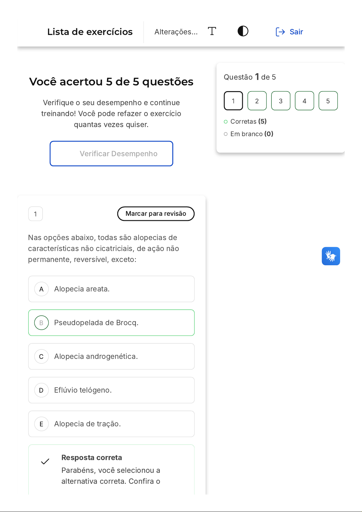Você acertou 5 de 5 questões Verifique o seu desempenho e continue treinando! Você pode refazer o exercício quantas vezes quiser. Verificar Desempenho A B C D E 1 Marcar para revisão Nas opções abaixo, todas são alopecias de características não cicatriciais, de ação não permanente, reversível, exceto: Alopecia areata. Pseudopelada de Brocq. Alopecia androgenética. Eflúvio telógeno. Alopecia de tração. Resposta correta Parabéns, você selecionou a alternativa correta. Confira o Questão 1 de 5 Corretas (5) Em branco (0) 1 2 3 4 5 Lista de exercícios Alterações… Sair A B C D E gabarito comentado! Gabarito Comentado A Pseudopelada de Brocq é uma exceção entre as opções apresentadas, pois é uma forma de alopecia cicatricial, ou seja, que causa danos permanentes aos folículos capilares, tornando a perda de cabelo irreversível. As demais opções - Alopecia areata, Alopecia androgenética, Eflúvio telógeno e Alopecia de tração - são tipos de alopecia não cicatricial, caracterizadas por uma perda de cabelo que pode ser revertida. 2 Marcar para revisão A alopecia androgenética atinge mais os homens do que as mulheres. Esse fato ocorre devido à presença específica no couro cabeludo feminino de uma enzima que contribui para minimizar o problema. Que enzima é essa? 5 Alfa Redutase. Diidrotestosterona. Aromatase. Progesterona. Tirosinase. A B C Resposta correta Parabéns, você selecionou a alternativa correta. Confira o gabarito comentado! Gabarito Comentado A enzima que contribui para minimizar a alopecia androgenética no couro cabeludo feminino é a Aromatase. Esta enzima é responsável pela conversão de andrógenos em estrogênios, o que ajuda a proteger o couro cabeludo feminino contra a alopecia androgenética, uma condição que é mais comum em homens devido à presença de níveis mais altos de andrógenos. 3 Marcar para revisão Tipo de calvície não cicatricial, de característica normalmente feminina, devido à ação do trauma físico provocado pelo efeito mecânico de puxar os cabelos para fazer penteados. Alopecia traumática acidental. Alopecia androgenética. Lúpus eritematoso. D E Alopecia areata multifocal. Eflúvio telógeno. Resposta correta Parabéns, você selecionou a alternativa correta. Confira o gabarito comentado! Gabarito Comentado O enunciado descreve um tipo de calvície não cicatricial, comum em mulheres, que ocorre devido ao trauma físico causado pelo ato de puxar os cabelos para fazer penteados. Essa descrição corresponde à Alopecia traumática acidental, que é a alternativa A. As outras opções listadas são outros tipos de condições capilares, mas não se encaixam na descrição dada no enunciado. 4 Marcar para revisão O uso prolongado de bonés e capacetes associado à lavagem dos cabelos com shampoos inadequados contribuem para a oleosidade excessiva do couro cabeludo, aumentando a queda capilar e contribuindo para aumento do quadro de: A B C D E Alopecia traumática. Alopecia total. Alopecia androgenética. Alopecia areata. Alopecia areata universal. Resposta correta Parabéns, você selecionou a alternativa correta. Confira o gabarito comentado! Gabarito Comentado A alternativa correta é a Alopecia androgenética. Este tipo de alopecia é caracterizado pela queda de cabelo causada por fatores genéticos e hormonais. O uso prolongado de bonés e capacetes, assim como a lavagem dos cabelos com shampoos inadequados, podem contribuir para a oleosidade excessiva do couro cabeludo, um dos fatores que pode agravar o quadro de Alopecia androgenética. 5 Marcar para revisão Seu acometimento ocorre pela presença de múltiplas placas de arreatas, que afetam não só A B C D E o couro cabeludo, mas outras regiões com pelos do corpo. Estamos falando de? Alopecia areata universal. Alopecia areata total. Alopecia areata. Alopecia areata clássica. Alopecia areata multifocal. Resposta correta Parabéns, você selecionou a alternativa correta. Confira o gabarito comentado! Gabarito Comentado A condição descrita no enunciado é a Alopecia areata multifocal. Esta é uma forma de alopecia areata que se caracteriza pela presença de múltiplas placas de arreatas, afetando não apenas o couro cabeludo, mas também outras regiões do corpo que possuem pelos. Diferentemente das outras formas de alopecia areata, a multifocal tem um alcance mais amplo, atingindo diversas áreas do corpo.