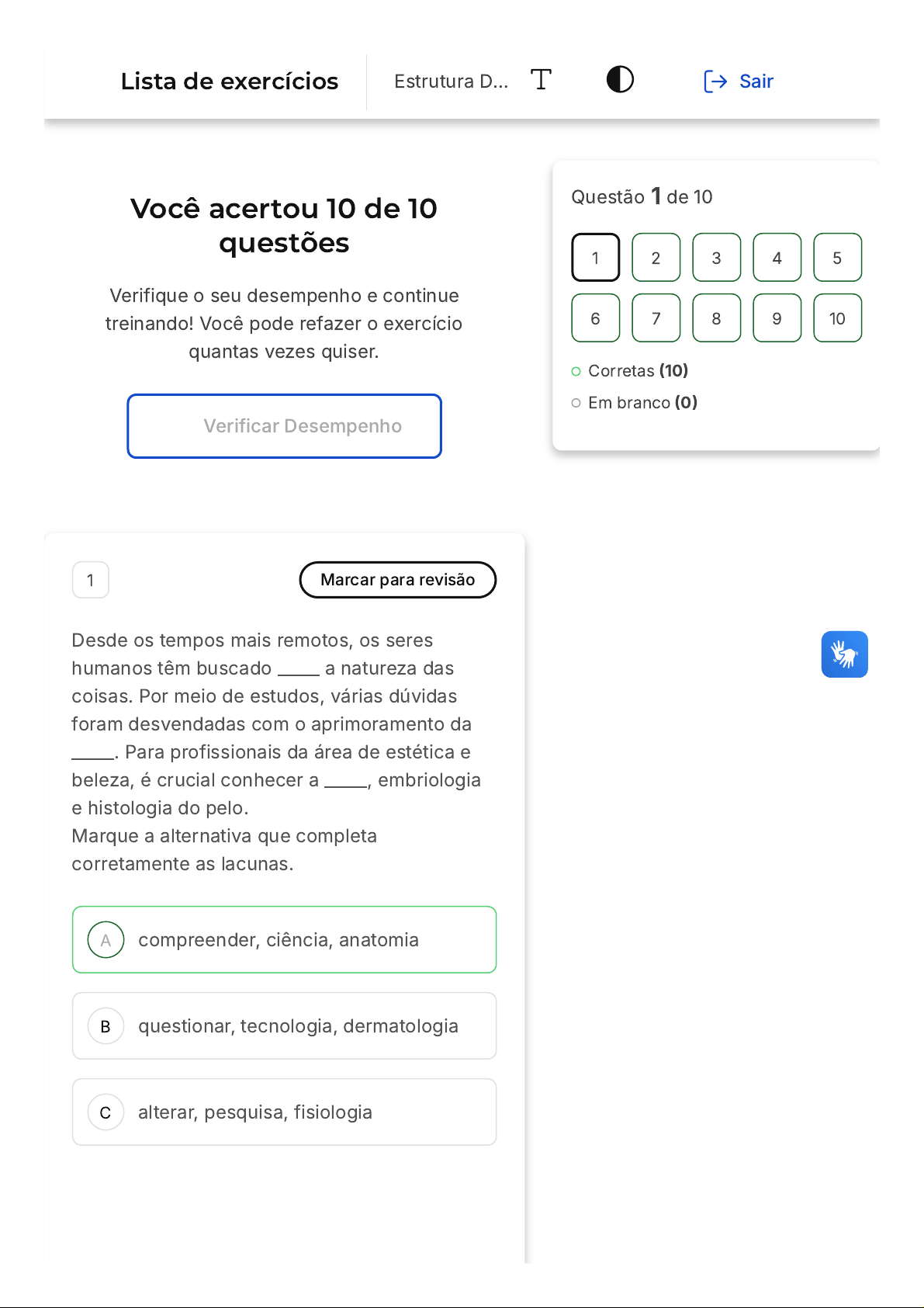 Você acertou 10 de 10 questões Verifique o seu desempenho e continue treinando! Você pode refazer o exercício quantas vezes quiser. Verificar Desempenho A B C 1 Marcar para revisão Desde os tempos mais remotos, os seres humanos têm buscado _____ a natureza das coisas. Por meio de estudos, várias dúvidas foram desvendadas com o aprimoramento da _____. Para profissionais da área de estética e beleza, é crucial conhecer a _____, embriologia e histologia do pelo. Marque a alternativa que completa corretamente as lacunas. compreender, ciência, anatomia questionar, tecnologia, dermatologia alterar, pesquisa, fisiologia Questão 1 de 10 Corretas (10) Em branco (0) 1 2 3 4 5 6 7 8 9 10 Lista de exercícios Estrutura D… Sair D E mudar, inovação, biologia estudar, medicina, química Resposta correta Parabéns, você selecionou a alternativa correta. Confira o gabarito comentado! Gabarito Comentado A compreensão da natureza das coisas tem sido uma busca contínua da humanidade desde tempos antigos. A ciência tem sido a principal ferramenta para desvendar muitas dúvidas relacionadas a este assunto. Para os profissionais que trabalham com estética e beleza, é essencial ter conhecimento sobre a anatomia, embriologia e histologia do pelo, visto que estas são áreas fundamentais para entender a estrutura e função do cabelo. 2 Marcar para revisão Juliana, uma especialista em cuidados com o cabelo, está se atualizando sobre disfunções capilares. Ela entende que, ao longo dos anos, a ciência avançou e muitas dúvidas sobre o cabelo foram esclarecidas. Marque a alternativa que apresenta a principal razão pela qual os profissionais da área capilar devem atualizar-se regularmente. A B C D E Para acompanhar as últimas tendências de moda em estilos de cabelo. Para garantir que eles estejam usando os produtos de cabelo mais recentes no mercado. Para aprimorar suas técnicas de corte e coloração. Para entender problemas capilares e suas soluções. Para aumentar sua clientela e sua reputação no mercado. Resposta correta Parabéns, você selecionou a alternativa correta. Confira o gabarito comentado! Gabarito Comentado A compreensão da anatomia, embriologia e histologia do pelo é vital para os profissionais da área capilar, pois fornece insights profundos sobre a estrutura, desenvolvimento e características do cabelo. Essa compreensão permite que os profissionais identifiquem e tratem eficazmente diversas disfunções capilares. Ao manter-se atualizado sobre esses tópicos, os profissionais podem oferecer os melhores cuidados e soluções para seus clientes. A B C D E 3 Marcar para revisão Sobre o pH do cabelo, assinale a alternativa incorreta: O pH é o parâmetro que determina a acidez ou alcalinidade de uma substância. O pH neutro é 7. O pH 2 é um pH ácido e tem o poder de abrir as cutículas do cabelo. A cutícula não se abre com pH alcalino acima de 10. Entender sobre acidez e alcalinidade são importantes para o profissional tricologista. Resposta correta Parabéns, você selecionou a alternativa correta. Confira o gabarito comentado! Gabarito Comentado A alternativa D está incorreta. Na verdade, a cutícula do cabelo pode se abrir com um pH alcalino acima de 10. O pH alcalino tem a capacidade de abrir as cutículas do cabelo, permitindo que os tratamentos capilares penetrem mais profundamente. Portanto, a afirmação de que a cutícula não A B C D E se abre com pH alcalino acima de 10 é falsa. 4 Marcar para revisão Ricardo, um estudante de tricologia, está curioso sobre a evolução do cabelo humano. Ele está explorando a relação entre embriologia e desenvolvimento capilar. Como a embriologia contribui para o entendimento do desenvolvimento capilar? Fornece informações sobre os padrões de substituição do vellugo por lanugo e da calvície relacionados à idade. Descreve a origem e formação dos folículos capilares durante o desenvolvimento e formação do lanugo. Explica os efeitos de produtos químicos no crescimento do cabelo e do surgimento do vellus. Detalha os métodos de estilização de cabelo ao longo dos séculos. Analisa o impacto da dieta no crescimento do cabelo. Resposta correta Parabéns, você selecionou a alternativa correta. Confira o A B C gabarito comentado! Gabarito Comentado A embriologia é o estudo do desenvolvimento de organismos desde a fertilização até o nascimento. No contexto do cabelo, a embriologia fornece insights valiosos sobre a origem e formação dos folículos capilares durante o desenvolvimento embrionário. Esse entendimento é fundamental para compreender o ciclo de vida do cabelo e suas fases de crescimento. 5 Marcar para revisão Fernanda, uma instrutora em uma escola de estética, está ensinando seus alunos sobre a importância da histologia no cuidado capilar. Por que o estudo da histologia é relevante para profissionais que trabalham com cuidados capilares? Porque ajuda na criação de novos estilos de penteado. Porque detalha a estrutura microscópica do cabelo e do couro cabeludo. Porque explica as preferências de estilo de cabelo em diferentes culturas. D E Porque mostra como fazer colorações de cabelo sem danificar o fio. Porque indica quais produtos capilares são mais rentáveis. Resposta correta Parabéns, você selecionou a alternativa correta. Confira o gabarito comentado! Gabarito Comentado A histologia é o estudo dos tecidos biológicos em um nível microscópico. Para profissionais de cuidados capilares, entender a histologia é crucial, pois fornece detalhes sobre a estrutura microscópica do cabelo e do couro cabeludo. Esse conhecimento permite uma compreensão mais profunda da saúde capilar, das possíveis disfunções e de como diferentes tratamentos e produtos podem afetar o cabelo. 6 Marcar para revisão Daniela, uma esteticista, está elaborando um novo tratamento capilar. Para isso, ela está estudando as propriedades físico-químicas do cabelo e sua definição. Consider
