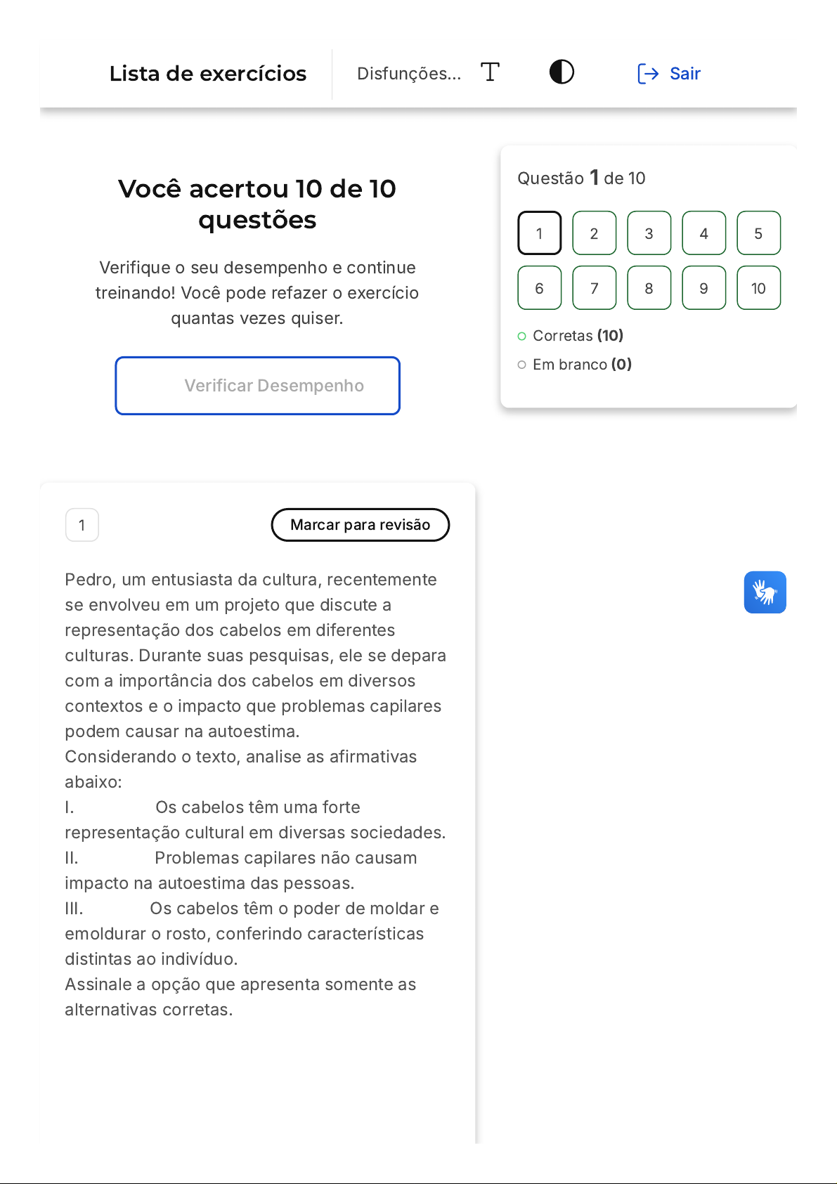 Você acertou 10 de 10 questões Verifique o seu desempenho e continue treinando! Você pode refazer o exercício quantas vezes quiser. Verificar Desempenho 1 Marcar para revisão Pedro, um entusiasta da cultura, recentemente se envolveu em um projeto que discute a representação dos cabelos em diferentes culturas. Durante suas pesquisas, ele se depara com a importância dos cabelos em diversos contextos e o impacto que problemas capilares podem causar na autoestima. Considerando o texto, analise as afirmativas abaixo: I. Os cabelos têm uma forte representação cultural em diversas sociedades. II. Problemas capilares não causam impacto na autoestima das pessoas. III. Os cabelos têm o poder de moldar e emoldurar o rosto, conferindo características distintas ao indivíduo. Assinale a opção que apresenta somente as alternativas corretas. Questão 1 de 10 Corretas (10) Em branco (0) 1 2 3 4 5 6 7 8 9 10 Lista de exercícios Disfunções… Sair A B C D E Apenas a afirmativa I está correta. Apenas a afirmativa II está correta. As afirmativas I e III estão corretas. Apenas a afirmativa III está correta. As afirmativas I e II estão corretas. Resposta correta Parabéns, você selecionou a alternativa correta. Confira o gabarito comentado! Gabarito Comentado A afirmativa I é verdadeira, pois os cabelos têm uma forte representação cultural em muitas sociedades ao redor do mundo. A afirmativa II é incorreta, uma vez que problemas capilares podem, de fato, afetar a autoestima de um indivíduo. A afirmativa III é correta, pois os cabelos têm o poder de moldar e emoldurar o rosto, dando uma identidade única ao indivíduo. 2 Marcar para revisão Muitas disfunções capilares são comuns na sociedade, levando a uma crescente demanda por tratamentos estéticos. Entretanto, é crucial diferenciar entre condições que podem ser A B C D E tratadas esteticamente e aquelas que necessitam de cuidados médicos. Por que é importante diferenciar entre condições capilares tratáveis esteticamente e aquelas que necessitam de cuidados médicos? Para determinar o preço do tratamento. Para escolher os produtos estéticos adequados. Para garantir a saúde e segurança do cliente e proporcionar cuidados adequados. Para promover tratamentos estéticos adicionais. Para avaliar a eficácia dos tratamentos estéticos oferecidos. Resposta correta Parabéns, você selecionou a alternativa correta. Confira o gabarito comentado! Gabarito Comentado A principal razão para diferenciar entre condições tratáveis esteticamente e aquelas que requerem intervenção médica é garantir a saúde e a segurança do cliente. Enquanto algumas condições capilares podem ser tratadas com procedimentos estéticos, outras podem necessitar de tratamentos médicos específicos. A B C D E Direcionar corretamente o cliente é essencial para seu bem-estar e saúde. 3 Marcar para revisão Patologia do couro cabeludo contagiosa, cujo acometimento inicia-se por pequenas lesões crateriformes em torno do óstio folicular, com mancha redonda, de cor rósea, podendo apresentar pequenas pústulas em sua borda. Tinha favosa. Tinha tonsurante. Tinea kérion. Dermatofitoses. Foliculite. Resposta correta Parabéns, você selecionou a alternativa correta. Confira o gabarito comentado! Gabarito Comentado A descrição da patologia do couro cabeludo apresentada no enunciado corresponde à Tinha favosa. Esta é uma infecção fúngica contagiosa que se caracteriza por pequenas lesões A B C D E crateriformes ao redor do óstio folicular, acompanhadas de uma mancha redonda de cor rósea e possíveis pequenas pústulas em sua borda. Portanto, a alternativa correta é a "A". 4 Marcar para revisão A terapia capilar é uma área em ascensão, dedicada a tratar e prevenir disfunções no couro cabeludo e nos fios. Terapeutas capilares utilizam uma variedade de recursos terapêuticos para melhorar a saúde capilar, proporcionando um aspecto mais saudável e ajudando os indivíduos a recuperar a confiança. Com base no estudo da terapia capilar, qual dos seguintes recursos pode ser considerado terapêutico? Utilização de produtos químicos para alisamento imediato. Aplicação regular de calor diretamente no couro cabeludo. Uso de shampoos e loções com ativos específicos. Corte frequente das pontas para estimular o crescimento capilar. Coloração frequente para esconder cabelos grisalhos. Resposta correta A B Parabéns, você selecionou a alternativa correta. Confira o gabarito comentado! Gabarito Comentado A alternativa correta enfatiza a importância de utilizar produtos com ativos específicos (como ácido salicílico, por exemplo) como um recurso terapêutico na promoção da saúde capilar. Ao contrário das outras opções, que podem causar danos ao couro cabeludo e aos fios, o uso de shampoos e loções com ativos específico para cada disfunção capilar é uma abordagem terapêutica que visa tratar ou prevenir esses casos. 5 Marcar para revisão Maria é uma jovem que sempre valorizou a aparência de seus cabelos. Recentemente, ela notou algumas alterações em sua estrutura capilar e está preocupada com possíveis disfunções capilares. Com base no estudo de caso e no conteúdo fornecido, qual das seguintes afirmações descreve a importância dos cabelos para o indivíduo? Os cabelos são meramente decorativos e não têm significado cultural ou pessoal. Os cabelos são importantes apenas para a aparência e não têm impacto na vida social de uma pessoa. C D E Os cabelos emolduram o rosto, representam o indivíduo e têm um impacto significativo na vida pessoal e social. Os cabelos são apenas uma parte do corpo e não têm representação cultural. A principal preocupação com os cabelos é manter a higiene, sem considerar aspectos estéticos. Resposta correta Parabéns, você selecionou a alternativa correta. Confira o gabarito comentado! Gabarito Comentado A importância dos cabelos vai além da estética. Eles emoldu