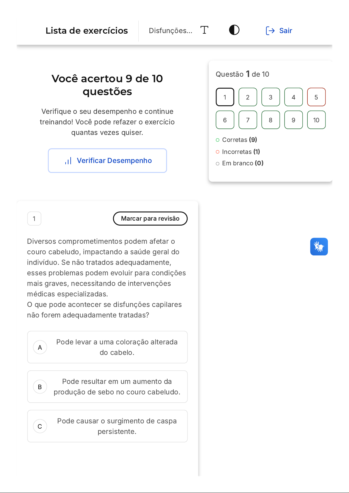 Você acertou 9 de 10 questões Verifique o seu desempenho e continue treinando! Você pode refazer o exercício quantas vezes quiser. Verificar Desempenho A B C 1 Marcar para revisão Diversos comprometimentos podem afetar o couro cabeludo, impactando a saúde geral do indivíduo. Se não tratados adequadamente, esses problemas podem evoluir para condições mais graves, necessitando de intervenções médicas especializadas. O que pode acontecer se disfunções capilares não forem adequadamente tratadas? Pode levar a uma coloração alterada do cabelo. Pode resultar em um aumento da produção de sebo no couro cabeludo. Pode causar o surgimento de caspa persistente. Questão 1 de 10 Corretas (9) Incorretas (1) Em branco (0) 1 2 3 4 5 6 7 8 9 10 Lista de exercícios Disfunções… Sair D E Pode evoluir para condições mais graves, necessitando de atenção médica. Pode causar um crescimento acelerado do cabelo. Resposta correta Parabéns, você selecionou a alternativa correta. Confira o gabarito comentado! Gabarito Comentado Disfunções capilares, quando não tratadas, podem se agravar com o tempo. Essa progressão pode resultar em condições mais sérias que vão além do escopo de tratamentos estéticos e necessitam de intervenções médicas para serem adequadamente tratadas. 2 Marcar para revisão Rafael, um homem de 30 anos, visita um dermatologista após notar inflamações mais graves na pele, acompanhadas da formação de furúnculos. Qual tipo de foliculite é mais provável que Rafael esteja enfrentando, considerando as manifestações mais graves e a presença de furúnculos? A B C D E Foliculite por vírus. Foliculite superficial. Foliculite por fungos. Foliculite profunda. Foliculite alérgica. Resposta correta Parabéns, você selecionou a alternativa correta. Confira o gabarito comentado! Gabarito Comentado A foliculite profunda ocorre quando o processo inflamatório é mais grave, afetando áreas mais profundas do folículo piloso. A presença de furúnculos é um indicativo de foliculite profunda. 3 Marcar para revisão Pedro, um entusiasta da cultura, recentemente se envolveu em um projeto que discute a representação dos cabelos em diferentes culturas. Durante suas pesquisas, ele se depara com a importância dos cabelos em diversos contextos e o impacto que problemas capilares podem causar na autoestima. A B C D E Considerando o texto, analise as afirmativas abaixo: I. Os cabelos têm uma forte representação cultural em diversas sociedades. II. Problemas capilares não causam impacto na autoestima das pessoas. III. Os cabelos têm o poder de moldar e emoldurar o rosto, conferindo características distintas ao indivíduo. Assinale a opção que apresenta somente as alternativas corretas. Apenas a afirmativa I está correta. Apenas a afirmativa II está correta. As afirmativas I e III estão corretas. Apenas a afirmativa III está correta. As afirmativas I e II estão corretas. Resposta correta Parabéns, você selecionou a alternativa correta. Confira o gabarito comentado! Gabarito Comentado A afirmativa I é verdadeira, pois os cabelos têm uma forte representação cultural em muitas sociedades ao redor do mundo. A afirmativa II é incorreta, uma vez que problemas capilares podem, de fato, afetar a autoestima de um indivíduo. A afirmativa III é correta, pois os cabelos têm o poder A B C D E de moldar e emoldurar o rosto, dando uma identidade única ao indivíduo. 4 Marcar para revisão O terapeuta capilar possui conhecimento especializado e utiliza de diversos recursos para promover a saúde capilar. Qual é a principal função de um terapeuta capilar? Cortar e estilizar cabelos de acordo com as tendências. Promover produtos de beleza e tratamentos estéticos. Aconselhar sobre mudanças de cor e estilo de cabelo. Tratar e prevenir disfunções capilares usando recursos terapêuticos. Ensinar técnicas de penteado e modelagem. Resposta correta Parabéns, você selecionou a alternativa correta. Confira o gabarito comentado! Gabarito Comentado O terapeuta capilar é especializado no tratamento e prevenção de disfunções no A B C D E couro cabeludo. Seu papel não se limita a estilizar ou promover produtos, mas sim a usar seu conhecimento para tratar problemas capilares e promover a saúde do couro cabeludo e dos fios. 5 Marcar para revisão Devido ao excesso de oleosidade presente no couro cabeludo, em razão de diversos fatores, pode ocasionar uma doença inflamatória crônica, associada ao fungo do gênero pityrosporum ovale, em regiões ricas em glândulas sebáceas. Marque a alternativa que caracteriza essa doença: Pediculose. Dermatite seborreica. Pitiríase capitis simplex. Alopecia areata. Foliculite. Resposta incorreta Opa! A alternativa correta é a letra B. Confira o gabarito comentado! Gabarito Comentado A B A causa da dermatite seborreica é desconhecida, mas se tem conhecimento de que ela se manifesta devido à hiperatividade das glândulas sebáceas associada ao fungo pityrosporum ovale, encontrado na região acometida. Ela também sofre influência hormonal; neste caso, do androgênio, que apresenta maior atividade após o período da puberdade. Além disso, pode ser encontrada em recém-nascidos, em virtude de o androgênio estar presente no leite materno. Um efeito que se deve observar na dermatite são os momentos de crise e calmaria, ou seja, momentos de piora e o desaparecimento momentâneo. 6 Marcar para revisão Maria é uma jovem que sempre valorizou a aparência de seus cabelos. Recentemente, ela notou algumas alterações em sua estrutura capilar e está preocupada com possíveis disfunções capilares. Com base no estudo de caso e no conteúdo fornecido, qual das seguintes afirmações descreve a importância dos cabelos para o indivíduo? Os cabelos são meramente decorativos e não têm significado cultural ou pessoal. Os cabelos são importantes apenas para a aparência e não têm impacto na vida social de uma pessoa. C 