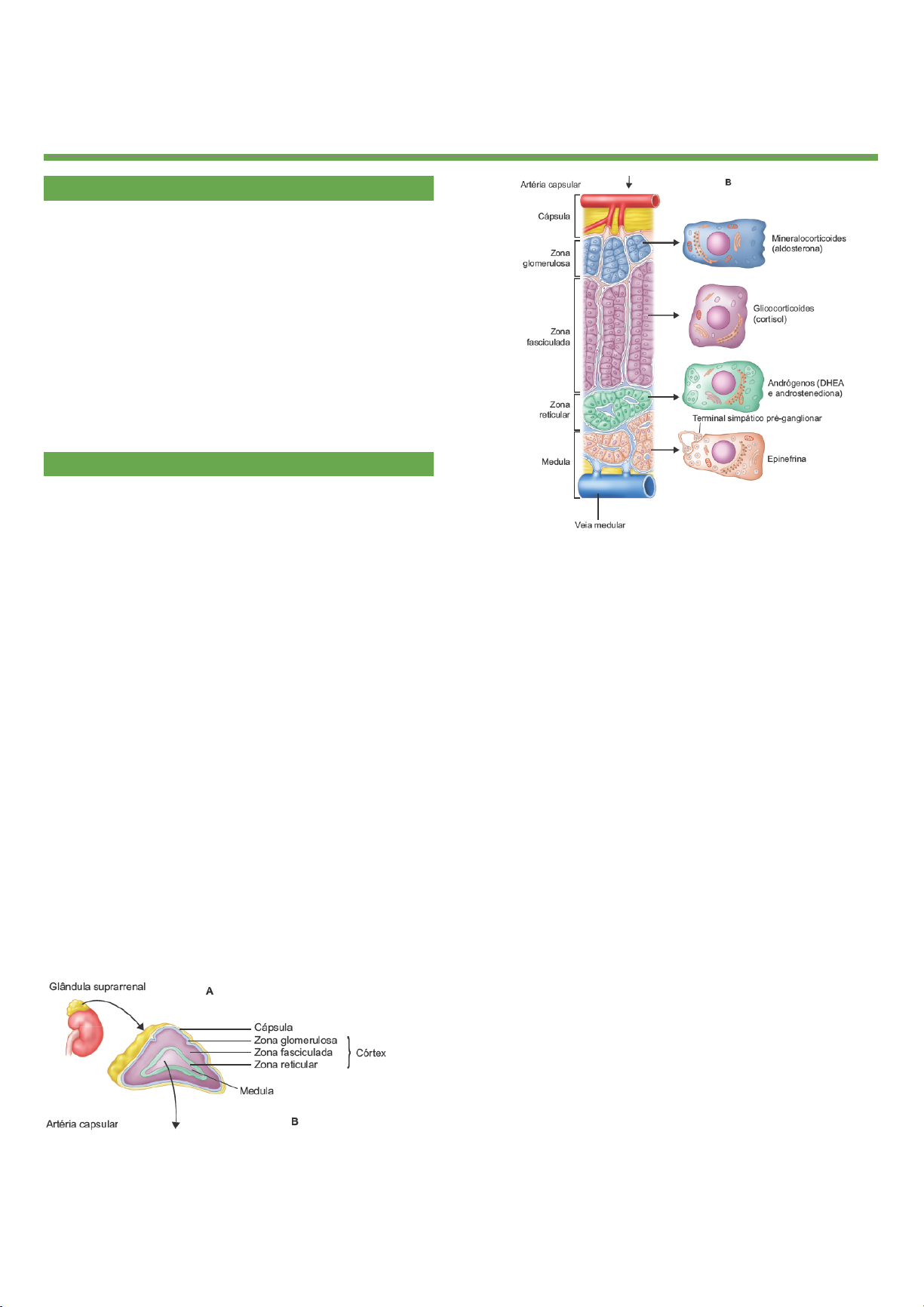 Maria Eduarda Faustino Turma LX FISIOLOGIA DA GLÂNDULA SUPRARRENAL OBJETIVOS DE APRENDIZAGEM ✓Conhecer os hormônios esteróides produzidos no córtex das glândulas suprarrenais a partir do colesterol; ✓Conhecer o eixo hipotálamo-hipófise-suprarrenal; ✓ Compreender: os sinais para a produção; os mecanismos que controlam a secreção, e as ações celulares dos hormônios produzidos no córtex das glândulas suprarrenais. ADRENAIS Localizadas acima dos rins, assim sua denominação, também, de glândulas suprarrenais. Cada glândula é revestida por uma cápsula de tecido conjuntivo denso e apresenta uma região interna, o córtex e outra interna, a medula. O córtex suprarrenal deriva de células mesenquimais ligadas à cavidade celômica. A suprarrenal do adulto se diferencia em: - Zona glomerulosa: síntese de mineralocorticóides. - Zona fasciculada:(intermediária), síntese de glicocorticóides. - Zona reticular: síntese de esteróides C19, andrógenos e hormônios sexuais. A região de medula possui células cromafins que produzem epinefrina e norepinefrina. As moléculas originadas são extremamente parecidas. O precursor para todos os hormônios adrenocorticais é o colesterol, que pode ser sintetizado a partir da acetilcoenzima A. A maior fonte do colesterol para a esteroidogênese é o colesterol transportado no plasma pelas células adrenocorticais por meio de receptores específicos de LDL presentes na membrana celular. VIAS PARA A SÍNTESE DOS HORMÔNIOS ESTERÓIDES DO CÓRTEX DAS SUPRARRENAIS A partir do colesterol, tem-se as reações responsáveis pela síntese de aldosterona, cortisol e androgênios. As reações se diferem de acordo com o tipo de substância produzida, porém, qualquer um dos hormônios parte de uma molécula em comum: pregnenolona. Além disso, todos partem de um estímulo em comum: o hormônio ACTH. A cascata de síntese de cada hormônio apresenta enzimas específicas, sendo as principais: Maria Eduarda Faustino Turma LX - 21-hidroxilase: para a formação de aldosterona e cortisol - aromatase: para a formação dos andrógenos HORMÔNIOS ADRENOCORTICAIS Os hormônios adrenocorticais podem ser de três principais tipos: glicocorticóides, mineralocorticóides e androgênios. As moléculas originadas tem poucas diferenças bioquímicas, sendo extremamente parecidas, portanto, conseguem se encaixar em diferentes receptores com vários sítios capazes de produzir reação para esses hormônios. - O cortisol pode ocupar o receptor de aldosterona, causando um efeito chamado de cruzado. GLICOCORTICÓIDES Atuam sobre o metabolismo de carboidratos, lipídeos e proteínas. O cortisol é o principal glicocorticóide humano, mas existem outros como a cortisona e a prednisona. O ACTH é o principal hormônio estimulador da síntese e secreção do cortisol. MINERALOCORTICÓIDES O principal é a aldosterona. Atuam no metabolismo de eletrólitos, especialmente sódio e potássio, e no equilíbrio químico. A produção é controlada principalmente, pelas concentrações de angiotensina II e de potássio no líquido extracelular. ANDROGÊNIO Desidroepiandrosterona (DHEA) e Androstenediona: precursores de hormônios sexuais, principalmente masculinos. E quantidades mínimas de progesterona e estrogênio, hormônios femininos. O ACTH regula a secreção, no entanto, os mecanismos do controle ainda não estão completamente elucidados. CORTISOL REGULAÇÃO DA SECREÇÃO O ritmo circadiano do glicocorticóide é caracterizado por um pico que ocorre no horário ou pouco antes do despertar, coincidindo com o início de atividades e com o declínio no restante das 24 h. Assim, no homem, as concentrações basais de ACTH e cortisol são mais elevadas pela manhã (das 6 às 9 h) com queda progressiva ao longo do dia e nadir noturno (das 23 às 3 h). O estresse não faz a adrenal liberar o cortisol diretamente. Ele ativa primeiro o eixo hipotálamo–hipófise–adrenal (HHA): Estresse → hipotálamo libera CRH CRH → hipófise libera ACTH ACTH → adrenal produz e libera cortisol Maria Eduarda Faustino Turma LX Ou seja, o estresse aumenta o cortisol de forma indireta, passando por essas três etapas antes de chegar à adrenal. O cortisol exerce feedback negativo sobre o eixo hipotálamo-hipófise e adrenal. Quando seus níveis sanguíneos aumentam, ele sinaliza ao hipotálamo para diminuir a liberação de CRH e, consequentemente, a hipófise reduz a liberação de ACTH. Com menos ACTH estimulando a adrenal, a produção de cortisol cai, mantendo o equilíbrio hormonal. Situações que causam estresse: traumatismo, infecção, calor ou frio intenso, injeção de noradrenalina e de outros fármacos, cirurgia, injeção de substâncias necrosantes sob a pele. Antes do ACTH ser liberado, existe um precursor chamado pró-opiomelanocortina (POMC), que é clivado para formar hormônios peptídicos menores, com formação de ACTH, hormonios melanocito-estimulantes (MSH α, β e γ) e β-endorfina. A produção do POMC não age somente para o ACTH, como também para a síntese de melanina, resposta imune e diminuição da ingestão alimentar. A administração de cortisol sintético desequilibra a alça de retroalimentação negativa da liberação de cortisol. Isso inibe a produção de POMC, não só de ACTH. MODULAÇÃO DA AÇÃO DO CORTISOL Regulada pela enzima 11β-hidroxiesteróide desidrogenase (11β-HSD). Existem mecanismos fisiológicos que impedem o cortisol a desempenhar o efeito mineralocorticoide. Nos tecidos que possuem receptores de mineralocorticoide (como rim, cólon e glândulas salivares), a enzima 11β-HSD2 transforma o cortisol ativo em cortisona inativa, impedindo que o cortisol ocupe esses receptores, que devem responder principalmente à aldosterona. Já em outros tecidos, como fígado, pele, cérebro, tecido adiposo e placenta, a enzima 11β-HSD1 faz o contrário: converte cortisona inativa de volta em cortisol ativo, permitindo que o hormô