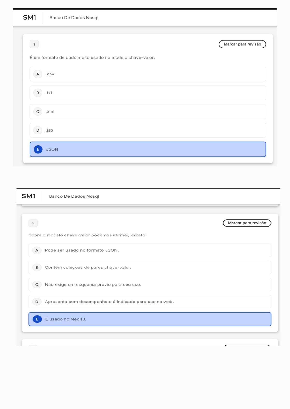 SM1 Banco De Dados Nosql 1 Marcar para revisão É um formato de dado muito usado no modelo chave-valor: A .CSV B .txt c .xml D .jsp E JSON SM1 Banco De Dados Nosql 2 Marcar para revisão Sobre o modelo chave-valor podemos afirmar, exceto: A Pode ser usado no formato JSON. B Contém coleções de pares chave-valor. Não exige um esquema prévio para seu uso. D Apresenta bom desempenho e é indicado para uso na web. E É usado no Neo4J.SM1 Banco De Dados Nosql D Apresenta bom desempenho e é indicado para uso na web. E É usado no Neo4J. 3 Marcar para revisão Os bancos de dados orientados a grafos são uma poderosa ferramenta para lidar com dados altamente relacionados e interconectados, oferecendo flexibilidade, desempenho e escalabilidade para uma variedade de aplicações e casos de uso. É um exemplo de um SGBD orientado a grafos: A MONGODB. B COUCHDB. NEO4J. SM1 Banco De Dados Nosql D MARIADB. E MYSQL. 4 Marcar para revisão Quanto aos tipos de dados, que abrangem dados estruturados, semiestruturados e não estruturados, qual das seguintes descrições melhor corresponde aos dados semiestruturados? A Dados organizados em tabelas com formato fixo e campos atômicos B Dados irregulares e incompletos, cuja estrutura pode variar, como arquivos XML. Dados sem formato pré-definido, como imagens, vídeos e mensagens em redes sociais. D Dados armazenados em bancos de dados relacionais tradicionais.5 Marcar para revisão Ao longo da evolução dos modelos de bancos de dados, diversos formatos surgiram para atender necessidades específicas. Considerando essa evolução, qual das características abaixo está associada ao modelo relacional? A Estrutura hierárquica rígida com registros interligados por ponteiros. Uso de tabelas com atributos atômicos e suporte a propriedades ACID. c Armazenamento baseado em documentos flexíveis e escalonamento horizontal. D Organização de dados em grafos para modelar relacionamentos complexos E Ausência de esquema pré-definido e uso exclusivo de linguagens não-SQL SM1 Banco De Dados Nosql 6 Marcar para revisão Considerando o controle transacional em bancos de dados relacionais e NoSQL, qual das afirmações abaixo apresenta corretamente a diferença principal entre esses dois modelos? A Ambos seguem rigorosamente as propriedades ACID para garantir consistência. B Bancos relacionais adotam o Teorema CAP, enquanto NoSQL seguem propriedades ACID NoSQL priorizam a consistência e disponibilidade seguindo o Teorema CAP, enquanto relacionais seguem propriedades ACID D Bancos relacionais não possuem controle de transações, enquanto NoSQL têm controle rigoroso E NoSQL não oferecem nenhum mecanismo para controle de transaçõesSM1 Banco De Dados Nosql 7 Marcar para revisão Sobre a utilização do modelo NoSQL chave-valor, qual das alternativas representa um desafio que o desenvolvedor deve considerar ao optar por essa tecnologia? A necessidade de codificar rotinas para controle de transações e tolerância a falhas, pois modelo A não oferece suporte ACID completo B A impossibilidade de realizar consultas baseadas em partes específicas das chaves armazenadas. c A obrigatoriedade de definir um esquema rígido para garantir a consistência dos dados. D A limitação no uso de dados do tipo JSON para o armazenamento dos valores. E A ausência de horizontal para grandes volumes de dados. SM1 Banco De Dados Nosql D A limitação no uso de dados do tipo JSON para armazenamento dos valores. E A ausência de horizontal para grandes volumes de dados. 8 Marcar para revisão Em bancos de dados NoSQL chave-valor, quando se utiliza a extensão HSTORE do PostgreSQL, qual das afirmações abaixo descreve corretamente uma vantagem dessa tecnologia? A Permite armazenar os dados em colunas rígidas, com tipos de dados fixos e predefinidos. Facilita de atributos flexíveis e sem esquema, permitindo pares chave-valor dentro de uma única coluna c Impede a escalabilidade horizontal devido à limitação do formato relacional. D Exige a definição da estrutura exata dos dados antes da inserção. E Não suporta a manipulação de dados em formato JSON.SM1 Banco De Dados Nosql 9 Marcar para revisão Considere o uso do tipo de dado JSONB no PostgreSQL. Qual das alternativas apresenta corretamente uma vantagem significativa desse formato em comparação ao tipo JSON? A Permite compressão de dados binários na criação de índices GIN. B Dispensa o uso de conversão para texto em consultas. Possui melhor desempenho para leitura e manipulação, pois permite indexação eficiente. D Não exige validação da estrutura dos dados ao armazenar. E Substitui o uso de arrays por objetos aninhados em formato XML. SM1 Banco De Dados Nosql 10 Marcar para revisão c Para verificar os dados presentes em um campo JSONB com melhor legibilidade, é possível utilizar uma função que exibe os dados formatados e identados. Qual comando abaixo realiza essa tarefa em uma tabela filmes? Q A SELECT dados FROM filmes; B SELECT jsonb_array_elements(dados) FROM filmes; c SELECT json_each_text(dados) FROM filmes; D SELECT jsonb_format(dados) FROM filmes; E SELECT jsonb_pretty(dados) FROM filmes;