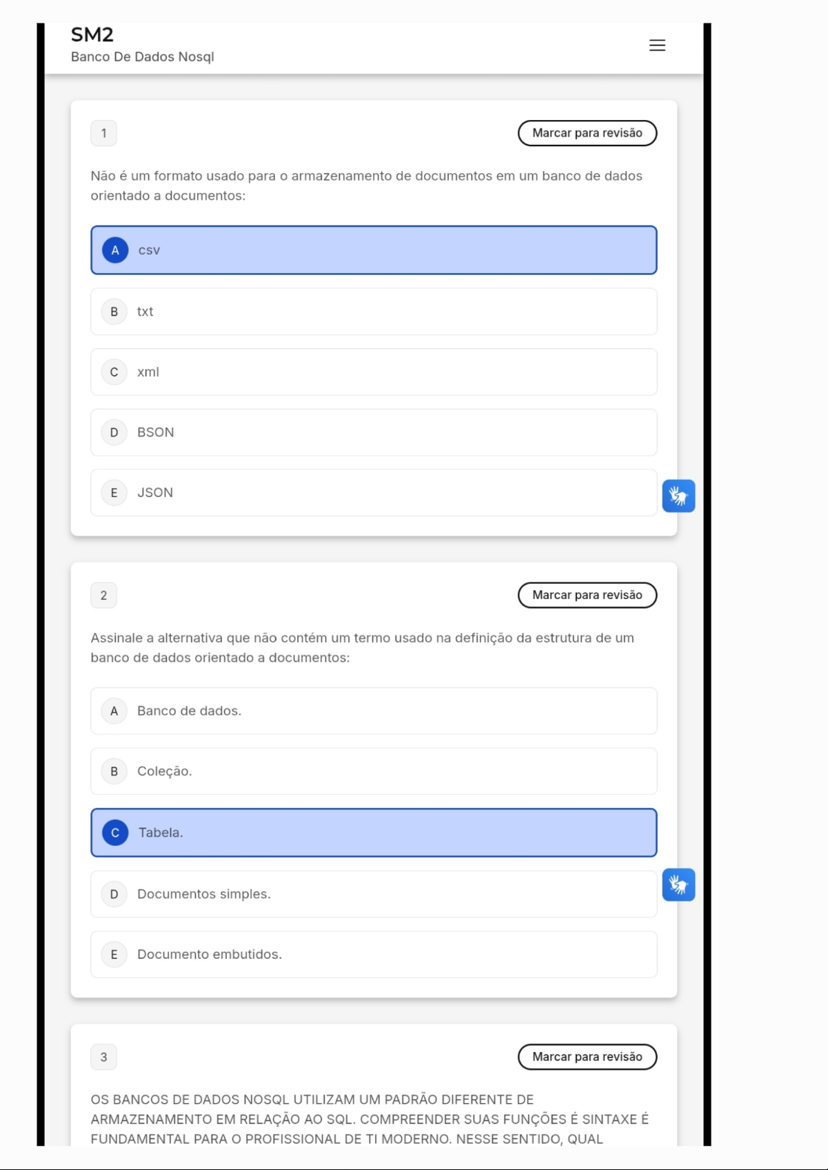 SM2 Banco De Dados Nosql 1 Marcar para revisão Não é um formato usado para o armazenamento de documentos em um banco de dados orientado a documentos: A CSV B txt c xml D BSON E JSON 2 Marcar para revisão Assinale a alternativa que não contém um termo usado na definição da estrutura de um banco de dados orientado a documentos: A Banco de dados. Coleção. Tabela. D Documentos simples. E Documento embutidos. 3 Marcar para revisão BANCOS DE DADOS NOSQL UTILIZAM UM PADRÃO DIFERENTE DE EM RELAÇÃO SQL. COMPREENDER SUAS FUNÇÕES É SINTAXE É FUNDAMENTAL PARA O PROFISSIONAL DE TI MODERNO. NESSE SENTIDO, QUAL3 Marcar para revisão BANCOS DE DADOS NOSQL UTILIZAM UM PADRÃO DIFERENTE DE ARMAZENAMENTO EM RELAÇÃO SQL. COMPREENDER SUAS FUNÇÕES É SINTAXE É FUNDAMENTAL PARA PROFISSIONAL DE TI MODERNO. NESSE SENTIDO, QUAL FUNÇÃO É RESPONSÁVEL POR CRIAR UM OBJETO JSON A PARTIR DE UMA LISTA DE ARGUMENTOS VARIADOS. A JSONB_PRETTY(). JSON_AGG(). c JSONB_CTE(). D E JSONB_AGG(). 4 Marcar para revisão Como é chamada a linguagem de consultas do MongoDB? A DMLMongoDB. MongoSQL. MQL. D MSQL. E SQL. 5 Marcar para revisão É um tipo de chave usada pelo Cassandra para facilitar a distribuição de dados pelos clusters: A Chave secundária.5 Marcar para revisão É um tipo de chave usada pelo Cassandra para facilitar a distribuição de dados pelos clusters: A Chave secundária. Chave de clusters. Chave de partição. D Chave composta. E Chave primária. 6 Marcar para revisão No modelo de dados em grafos, relacionamento é: A a aresta. vértice. c a propriedade. D o nó. E a associação.E a associação. 7 Marcar para revisão Assinale a alternativa que indica erradamente um uso do modelo colunar e do relacional : A o relacional é indicado para aplicações transacionais por conta do controle ACID. o colunar foi projetado para uso em sistemas que necessitam de controle transacional. c o colunar organiza os dados em conjuntos de colunas. D o colunar não tem integridade referencial. E o relacional organiza os dados em linhas. 8 Marcar para revisão Um contêiner no Cassandra equivale a o que no relacional? A schema. coluna. c tabela. D linha. E banco de dados. 9 Marcar para revisão Você está trabalhando com um banco de dados Neo4j que armazena informações sobre funcionários em nós com o rótulo Funcionário, e cada nó possui propriedades como nome, cargo e salário. Qual comando Cypher retorna nome e salário de todos os funcionários que ganham mais que 5000, ordenados do maior para o menor salário?9 Marcar para revisão Você está trabalhando com um banco de dados Neo4j que armazena informações sobre funcionários em nós com o rótulo Funcionário, e cada nó possui propriedades como nome, cargo e salário. Qual comando Cypher retorna nome e salário de todos os funcionários que ganham mais que 5000, ordenados do maior para menor salário? MATCH (f:Funcionario) WHERE f.salario 5000 MATCH (f:Funcionario) WHERE f.salario > 5000 RETURN f.nome, f.salario ORDER BY f.salario DESC MATCH (f:Funcionario) WHERE f.salario >= 5000 D RETURN f.nome, f.salario ORDER BY f.nome MATCH (f:Funcionario {salario: 5000}) E RETURN f.nome, f.salario 10 Marcar para revisão A linguagem Cypher permite atualizar propriedades de nós em bancos de dados orientados a grafos. Considerando a necessidade de alterar o salário de uma funcionária chamada Lia para R$ 4.500,00, qual comando está correto para realizar essa atualização? A MATCH (p:Funcionario {nome: 'Lia'}) SET p.salario = 4500 RETURN p CREATE (p:Funcionario {nome: 'Lia', salario: 4500}) RETURN p C MATCH (p:Funcionario {nome: 'Lia'}) DELETE p.salario RETURN p D UPDATE (p:Funcionario) SET salario = 4500 WHERE nome = 'Lia' RETURN p E REMOVE (p:Funcionario {nome: 'Lia'}) SET salario = 4500 RETURN p