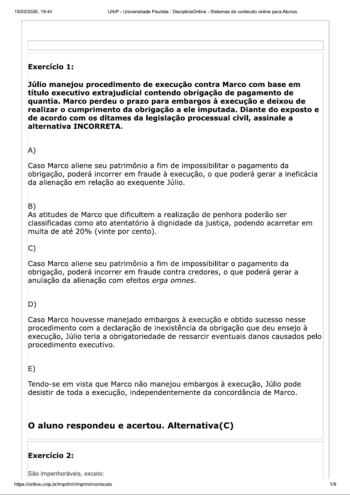 15/03/2026, 19:44 UNIP Universidade Paulista DisciplinaOnline Sistemas de conteúdo online para Alunos. Exercício 1: Júlio manejou procedimento de execução contra Marco com base em título executivo extrajudicial contendo obrigação de pagamento de quantia. Marco perdeu prazo para embargos à execução e deixou de realizar cumprimento da obrigação ele imputada. Diante do exposto e de acordo com os ditames da legislação processual civil, assinale a alternativa INCORRETA. A) Caso Marco aliene seu patrimônio a fim de impossibilitar pagamento da obrigação, poderá incorrer em fraude à execução, que poderá gerar a ineficácia da alienação em relação ao exequente Júlio. B) As atitudes de Marco que dificultem a realização de penhora poderão ser classificadas como ato atentatório à dignidade da justiça, podendo acarretar em multa de até 20% (vinte por cento). C) Caso Marco aliene seu patrimônio a fim de impossibilitar pagamento da obrigação, poderá incorrer em fraude contra credores, que poderá gerar a anulação da alienação com efeitos erga omnes. D) Caso Marco houvesse manejado embargos à execução e obtido sucesso nesse procedimento com a declaração de inexistência da obrigação que deu ensejo à execução, Júlio teria a obrigatoriedade de ressarcir eventuais danos causados pelo procedimento executivo. E) Tendo-se em vista que Marco não manejou embargos à execução, Júlio pode desistir de toda a execução, independentemente da concordância de Marco. aluno respondeu e acertou. Alternativa(C) Exercício 2: São impenhoráveis, exceto: 1/915/03/2026, 19:44 UNIP Universidade Paulista : DisciplinaOnline Sistemas de conteúdo online para Alunos. A) os bens inalienáveis e os declarados, por ato voluntário, não sujeitos à execução. B) os vestuários, bem como os pertences de uso pessoal do executado, salvo se de elevado valor. C) seguro de vida. D) a quantia depositada em caderneta de poupança, independentemente do valor. E) os livros, as máquinas, as ferramentas, os utensílios, os instrumentos ou outros bens móveis necessários ou úteis ao exercício da profissão do executado. aluno respondeu e acertou. Alternativa(D) Exercício 3: Com relação a responsabilidade patrimonial tratada no CPC, são sujeitos à execução os bens, exceto: A) do sucessor a título singular, tratando-se de execução fundada em direito real ou obrigação reipersecutória; B) do cônjuge ou companheiro, nos casos em que seus bens próprios ou de sua meação respondem pela dívida; C) do sócio, em qualquer hipótese; D) do devedor, ainda que em poder de terceiros; 2/915/03/2026, 19:44 UNIP Universidade Paulista : DisciplinaOnline Sistemas de conteúdo online para Alunos. E) do responsável, nos casos de desconsideração da personalidade jurídica. aluno respondeu e acertou. Alternativa(C) Exercício 4: Conforme previsto no CPC, assinale a alterativa incorreta com relação aos legitimados ativos secundários para promover a execução forçada. A) os herdeiros ou sucessores do credor; B) Ministério Público; C) o cessionário; D) sub-rogado; E) n.d.a. aluno respondeu e acertou. Alternativa(B) Exercício 5: De acordo com disposto no CPC, considera-se atentatório à dignidade da Justiça ato do executado que A) frauda a execução. 3/915/03/2026, 19:44 UNIP Universidade Paulista : DisciplinaOnline Sistemas de conteúdo online para Alunos. B) deixa de contestar a ação. C) não apresenta embargos à execução. D) resiste, de forma justificada, a ordens judiciais. E) n.d.a. aluno respondeu e acertou. Alternativa(A) Exercício 6: Segundo o CPC, considera-se em fraude de execução a alienação ou oneração de bens quando: A) bem objeto de alienação vier a sofrer B) sobre eles pender ação fundada em direito real ou com pretensão reipersecutória. C) não houver a devida anuência do cônjuge do alienante, denominada de vênia conjugal. D) houver alienação de bens imóveis durante a pendência de execução fiscal ajuizada contra alienante, independente do valor do bem e da existência de bens outros capazes de garantir débito. E) houver alienação de bens imóveis durante a pendência de processo administrativo fiscal ajuizado contra o alienante, independente do valor do bem e da existência de bens outros capazes de garantir 0 débito. 4/915/03/2026, 19:44 UNIP Universidade Paulista : DisciplinaOnline Sistemas de conteúdo online para Alunos. aluno respondeu e acertou. Alternativa(B) Exercício 7: A respeito do processo de execução, assinale a afirmativa incorreta. A) A escritura pública ou outro documento público assinado pelo devedor, o documento particular assinado pelo devedor e por 2 (duas) testemunhas e o contrato de seguro de vida em caso de morte são títulos executivos extrajudiciais. B) exequente pode cumular várias execuções, ainda que fundadas em títulos diferentes, quando o executado for o mesmo e desde que, para todas elas, seja competente o mesmo juízo e idêntico o procedimento. C) A necessidade de simples operações aritméticas para apurar o crédito exequendo retira a liquidez da obrigação constante do título. D) A existência de título executivo extrajudicial impede a parte de optar pelo processo de conhecimento, a fim de obter título executivo judicial. E) Considera-se atentatória à dignidade da Justiça a conduta comissiva ou omissiva do executado que, intimado, não indica ao juiz quais são e onde estão os bens sujeitos à penhora e os respectivos valores, nem exibe prova de sua propriedade. aluno respondeu e acertou. Alternativa(D) Exercício 8: Tem legitimidade ativa para ajuizar ação de execução, EXCETO: A) Ministério Público, nos casos previstos em lei. 5/915/03/2026, 19:44 UNIP Universidade Paulista : DisciplinaOnline Sistemas de conteúdo online para Alunos. B) espólio, herdeiros ou sucessores do credor, sempre que, por morte deste, lhes for transmitido o direito resultante do título executi