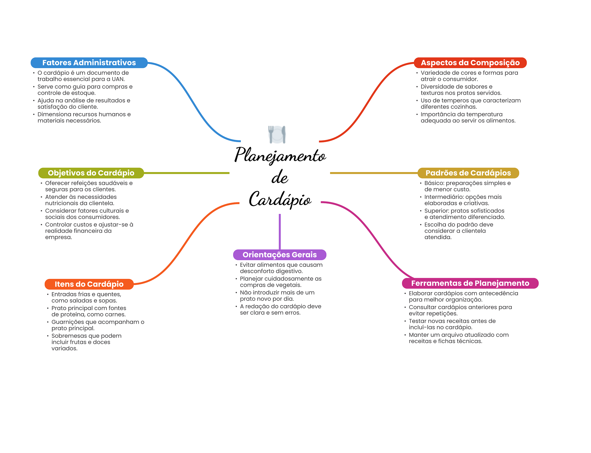 Fatores Administrativos Aspectos da Composição cardápio é um documento de Variedade de cores e formas para trabalho essencial para a UAN. atrair consumidor. Serve como guia para compras e Diversidade de sabores e controle de estoque. texturas nos pratos servidos. Ajuda na análise de resultados e Uso de temperos que caracterizam satisfação do cliente. diferentes cozinhas. Dimensiona recursos humanos e Importância da temperatura materiais necessários. adequada ao servir alimentos. Planejamento Objetivos do Cardápio de Padrões de Cardápios Oferecer refeições saudáveis e Básico: preparações simples e seguras para OS clientes. de menor custo. Atender às necessidades Cardápio Intermediário: opções mais nutricionais da clientela. elaboradas e criativas. Considerar fatores culturais e Superior: pratos sofisticados sociais dos consumidores. e atendimento diferenciado. Controlar custos e ajustar-se à Escolha do padrão deve realidade financeira da considerar a clientela empresa. atendida. Orientações Gerais Evitar alimentos que causam desconforto digestivo. Planejar cuidadosamente as Itens do Cardápio compras de vegetais. Ferramentas de Planejamento Entradas frias e quentes, Não introduzir mais de um Elaborar cardápios com antecedência como saladas e sopas. prato novo por dia. para melhor organização. Prato principal com fontes A redação do cardápio deve Consultar cardápios anteriores para de proteína, como carnes. ser clara e sem erros. evitar repetições. Guarnições que acompanham Testar novas receitas antes de prato principal. incluí-las no cardápio. Sobremesas que podem Manter um arquivo atualizado com incluir frutas e doces receitas e fichas técnicas. variados.