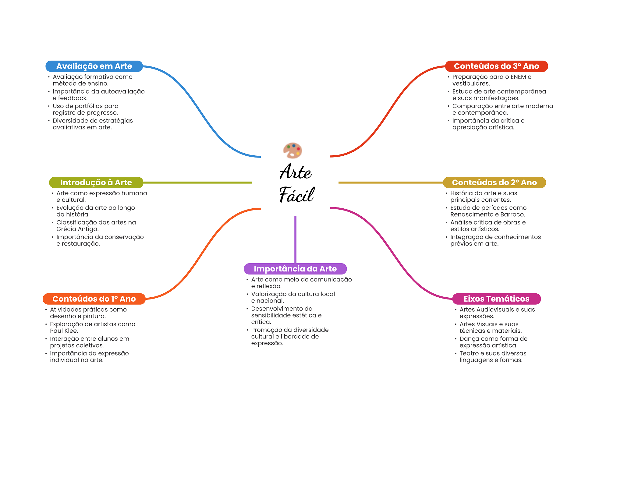 Avaliação em Arte Conteúdos do 3° Ano Avaliação formativa como Preparação para o ENEM e método de ensino. vestibulares. Importância da autoavaliação Estudo de arte contemporânea e feedback. e suas manifestações. Uso de portfólios para Comparação entre arte moderna registro de progresso. e contemporânea. Diversidade de estratégias Importância da crítica e avaliativas em arte. apreciação artística. Arte Introdução à Arte Conteúdos do 2° Ano Arte como expressão humana e cultural. Fácil História da arte e suas principais correntes. Evolução da arte ao longo Estudo de períodos como da história. Renascimento e Barroco. Classificação das artes na Análise crítica de obras e Grécia Antiga. estilos artísticos. Importância da conservação Integração de conhecimentos e restauração. prévios em arte. Importância da Arte Arte como meio de comunicação e reflexão. Valorização da cultura local Conteúdos do 1° Ano e nacional. Eixos Temáticos Atividades práticas como da Artes Audiovisuais e suas desenho e pintura. sensibilidade estética e expressões. Exploração de artistas como crítica. Artes Visuais e suas Paul Klee. Promoção da diversidade técnicas e materiais. Interação entre alunos em cultural e liberdade de Dança como forma de projetos coletivos. expressão. expressão artística. Importância da expressão Teatro e suas diversas individual na arte. linguagens e formas.