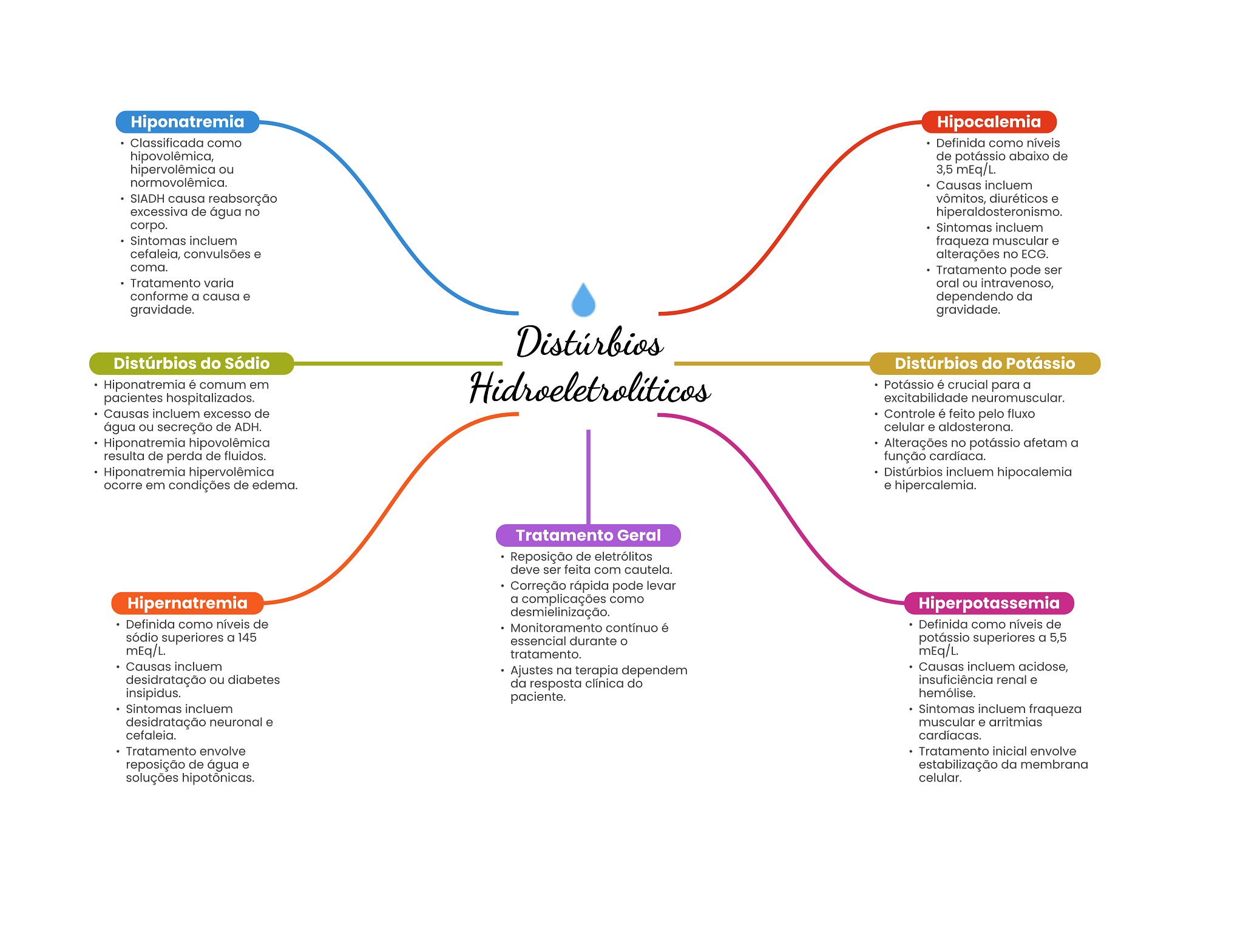 Hiponatremia Hipocalemia Classificada como Definida como níveis hipovolêmica, de potássio abaixo de hipervolêmica ou 3,5 mEq/L. normovolêmica. Causas incluem SIADH causa reabsorção vômitos, diuréticos e excessiva de água no hiperaldosteronismo corpo. Sintomas incluem Sintomas incluem fraqueza muscular e cefaleia, convulsões e alterações no ECG. coma. Tratamento pode ser Tratamento varia oral ou intravenoso, conforme a causa e dependendo da gravidade. gravidade. Distúrbios Distúrbios do Sódio Distúrbios do Potássio Hiponatremia é comum em Hidroeletroliticos Potássio é crucial para a pacientes hospitalizados. excitabilidade neuromuscular. Causas incluem excesso de Controle é feito pelo fluxo água ou secreção de ADH. celular e aldosterona. Hiponatremia hipovolêmica Alterações no potássio afetam a resulta de perda de fluidos. função cardíaca. Hiponatremia hipervolêmica Distúrbios incluem hipocalemia ocorre em condições de edema. e hipercalemia. Tratamento Geral Reposição de eletrólitos deve ser feita com cautela. Correção rápida pode levar Hipernatremia a complicações como Hiperpotassemia desmielinização. Definida como níveis de Monitoramento contínuo é Definida como níveis de sódio superiores a 145 essencial durante potássio superiores a 5,5 mEq/L. tratamento. mEq/L. Causas incluem Ajustes na terapia dependem Causas incluem acidose, desidratação ou diabetes da resposta clínica do insuficiência renal e insipidus. paciente. hemólise. Sintomas incluem Sintomas incluem fraqueza desidratação neuronal e muscular e arritmias cefaleia. cardíacas. Tratamento envolve Tratamento inicial envolve reposição de água e estabilização da membrana soluções hipotônicas. celular.