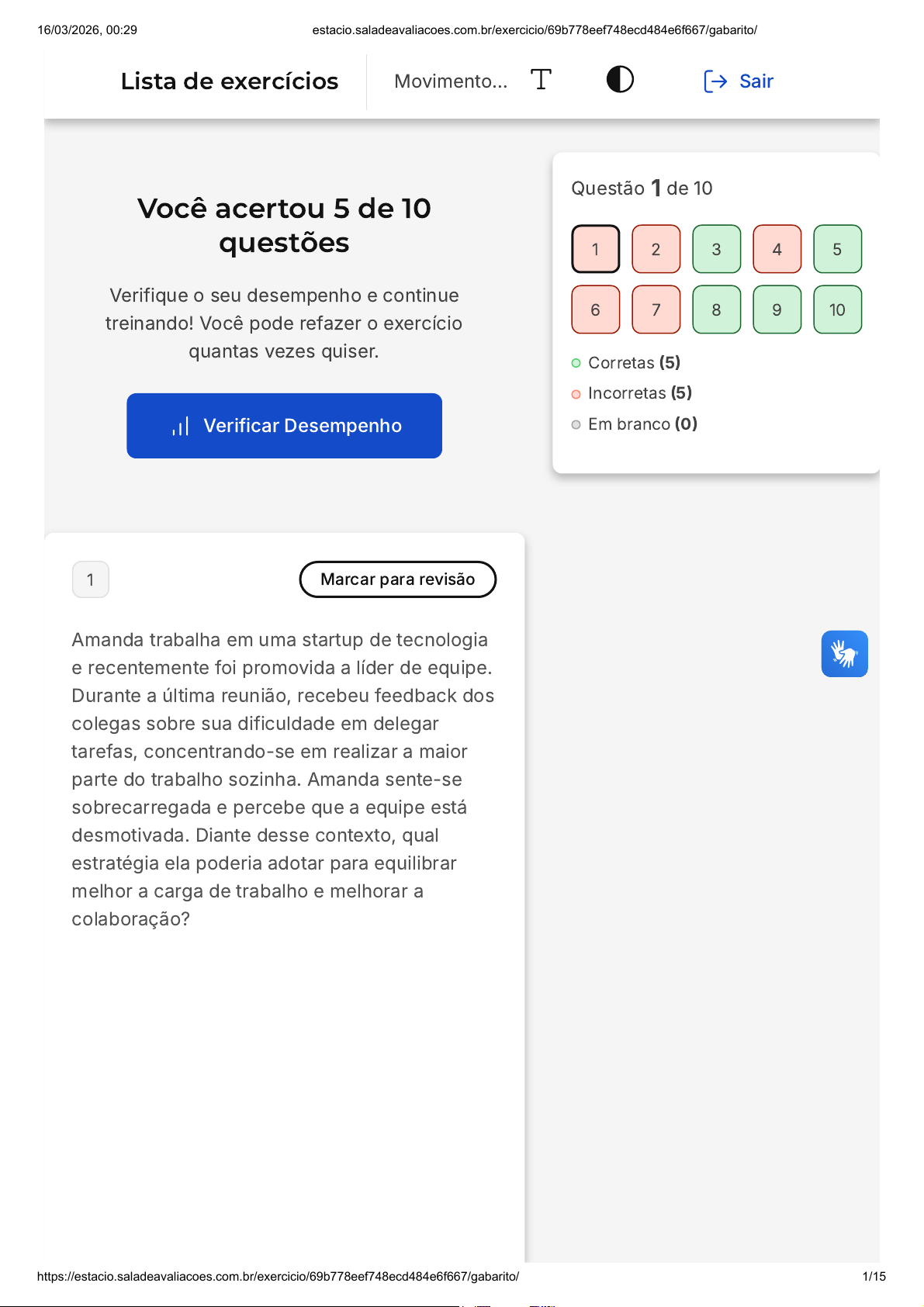 Você acertou 5 de 10 questões Verifique o seu desempenho e continue treinando! Você pode refazer o exercício quantas vezes quiser. Verificar Desempenho 1 Marcar para revisão Amanda trabalha em uma startup de tecnologia e recentemente foi promovida a líder de equipe. Durante a última reunião, recebeu feedback dos colegas sobre sua dificuldade em delegar tarefas, concentrando-se em realizar a maior parte do trabalho sozinha. Amanda sente-se sobrecarregada e percebe que a equipe está desmotivada. Diante desse contexto, qual estratégia ela poderia adotar para equilibrar melhor a carga de trabalho e melhorar a colaboração? Questão 1 de 10 Corretas (5) Incorretas (5) Em branco (0) 1 2 3 4 5 6 7 8 9 10 Lista de exercícios Movimento… Sair 16/03/2026, 00:29 estacio.saladeavaliacoes.com.br/exercicio/69b778eef748ecd484e6f667/gabarito/ https://estacio.saladeavaliacoes.com.br/exercicio/69b778eef748ecd484e6f667/gabarito/ 1/15 A B C D E Focar em suas habilidades e realizar as tarefas sozinha, mostrando aos colegas como realizar o trabalho corretamente. Delegar tarefas com base nas habilidades individuais dos colegas e oferecer feedbacks regulares sobre seu desempenho. Adotar uma postura autoritária para manter o controle e garantir que as tarefas sejam realizadas conforme suas expectativas. Ignorar o feedback dos colegas e continuar com o método que considera mais eficiente. Solicitar ajuda externa para gerenciar o trabalho e se afastar temporariamente da liderança para reduzir o estresse. Resposta incorreta Opa! A alternativa correta é a letra B. Confira o gabarito comentado! Gabarito Comentado Delegar tarefas de acordo com as habilidades de cada colega e oferecer feedbacks regulares promove um ambiente colaborativo, incentivando a autonomia e o desenvolvimento da equipe. Essa estratégia também alivia a sobrecarga de 16/03/2026, 00:29 estacio.saladeavaliacoes.com.br/exercicio/69b778eef748ecd484e6f667/gabarito/ https://estacio.saladeavaliacoes.com.br/exercicio/69b778eef748ecd484e6f667/gabarito/ 2/15 A B Amanda, beneficiando o trabalho em grupo e o desenvolvimento individual. 2 Marcar para revisão A Resolução do Conselho Federal de Psicologia nº 002/2004, Reconhece a Neuropsicologia como especialidade em Psicologia para finalidade de concessão e registro do título de Especialista. Sobre esta resolução marque a alternativa correta. Traz a definição dos conceitos, princípios, procedimentos adotados na Neuropsicologia e apresenta os requisitos estabelecidos na mencionada resolução foi elaborada tendo como referência documentos da Comissão Internacional de Testes e da Associação Americana de Psicologia, dentre outras associações de renome internacional. Apresenta um dos requisitos mínimos para que o instrumento de avaliação seja aprovado é a apresentação de fundamentação teórica com, no mínimo, trinta laudas específicas que versem sobre o construto que será avaliado. 16/03/2026, 00:29 estacio.saladeavaliacoes.com.br/exercicio/69b778eef748ecd484e6f667/gabarito/ https://estacio.saladeavaliacoes.com.br/exercicio/69b778eef748ecd484e6f667/gabarito/ 3/15 C D E Apresenta a definição de Neuropsicologia e considera os testes recebidos para avaliação seguirão uma tramitação que inclui a recepção; a análise; a avaliação; a comunicação da avaliação aos requerentes, com prazo para recurso; a análise do recurso; e a avaliação final. Define Neuropsicologia e recomenda o teste psicológico em condições de uso aquele que, após receber parecer da Comissão Consultiva em Avaliação Psicológica, for aprovado pelo Conselho Federal de Psicologia. Essa especialidade irá atuar no diagnóstico, acompanhamento e tratamento de transtornos. Além disso irá atuar na pesquisa da cognição, das emoções, da personalidade e do comportamento, sob o enfoque da relação entre esses aspectos e o funcionamento cerebral. Resposta incorreta Opa! A alternativa correta é a letra E. Confira o gabarito comentado! Gabarito Comentado A Resolução do Conselho Federal de Psicologia nº 002/2004 reconhece a Neuropsicologia como uma especialidade em Psicologia que atua no diagnóstico, no acompanhamento, no tratamento e na pesquisa da cognição, das emoções, da personalidade e do comportamento, sob o 16/03/2026, 00:29 estacio.saladeavaliacoes.com.br/exercicio/69b778eef748ecd484e6f667/gabarito/ https://estacio.saladeavaliacoes.com.br/exercicio/69b778eef748ecd484e6f667/gabarito/ 4/15 A B C D E enfoque da relação entre esses aspectos e o funcionamento cerebral. 3 Marcar para revisão A teoria da Gestalt, desenvolvida por psicólogos como Max Wertheimer, enfatiza a percepção do todo como mais significativa do que a soma de suas partes. Esta abordagem revolucionou o entendimento da percepção e da cognição humana, destacando a importância das relações e configurações na psicologia. Qual é o princípio fundamental da Gestalt? Reforço negativo. Percepção do todo. Inconsciente. Condição pré-consciente. Comportamento observável. Resposta correta Parabéns, você selecionou a alternativa correta. Confira o gabarito comentado! Gabarito Comentado A Gestalt, como uma escola de pensamento na psicologia, baseia-se no 16/03/2026, 00:29 estacio.saladeavaliacoes.com.br/exercicio/69b778eef748ecd484e6f667/gabarito/ https://estacio.saladeavaliacoes.com.br/exercicio/69b778eef748ecd484e6f667/gabarito/ 5/15 A B C princípio de que a percepção do todo é mais significativa do que simplesmente a soma de suas partes. Este conceito se diferencia do foco em aspectos como reforço negativo, o inconsciente, condições pré-conscientes ou comportamento observável, todos pertencentes a diferentes teorias ou abordagens psicológicas. 4 Marcar para revisão O sistema de crenças é mantido pelo senso comum, do lado oposto está a ciência. Sobre a perspectiva e Zeitgeist, analise as asserções I e II. I. Em ciências deve-se achar e deduzir antes de observar e encontrar as evidê