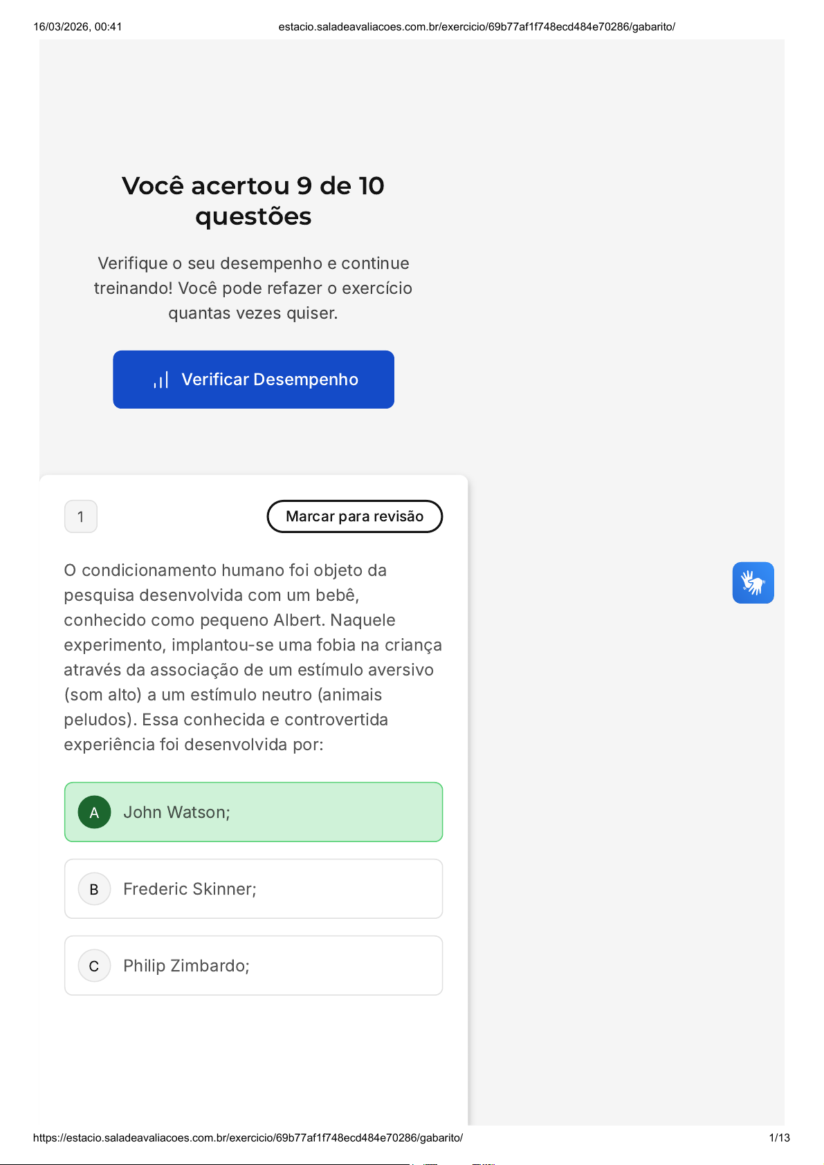 Você acertou 9 de 10 questões Verifique o seu desempenho e continue treinando! Você pode refazer o exercício quantas vezes quiser. Verificar Desempenho A B C 1 Marcar para revisão O condicionamento humano foi objeto da pesquisa desenvolvida com um bebê, conhecido como pequeno Albert. Naquele experimento, implantou-se uma fobia na criança através da associação de um estímulo aversivo (som alto) a um estímulo neutro (animais peludos). Essa conhecida e controvertida experiência foi desenvolvida por: John Watson; Frederic Skinner; Philip Zimbardo; 16/03/2026, 00:41 estacio.saladeavaliacoes.com.br/exercicio/69b77af1f748ecd484e70286/gabarito/ https://estacio.saladeavaliacoes.com.br/exercicio/69b77af1f748ecd484e70286/gabarito/ 1/13 D E Stanley Milgram; Erik Erikson. Resposta correta Parabéns, você selecionou a alternativa correta. Confira o gabarito comentado! Gabarito Comentado O experimento do pequeno Albert foi conduzido por John Watson, um psicólogo behaviorista. Watson acreditava que as reações humanas, incluindo emoções e comportamentos, eram produtos de aprendizados condicionados. No experimento, ele conseguiu condicionar o pequeno Albert a temer animais peludos, associando-os a um som alto e assustador. Portanto, a alternativa correta é a "A", que menciona John Watson. 2 Marcar para revisão Para ensinar uma criança a andar de bicicleta, segundo a visão do Comportamentalismo de Skinner, o mais correto é: Questão 3 de 10 Corretas (9) Incorretas (1) Em branco (0) 1 2 3 4 5 6 7 8 9 10 Lista de exercícios Psicologia Da… Sair 16/03/2026, 00:41 estacio.saladeavaliacoes.com.br/exercicio/69b77af1f748ecd484e70286/gabarito/ https://estacio.saladeavaliacoes.com.br/exercicio/69b77af1f748ecd484e70286/gabarito/ 2/13 A B C D E Andar de bicicleta bastante tempo, para que a criança observe, mostrando as dificuldades e os perigos que podem acontecer. Reforçar o primeiro comportamento correto da criança, ao sentar-se na bicicleta, e reforçar, gradualmente, os comportamentos que se aproximarem do comportamento final desejado. Mostrar vídeos de outras crianças andando de bicicleta, explicando cada movimento que elas fazem. Deixar a criança sozinha com a bicicleta, para que ela explore o objeto e descubra, sozinha, a forma de andar no veículo. Chamar uma outra pessoa para ensinar a criança a andar na bicicleta. Resposta correta Parabéns, você selecionou a alternativa correta. Confira o gabarito comentado! Gabarito Comentado De acordo com a teoria comportamentalista de Skinner, o aprendizado é um processo que ocorre através de reforços positivos e negativos. Nesse sentido, a melhor maneira de ensinar uma criança a andar de bicicleta seria reforçar o primeiro comportamento correto, como sentar-se na bicicleta, e, em 16/03/2026, 00:41 estacio.saladeavaliacoes.com.br/exercicio/69b77af1f748ecd484e70286/gabarito/ https://estacio.saladeavaliacoes.com.br/exercicio/69b77af1f748ecd484e70286/gabarito/ 3/13 A B C D E seguida, reforçar gradualmente os comportamentos que se aproximam do objetivo final, que é andar de bicicleta. Essa abordagem é conhecida como modelagem, um processo no qual se reforça cada pequeno passo que se aproxima do comportamento desejado. 3 Marcar para revisão Um psicólogo educacional analisa a influência do ambiente no aprendizado dos alunos. Ele observa que certas condições ambientais, como a organização da sala de aula, afetam diretamente o comportamento dos estudantes durante as aulas. Baseado no comportamentalismo, qual aspecto o psicólogo está priorizando na sua análise? Desenvolvimento emocional. Estímulos ambientais. Processos cognitivos internos. Relações interpessoais. Motivação intrínseca. Resposta incorreta Opa! A alternativa correta é a letra B. Confira o gabarito comentado! 16/03/2026, 00:41 estacio.saladeavaliacoes.com.br/exercicio/69b77af1f748ecd484e70286/gabarito/ https://estacio.saladeavaliacoes.com.br/exercicio/69b77af1f748ecd484e70286/gabarito/ 4/13 A B C Gabarito Comentado O foco do psicólogo comportamentalista na análise do comportamento dos alunos está nos estímulos ambientais, como a organização da sala de aula. O comportamentalismo enfatiza como o ambiente externo e os estímulos que dele emanam influenciam o comportamento, diferindo de abordagens que focam em aspectos internos, como processos cognitivos ou motivação intrínseca. 4 Marcar para revisão Em uma escola que segue a abordagem comportamentalista, um professor utiliza reforços positivos para aumentar a frequência de comportamentos desejáveis em seus alunos. Ele nota que, ao elogiar as boas notas, os estudantes mostram maior interesse e melhoram seu desempenho. No contexto da psicologia educacional comportamentalista, qual estratégia o professor está aplicando para melhorar o desempenho dos alunos? Condicionamento operante. Condicionamento clássico. Modelagem cognitiva. 16/03/2026, 00:41 estacio.saladeavaliacoes.com.br/exercicio/69b77af1f748ecd484e70286/gabarito/ https://estacio.saladeavaliacoes.com.br/exercicio/69b77af1f748ecd484e70286/gabarito/ 5/13 D E Transferência de aprendizagem. Aprendizagem por observação. Resposta correta Parabéns, você selecionou a alternativa correta. Confira o gabarito comentado! Gabarito Comentado O professor utiliza o condicionamento operante, uma técnica que envolve o uso de reforços positivos (como elogios) para aumentar a probabilidade de ocorrência de um comportamento desejado (melhor desempenho escolar). Este método é central na psicologia comportamentalista e difere de outras técnicas como o condicionamento clássico, que associa estímulos neutros a respostas condicionadas. 5 Marcar para revisão Segundo Bee (2011), considerando-se o modelo de condicionamento operante de Skinner, numerar a 2ª coluna de acordo com a 1ª e, após, assinalar a alternativa que apresenta a sequência CORRETA: (1) Reforço negativo. (2) Punição. (3) Reforço positivo. ( ) O processo de fortalecimento de um com