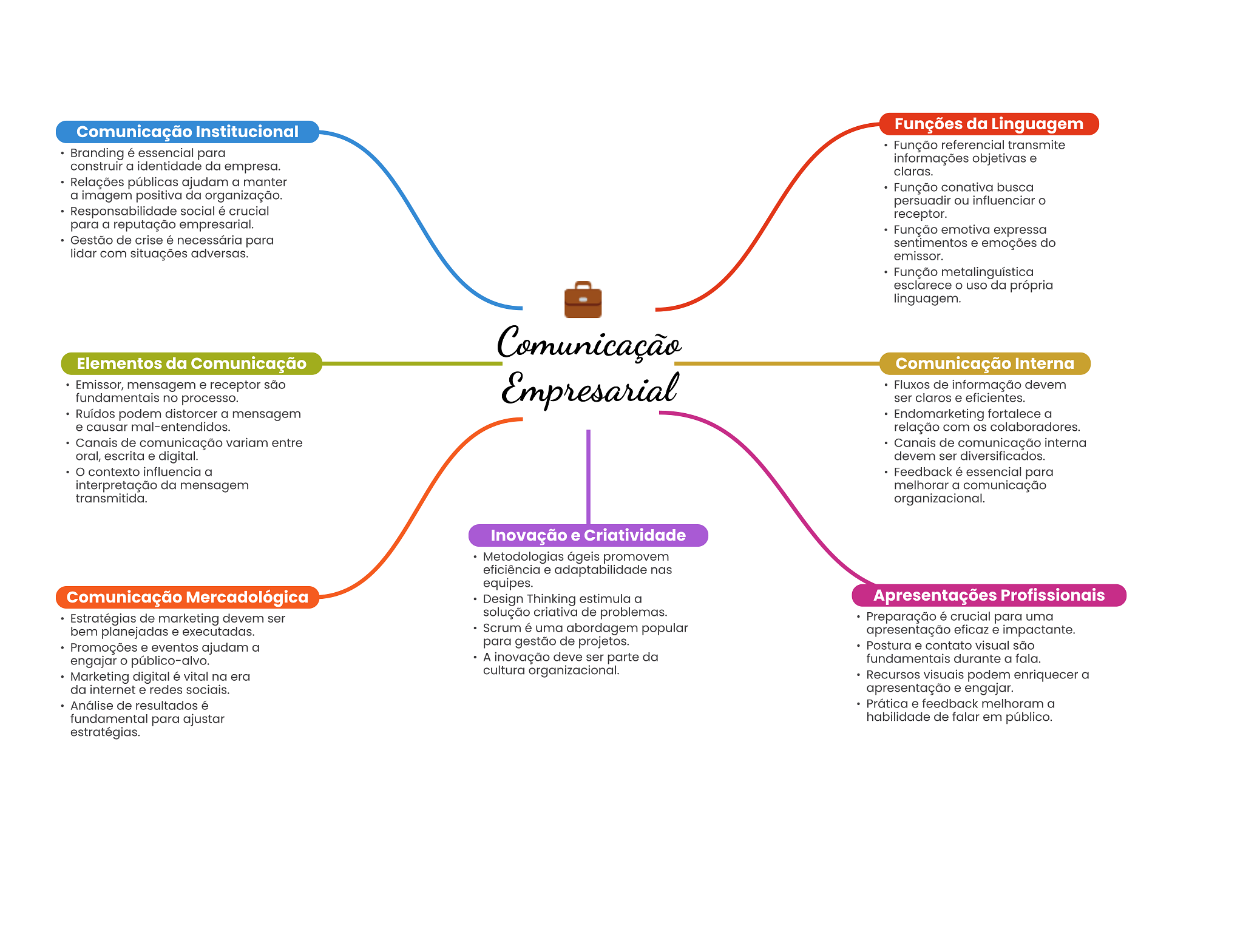Comunicação Institucional Funções da Linguagem Função referencial transmite Branding é essencial para informações objetivas e construir a identidade da empresa. claras. Relações públicas ajudam a manter Função conativa busca a imagem positiva da organização. persuadir ou influenciar Responsabilidade social é crucial receptor. para a reputação empresarial. Função emotiva expressa Gestão de crise é necessária para sentimentos e emoções do lidar com situações adversas. emissor. Função metalinguística esclarece O uso da própria linguagem. Comunicação Elementos da Comunicação Comunicação Interna Emissor, mensagem e receptor são Empresarial Fluxos de informação devem fundamentais no processo. ser claros e eficientes. Ruídos podem distorcer a mensagem Endomarketing fortalece a e causar mal-entendidos. relação com OS colaboradores. Canais de comunicação variam entre Canais de comunicação interna oral, escrita e digital. devem ser diversificados. contexto influencia a Feedback é essencial para interpretação da mensagem melhorar a comunicação transmitida. organizacional. Inovação e Criatividade Metodologias ágeis promovem eficiência e adaptabilidade nas equipes. Comunicação Mercadológica Design Thinking estimula a Apresentações Profissionais Estratégias de marketing devem ser solução criativa de problemas. Preparação é crucial para uma bem planejadas e executadas. Scrum é uma abordagem popular apresentação eficaz e impactante. Promoções e eventos ajudam a para gestão de projetos. Postura e contato visual são engajar público-alvo. A inovação deve ser parte da fundamentais durante a fala. Marketing digital é vital na era cultura organizacional. Recursos visuais podem enriquecer a da internet e redes sociais. apresentação e engajar. Análise de resultados é Prática e feedback melhoram a fundamental para ajustar habilidade de falar em público. estratégias.