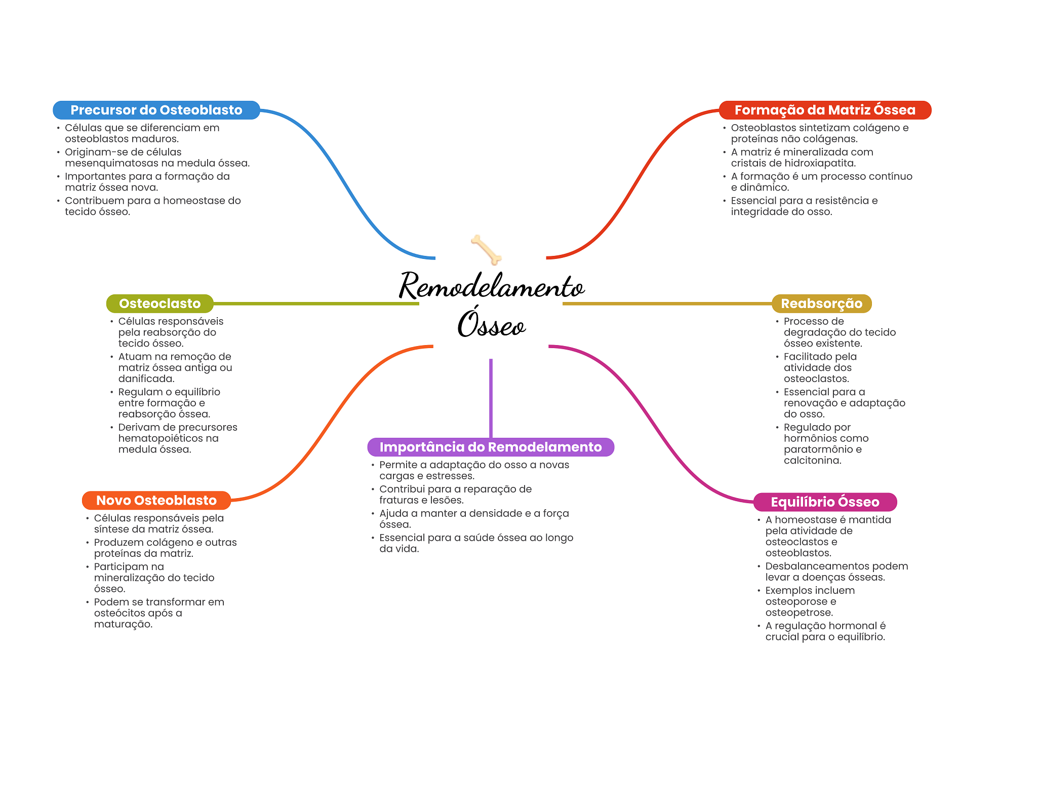 Precursor do Osteoblasto Formação da Matriz Óssea Células que se diferenciam em Osteoblastos sintetizam colágeno e osteoblastos maduros. proteínas não colágenas. Originam-se de células A matriz é mineralizada com mesenquimatosas na medula óssea. cristais de hidroxiapatita. Importantes para a formação da A formação é um processo contínuo matriz óssea nova. e dinâmico. Contribuem para a homeostase do Essencial para a resistência e tecido ósseo. integridade do OSSO. Remodelamento Osteoclasto Reabsorção Células responsáveis pela reabsorção do Ósseo Processo de degradação do tecido tecido ósseo. ósseo existente. Atuam na remoção de Facilitado pela matriz óssea antiga ou atividade dos danificada. osteoclastos. Regulam O equilíbrio Essencial para a entre formação e renovação e adaptação reabsorção óssea. do Derivam de precursores Regulado por hematopoiéticos na hormônios como medula óssea. Importância do Remodelamento paratormônio e Permite a adaptação do a novas calcitonina. cargas e estresses. Contribui para a reparação de Novo Osteoblasto fraturas e lesões. Equilíbrio Ósseo Células responsáveis pela Ajuda a manter a densidade e a força síntese da matriz óssea. óssea. A homeostase é mantida pela atividade de Produzem colágeno e outras Essencial para a saúde óssea ao longo osteoclastos e da vida. proteínas da matriz. osteoblastos. Participam na Desbalanceamentos podem mineralização do tecido levar a doenças ósseas. ósseo. Exemplos incluem Podem se transformar em osteoporose e osteócitos após a osteopetrose. maturação. A regulação hormonal é crucial para O equilíbrio.