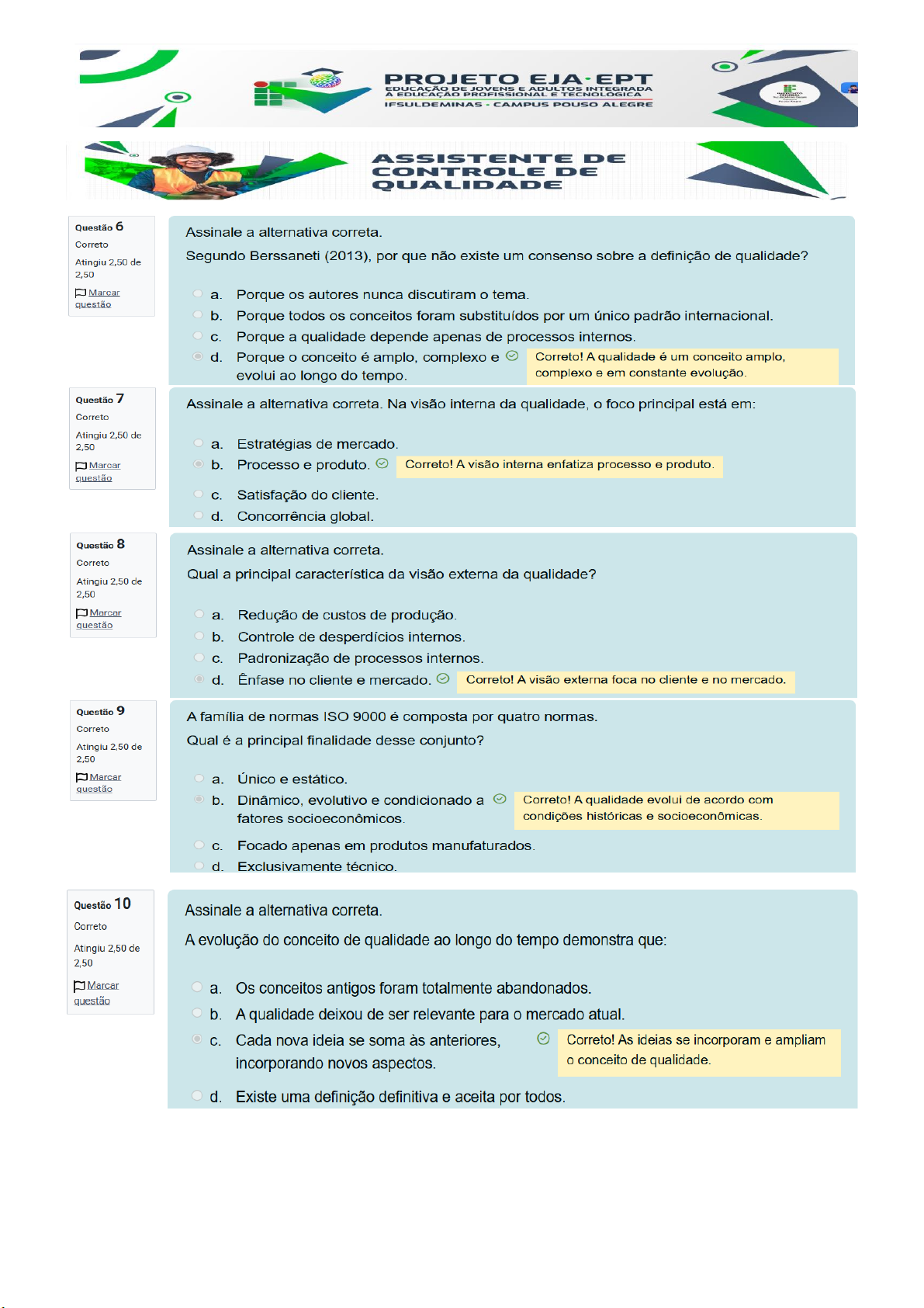 PROJETO DE JOVENS ADULTOS INTEGRADA EDUCAÇÃO PROFISSIONAL E TECNOLÓGICA IFSULDEMINAS CAMPUS POUSO ALEGRE ASSISTENTED CONTROLE QUALIDADE Questão 6 Assinale a alternativa correta. Correto Atingiu 2,50 de Segundo Berssaneti (2013), por que não existe um consenso sobre a definição de qualidade? 2,50 Marcar a. Porque os autores nunca discutiram tema. questão b. Porque todos conceitos foram substituídos por um único padrão internacional. C. Porque a qualidade depende apenas de processos internos. d. Porque conceito é amplo, complexo e Correto! A qualidade é um conceito amplo, evolui ao longo do tempo. complexo e em constante evolução. Questão 7 Assinale a alternativa correta. Na visão interna da qualidade, foco principal está em: Correto Atingiu 2,50 de 2,50 a. Estratégias de mercado. Marcar b. Processo e produto. Correto! A visão interna enfatiza processo e produto. questão C. Satisfação do cliente. d. Concorrência global. Questão 8 Assinale a alternativa correta. Correto Qual a principal característica da visão externa da qualidade? Atingiu 2,50 de 2,50 Marcar a. Redução de custos de produção. questão b. Controle de desperdícios internos. C. Padronização de processos internos. d. Ênfase no cliente e mercado. Correto! A visão externa foca no cliente e no mercado. Questão 9 A família de normas ISO 9000 é composta por quatro normas. Correto Atingiu 2,50 de Qual é a principal finalidade desse conjunto? 2,50 Marcar a. Único e estático. questão b. Dinâmico, evolutivo e condicionado a Correto! A qualidade evolui de acordo com fatores condições históricas e socioeconômicas. C. Focado apenas em produtos manufaturados. d. Exclusivamente técnico. Questão 10 Assinale a alternativa correta. Correto A evolução do conceito de qualidade ao longo do tempo demonstra que: Atingiu 2,50 de 2,50 Marcar a. Os conceitos antigos foram totalmente abandonados. questão b. A qualidade deixou de ser relevante para mercado atual. C. Cada nova ideia se soma às anteriores, Correto! As ideias se incorporam e ampliam incorporando novos aspectos. o conceito de qualidade. d. Existe uma definição definitiva e aceita por todos.