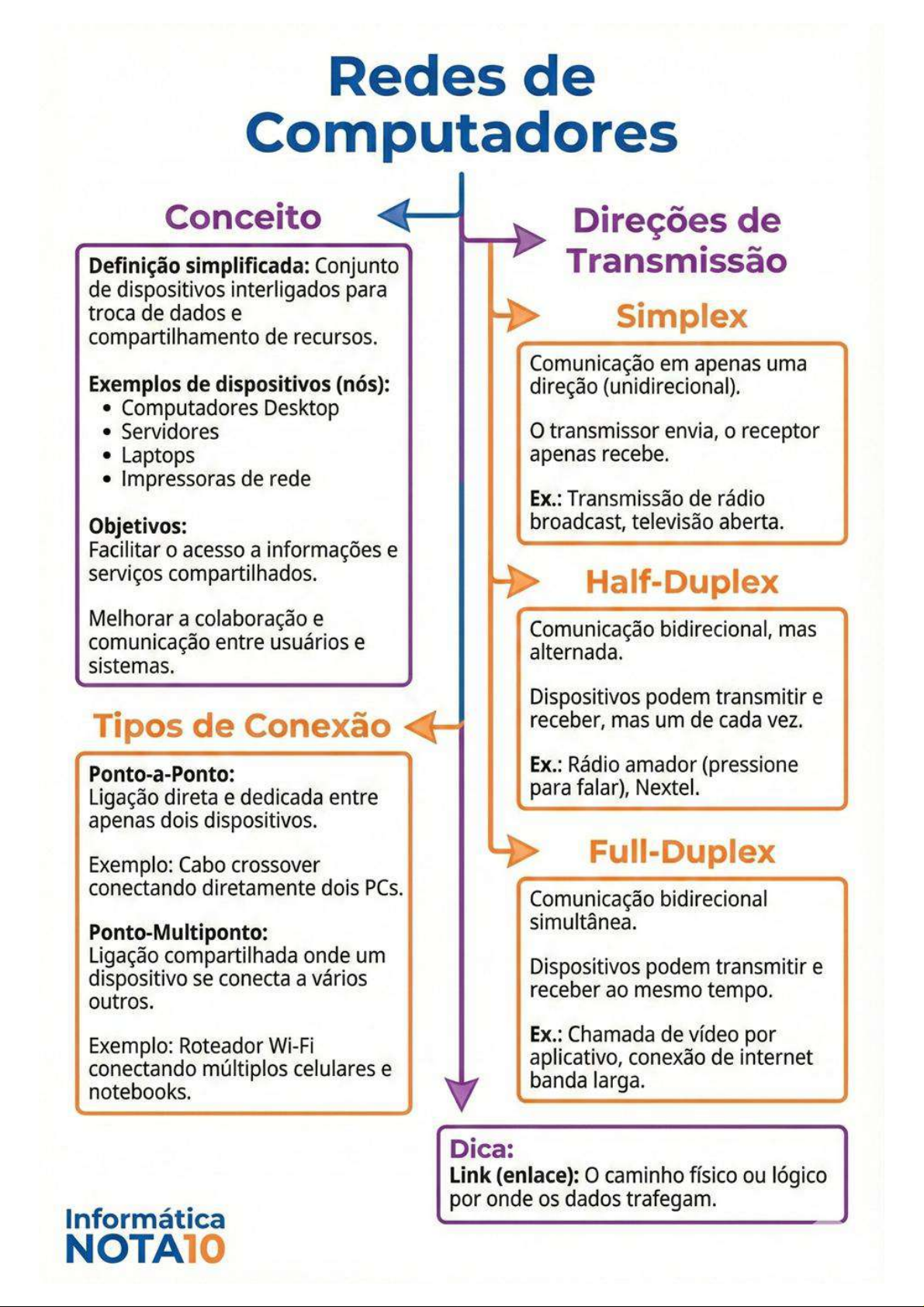 Redes de Computadores Conceito Direções de Definição simplificada: Conjunto Transmissão de dispositivos interligados para troca de dados e Simplex compartilhamento de recursos. Comunicação em apenas uma Exemplos de dispositivos (nós): direção (unidirecional). Computadores Desktop Servidores transmissor envia, 0 receptor Laptops apenas recebe. Impressoras de rede Ex.: Transmissão de rádio Objetivos: broadcast, televisão aberta. Facilitar acesso a informações e serviços compartilhados. Half-Duplex Melhorar a colaboração e Comunicação bidirecional, mas comunicação entre usuários e alternada. sistemas. Dispositivos podem transmitir e Tipos de Conexão receber, mas um de cada vez. Ponto-a-Ponto: Ex.: Rádio amador (pressione Ligação direta e dedicada entre para falar), Nextel. apenas dois dispositivos. Exemplo: Cabo crossover Full-Duplex conectando diretamente dois PCs. Comunicação bidirecional simultânea. Ponto-Multiponto: Ligação compartilhada onde um dispositivo se conecta a vários Dispositivos podem transmitir e outros. receber ao mesmo tempo. Exemplo: Roteador Wi-Fi Ex.: Chamada de vídeo por conectando múltiplos celulares e aplicativo, conexão de internet notebooks. banda larga. Dica: Link (enlace): caminho físico ou lógico por onde os dados trafegam. Informática NOTA10Internet Principais Serviços World Wide Web Acesso Remoto Permite controlar e usar um Sistema que permite navegar por computador ou rede à distância, páginas e sites interligados, como se estivesse fisicamente lá. contendo textos, imagens e vídeos (hipermídia). Acessado via Protocolos: SSH (linha de navegadores. comando), RDP (Windows), VNC Protocolos: HTTP (comum) e (gráfico). HTTPS (seguro). Exemplos: Suporte técnico Exemplos: Acessar Google, ler acessando sua máquina, trabalhar notícias no G1, usar redes sociais. de casa no PC do escritório. Transferência de Correio Eletrônico Arquivos Serviço para enviar, receber e Permite mover dados organizar mensagens digitais (documentos, fotos, vídeos) entre (e-mails). Uma das formas mais dispositivos através da internet. antigas de comunicação online. Métodos: Upload (enviar), Protocolos: SMTP (envio), POP3 Download (receber). e IMAP (recebimento). Protocolos: FTP (tradicional), Exemplos: Gmail, Outlook, P2P (compartilhamento direto). Yahoo Mail. Exemplos: Salvar arquivos no Google Drive, baixar um filme via torrent. Dica: Link (hiperlink): Conexão Outros Serviços clicável que leva de uma página Redes Sociais (Instagram, ou recurso para outro na Facebook), Serviços de Nuvem internet. (Dropbox, iCloud), Streaming (Netflix, Spotify), Mensagens Instantâneas Informática (WhatsApp, Telegram). NOTA10Ferramentas de Busca Conceito Definição: Sistemas online que permitem encontrar informações na web Operadores através de palavras-chave. Ajudam a navegar pelo Booleanos conteúdo da internet. Palavras que conectam termos de busca para incluir, Exemplos: Google, Bing, excluir ou combinar DuckDuckGo. resultados. AND (e / +): Inclui todos Exemplos de os termos na busca. Comandos Ex: concurso AND Refinam a pesquisa para informática resultados mais precisos. Aspas Busca pela frase OR (ou / |): Busca por um exata. termo OU outro. Ex: "questões de concurso" Ex: edital OR gabarito site:: Pesquisa dentro de NOT (não / -): Exclui um um domínio específico. termo da busca. Ex: site:gov.br edital Ex: receita -bolo filetype: Busca por um tipo de arquivo. Ex: filetype:pdf resumo informática Dica: Google, em geral, ignora maiúsculas/minúsculas e acentuação. Informática NOTA10Navegadores Conceito Principais Navegadores Web Definição: Programa (aplicativo) usado para acessar e visualizar Google Chrome: mais páginas e conteúdos na internet popular do mundo, conhecido (web). Também chamado de por sua velocidade, vasta browser ou Cliente Web. Ele biblioteca de extensões e traduz códigos como HTML, integração com serviços CSS e JavaScript para o que Google. você vê na tela. Ex: Sincronização com conta Google. Exemplo: Usar o Chrome para Mozilla Firefox: Navegador de acessar o site do G1. código aberto, focado em privacidade e personalização. Oferece forte proteção contra rastreamento. Protocolos de Ex: Bloqueio de cookies de terceiros. Comunicação Microsoft Edge: Baseado no HTTP: projeto Chromium (mesma Padrão para transferir dados base do Chrome), padrão no na web. Usado para acessar Windows 10 e 11. Oferece páginas sem dados recursos como Modo de sensíveis. Leitura. Ex: Ler um blog. Ex: Integração com o Microsoft 365. HTTPS: Safari: Desenvolvido pela Apple, Versão segura do com otimizado para dispositivos criptografia. Essencial para macOS e iOS (iPhone, iPad). transações e login. Conhecido por sua eficiência Ex: Acessar seu banco online. energética no ecossistema Apple. Ex: Recurso de Prevenção de Rastreamento Inteligente. Dica: A maioria dos navegadores modernos (Chrome, Edge, Opera) é baseada no motor Chromium. Informática NOTA10Microsoft Excel Planilha Conceito Eletrônica Linhas Tabela digital Organização organizada em horizontal. linhas e colunas Numeradas para dados. Planilha (1,2,3...). Eletrônica Células Colunas Interseção de Organização linha e coluna. vertical. Unidade básica. Letradas Exempio: C5, D10. (A, B, Limites Tipos de Dados Máximo de Linhas: 1.048.576. Números: 100, 2.5. Máximo de Colunas: Texto: Nome, Cidade. 16.384. Fórmulas: Máximo de Caracteres =MÉDIA(A1:A5). (por Célula): 32.767. Informática NOTA10Microsoft Word Principais Comandos Fonte Tipo de Fonte ab A Cor da Fonte Escolha estilo visual Mude a cor do texto da sua letra (ex: Times New Roman, Arial) ab Realçar Texto Ex: Fonte escolhida Adicione um fundo colorido (tipo marcador) 11 = A Guia: Página Inicial Tamanho da Fonte Times New 11 A Aumentar/Diminuir Ajuste tamanho da letra em pontos Tamanho da Fonte N I S abe X2 A Aumente ou diminua Ex: Letra maior Fonte tamanho rapidamente Guia: Página Inicial 