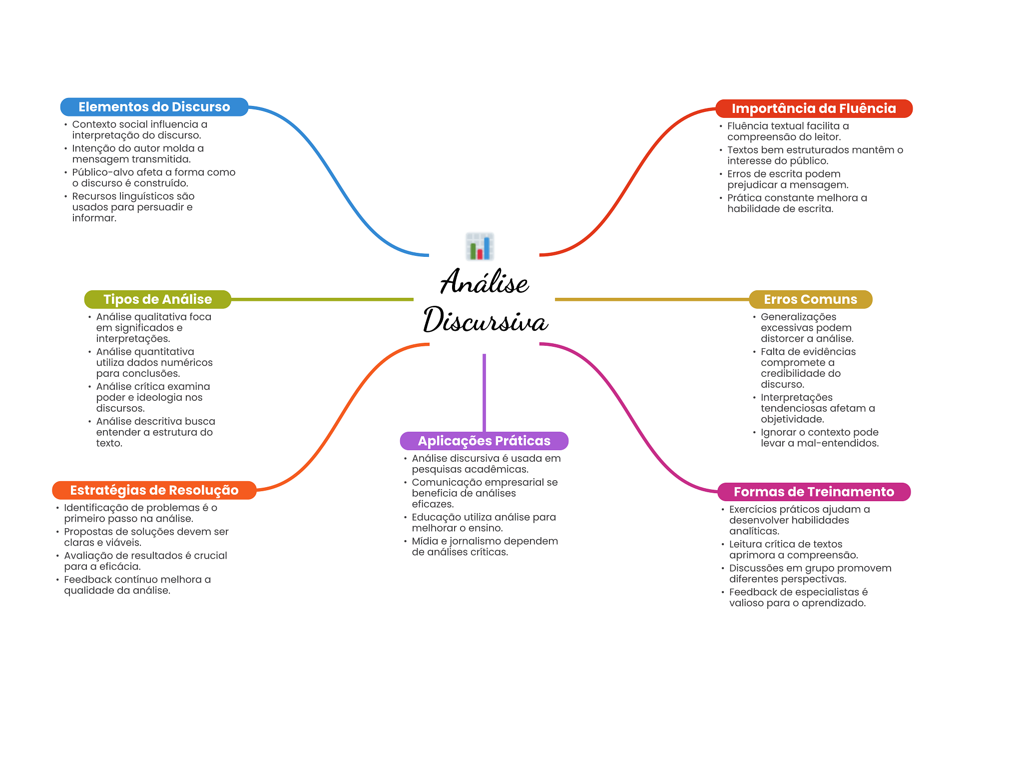 Elementos do Discurso Importância da Fluência Contexto social influencia a Fluência textual facilita a interpretação do discurso. compreensão do leitor. Intenção do autor molda a Textos bem estruturados mantêm mensagem transmitida. interesse do público. Público-alvo afeta a forma como Erros de escrita podem discurso é construído. prejudicar a mensagem. Recursos linguísticos são Prática constante melhora a usados para persuadir e habilidade de escrita. informar. Análise Tipos de Análise Erros Comuns Análise qualitativa foca Discursiva Generalizações em significados e excessivas podem interpretações. distorcer a análise. Análise quantitativa Falta de evidências utiliza dados numéricos compromete a para conclusões. credibilidade do Análise crítica examina discurso. poder e ideologia nos Interpretações discursos. tendenciosas afetam a Análise descritiva busca objetividade. entender a estrutura do Ignorar contexto pode texto. Aplicações Práticas levar a mal-entendidos. Análise discursiva é usada em pesquisas acadêmicas. Comunicação empresarial se Estratégias de Resolução beneficia de análises Formas de Treinamento Identificação de problemas é eficazes. Exercícios práticos ajudam a primeiro passo na análise. Educação utiliza análise para desenvolver habilidades Propostas de soluções devem ser melhorar ensino. analíticas. claras e viáveis. Mídia e jornalismo dependem Leitura crítica de textos Avaliação de resultados é crucial de análises críticas. aprimora a compreensão. para a eficácia. Discussões em grupo promovem Feedback contínuo melhora a diferentes perspectivas. qualidade da análise. Feedback de especialistas é valioso para aprendizado.