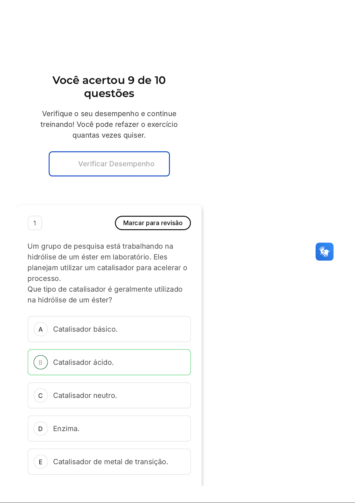 Você acertou 9 de 10 questões Verifique o seu desempenho e continue treinando! Você pode refazer o exercício quantas vezes quiser. Verificar Desempenho A B C D E 1 Marcar para revisão Um grupo de pesquisa está trabalhando na hidrólise de um éster em laboratório. Eles planejam utilizar um catalisador para acelerar o processo. Que tipo de catalisador é geralmente utilizado na hidrólise de um éster? Catalisador básico. Catalisador ácido. Catalisador neutro. Enzima. Catalisador de metal de transição. A B C Resposta correta Parabéns, você selecionou a alternativa correta. Confira o gabarito comentado! Gabarito Comentado Na hidrólise de ésteres, catalisadores ácidos são comumente usados para acelerar a reação. Esses catalisadores ajudam a quebrar as ligações no éster, levando à formação de ácido carboxílico. 2 Marcar para revisão Em um laboratório avançado de pesquisa orgânica, um grupo de cientistas dedica-se ao estudo das características químicas e físicas dos ácidos carboxílicos. Eles buscam compreender as propriedades, mecanismos e reações associadas, explorando aplicações potenciais em indústrias químicas e farmacêuticas. Qual das alternativas representa uma característica física dos ácidos carboxílicos? Ponto de ebulição elevado Presença de anel aromático Reatividade com metais alcalinos D E A B C Insolubilidade em água Formação de sais ao reagir com bases Resposta correta Parabéns, você selecionou a alternativa correta. Confira o gabarito comentado! Gabarito Comentado Os ácidos carboxílicos têm pontos de ebulição elevados devido à presença de ligações de hidrogênio intermoleculares. 3 Marcar para revisão Um grupo de pesquisa está analisando a formação de anidridos a partir de cloretos de acila. Eles planejam estudar a reação do cloreto de acila com um ácido carboxílico específico sob condições controladas. Qual produto é esperado da reação de um cloreto de acila com um ácido carboxílico? Amida. Éster. Anidrido. D E Álcool. Cloreto de acila. Resposta correta Parabéns, você selecionou a alternativa correta. Confira o gabarito comentado! Gabarito Comentado A reação de um cloreto de acila com um ácido carboxílico geralmente resulta na formação de anidridos. Esta é uma rota sintética importante para a preparação de anidridos usados em diversas aplicações químicas. As outras opções, como amidas, ésteres, álcoois e cloretos de acila, não são os produtos principais desta reação específica. 4 Marcar para revisão Ao estudar a síntese de amidas, um químico utiliza um cloreto de ácido como reagente inicial. A reação é um exemplo de como os derivados de ácidos carboxílicos são importantes na síntese orgânica. Qual é o papel do cloreto de ácido na síntese de uma amida? A B C D E Catalisador. Solvente. Fonte de hidrogênio. Reagente. Estabilizador. Resposta correta Parabéns, você selecionou a alternativa correta. Confira o gabarito comentado! Gabarito Comentado Na síntese de amidas, o cloreto de ácido atua como reagente. Ele reage com um composto amina para formar a amida. Esta é uma estratégia comum na química orgânica para a formação de amidas, utilizando cloretos de ácido devido à sua alta reatividade. 5 Marcar para revisão Uma equipe de químicos está estudando a reação de condensação de Claisen e a subsequente descarboxilação em ácido malônico. Eles observam a formação de um produto específico e analisam sua estrutura. Questão 5 de 10 Corretas (9) Incorretas (1) Em branco (0) 1 2 3 4 5 6 7 8 9 10 Lista de exercícios Ácidos… Sair A B C D E Considerando o texto, analise as afirmativas abaixo: Afirmativas: I: A reação de condensação de Claisen resulta na formação de cetonas. II: Na descarboxilação de ácido malônico, um ácido carboxílico é um dos produtos formados. III: A condensação de Claisen é uma reação que sempre resulta em compostos cíclicos. Apenas a afirmativa II está correta. Afirmativas I e II estão corretas. Apenas a afirmativa I está correta. Afirmativas II e III estão corretas. Apenas a afirmativa III está correta. Resposta incorreta Opa! A alternativa correta é a letra C. Confira o gabarito comentado! Gabarito Comentado A afirmativa I é correta, pois a reação de condensação de Claisen resulta frequentemente na formação de cetonas. A afirmativa II é incorreta, uma vez que a descarboxilação de ácido malônico não produz ácidos carboxílicos como produtos. A afirmativa III também é incorreta, pois a condensação de Claisen não necessariamente leva à formação de A B C D E compostos cíclicos, dependendo das condições e reagentes utilizados. 6 Marcar para revisão Os compostos orgânicos desempenham papéis cruciais em muitos processos industriais. Sua reatividade e a capacidade de interagir com outras moléculas os tornam valiosos para a síntese de novos compostos. Qual a função das aminas na síntese de amidas a partir de ácidos carboxílicos? Neutralizam o pH da solução Convertem ácidos em aldeídos Atuam como catalisadores Aceleram a reação Transformam os ácidos em ânions carboxilatos não reativos Resposta correta Parabéns, você selecionou a alternativa correta. Confira o gabarito comentado! Gabarito Comentado As aminas são essenciais na síntese de amidas porque transformam os ácidos A B C D E carboxílicos em ânions carboxilatos, que são menos reativos. Isso facilita a formação de amidas a partir desses ácidos. 7 Marcar para revisão Uma indústria farmacêutica desenvolve novos medicamentos utilizando ésteres derivados de ácidos carboxílicos, explorando suas propriedades físicas e químicas para fins terapêuticos. Qual é uma das principais aplicações dos ésteres derivados de ácidos carboxílicos na indústria farmacêutica? Como catalisadores em reações. Como agentes de sabor em alimentos. Como solventes em processos químicos. Como ingredientes ativo