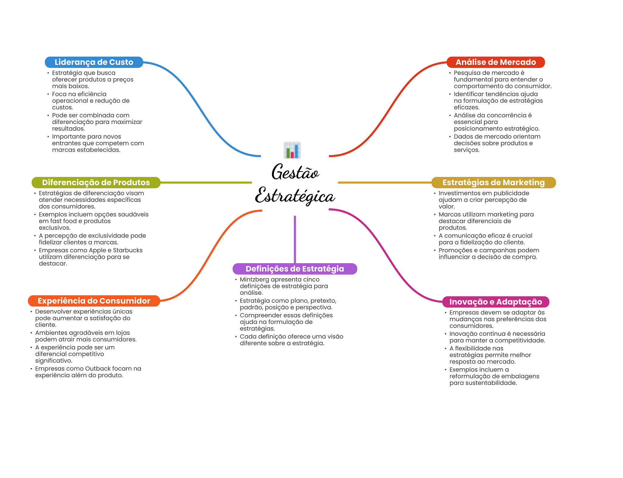 Liderança de Custo Análise de Mercado Estratégia que busca Pesquisa de mercado é oferecer produtos a preços fundamental para entender o mais baixos. comportamento do consumidor. Foca na eficiência Identificar tendências ajuda operacional e redução de na formulação de estratégias custos. eficazes. Pode ser combinada com Análise da concorrência é diferenciação para maximizar essencial para resultados. posicionamento estratégico. Importante para novos Dados de mercado orientam entrantes que competem com decisões sobre produtos e marcas estabelecidas. serviços. Gestão Diferenciação de Produtos Estratégias de Marketing Estratégias de diferenciação visam atender necessidades específicas Estratégica Investimentos em publicidade ajudam a criar percepção de dos consumidores. valor. Exemplos incluem opções saudáveis Marcas utilizam marketing para em fast food e produtos destacar diferenciais de exclusivos. produtos. A percepção de exclusividade pode A comunicação eficaz é crucial fidelizar clientes a marcas. para a fidelização do cliente. Empresas como Apple e Starbucks Promoções e campanhas podem utilizam diferenciação para se influenciar a decisão de compra. destacar. Definições de Estratégia Mintzberg apresenta cinco definições de estratégia para análise. Experiência do Consumidor Estratégia como plano, pretexto, Inovação e Adaptação padrão, posição e perspectiva. Desenvolver experiências únicas pode aumentar a satisfação do Compreender essas definições Empresas devem se adaptar às cliente. ajuda na formulação de mudanças nas preferências dos consumidores. estratégias. Ambientes agradáveis em lojas Cada definição oferece uma visão Inovação contínua é necessária podem atrair mais consumidores. diferente sobre a estratégia. para manter a competitividade. A experiência pode ser um A flexibilidade nas diferencial competitivo estratégias permite melhor significativo. resposta ao mercado. Empresas como Outback focam na Exemplos incluem a experiência além do produto. reformulação de embalagens para sustentabilidade.