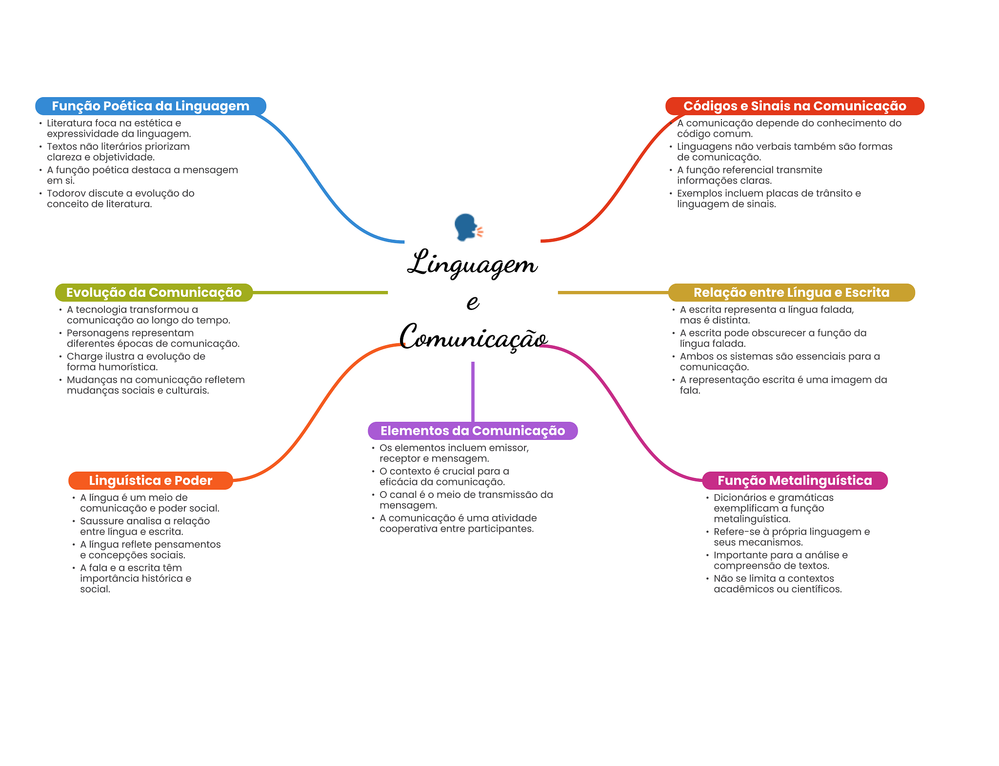 Função Poética da Linguagem Códigos e Sinais na Comunicação Literatura foca na estética e A comunicação depende do conhecimento do expressividade da linguagem. código comum. Textos não literários priorizam Linguagens não verbais também são formas clareza e objetividade. de comunicação. A função poética destaca a mensagem A função referencial transmite em si. informações claras. Todorov discute a evolução do Exemplos incluem placas de trânsito e conceito de literatura. linguagem de Linguagem Evolução da Comunicação Relação entre Língua e Escrita e A tecnologia transformou a A escrita representa a língua falada, comunicação ao longo do tempo. mas é distinta. Personagens representam Comunicação A escrita pode obscurecer a função da diferentes épocas de comunicação. língua falada. Charge ilustra a evolução de Ambos sistemas são essenciais para a forma humorística. comunicação. Mudanças na comunicação refletem A representação escrita é uma imagem da mudanças sociais e culturais. fala. Elementos da Comunicação Os elementos incluem emissor, receptor e mensagem. contexto é crucial para a Linguística e Poder eficácia da comunicação. Função Metalinguística A língua é um meio de canal é meio de transmissão da Dicionários e gramáticas comunicação e poder social. mensagem. exemplificam a função Saussure analisa a relação A comunicação é uma atividade metalinguística. entre língua e escrita. cooperativa entre participantes. Refere-se à própria linguagem e A língua reflete pensamentos seus mecanismos. e concepções sociais. Importante para a análise e A fala e a escrita têm compreensão de textos. importância histórica e Não se limita a contextos social. acadêmicos ou científicos.