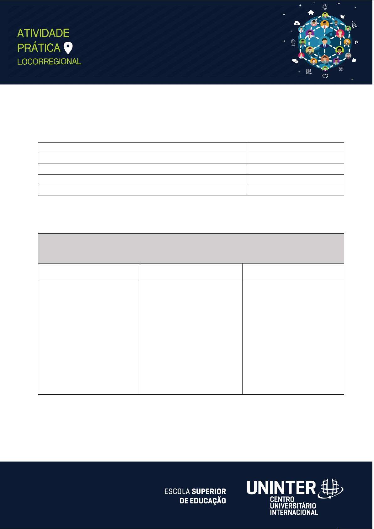 FICHA-RESPOSTA EDUCAÇÃO FÍSICA PRÁTICA LOCORREGIONAL DISCIPLINA: BIOMECÂNICA NOME DO ALUNO RU DO ALUNO 1. 2. 3. 4. Insira a imagem da avaliação realizada da pisada, no respectivo espaço do quadro PÉ NEUTRO PÉ CAVO PÉ PLANO (CHATO) Insira as imagens da avaliação realizada da coluna vertebral no (s) respectivo (s) espaço (s) do quadro CURVATURAS NORMAIS CIFOSE ESCOLIOSE HIPERLORDOSE Insira a imagem da avaliação realizada do alinhamento dos joelhos, no respectivo espaço do quadro ALINHAMENTO NORMAL DOS JOELHOS GENO VARO GENO VALGO APLICAÇÃO LOCORREGIONAL DA PRÁTICA Com base em sua pesquisa, cite, pelo menos, 2 recomendações e 2 exercícios físicos indicados para o fortalecimento e a manutenção da saúde da coluna vertebral de crianças e adultos. Depois disso, faça um levantamento e uma pesquisa da realidade da sua cidade e aponte pelo menos um local (escola, UPA, empresas, centros esportivos etc.) no qual seja possível a realização de orientação e prática dos exercícios físicos indicados para manutenção da coluna vertebral, citando o nome do local e realizando uma breve descrição da sua estrutura. 1 image1.png