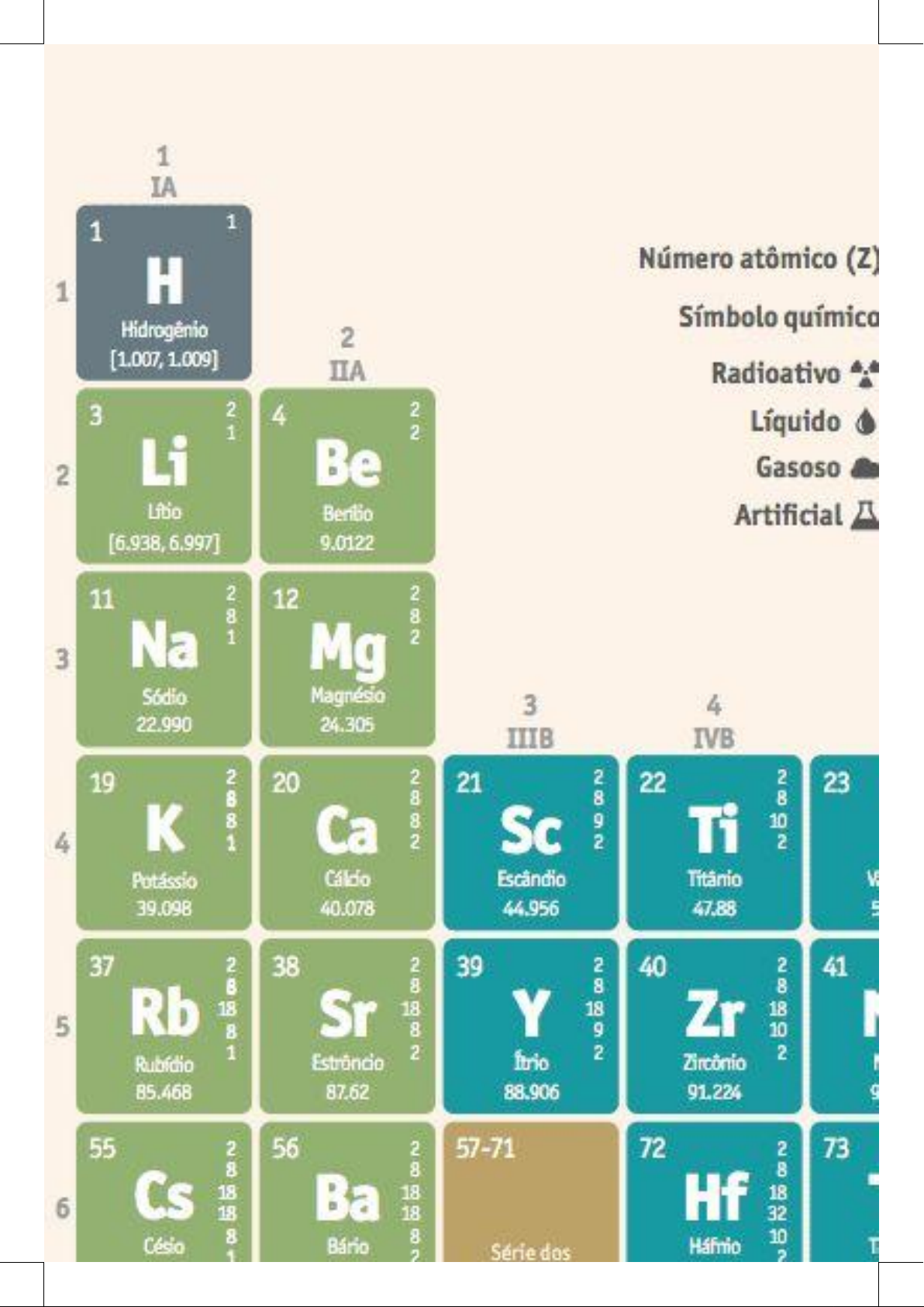 1 IA 1 1 H Número atômico 1 Hidrogênio Símbolo químico 2 [1.007, 1.009] ПА Radioativo 3 2 4 1 2 2 Líquido 2 Li Be Gasoso Artificial 6.997] 9.0122 11 8 2 1 12 Na 8 2 2 3 Mg Sódio Magnésio 3 4 22.990 24.305 IIIB IVB 19 2 20 21 2 22 2 8 8 2 8 2 23 8 8 8 1 Sc 9 Ti 10 4 2 2 Potássio Escândio V 39.098 40.078 44.956 47.88 37 2 38 2 39 2 40 2 41 8 8 8 8 Rb 18 Sr 18 Y 18 5 8 8 9 Zr 18 10 1 Estrôncio 2 2 Zircônio 2 Rubídio 85.468 87.62 88.906 91.224 9 55 2 56 2 57-71 72 2 73 8 8 8 18 Ba 18 6 Hf 18 18 18 32 Césio 8 Bário 8 10 1 2 2 TTabela 80 2 Configuração eletrônica 8 Hg 18 32 18 Mercúrio 2 200.59 Massa atômica (A) padrão 5 6 7 8 9 VB VIB VIIB VIIIB 2 24 2 25 2 26 27 2 8 8 8 8 8 V 11 Cr 13 Mn 13 2 Fe 14 2 Co 15 2 2 anádio Crômio Manganês Ferro Cobalto 0.942 51.996 54.938 55.847 58.933 2 42 2 43 2 44 2 45 2 8 8 8 8 8 18 Mo 18 13 Tc 18 Ru 18 12 13 15 Rh 18 16 1 1 lióbio Tecnécio 2 1 1 Ródio 2.906 95.94 97.907 101.07 102.91 2 74 2 75 2 76 2 77 2 8 8 8 8 8 18 32 W 18 32 Re 18 Os 18 Ir 18 32 32 32 11 12 13 14 15 Tungstênio Rênio Ósmio 2 2 2 2 2a dos Elementos Metais representativos Metais Metais de transição externos Metais de transição internos 13 1 metais Não metais IIIA IV Não Gases nobres 5 2 6 3 Hidrogênio Boro Carb [10.80, 10.83] [12.00, 13 2 14 8 3 S 10 11 12 26.982 IB IIB [28.08, 28 2 29 2 30 2 31 2 32 8 8 8 8 Ni 16 Cu 18 2 Zn 18 1 2 Ga 18 3 G Níquel Cobre Zinco Gálio Germ 58.693 63.546 65.39 69.723 46 2 47 2 48 2 49 2 50 8 8 8 8 Pd 18 16 Ag 18 18 Cd 18 In 18 18 18 S 2 1 2 Paládio Prata Cádmio Indio 3 Esta 106.42 107.87 112.41 114.82 118 78 2 79 2 80 2 81 2 82 8 8 8 8 Pt 18 32 Au 18 32 Hg 18 18 32 32 P 17 18 18 Platina 1 Ouro 1 Mercúrio 18 2 3 Chur18 VIIIA 2 2 He 15 16 17 A VA VIA VIIA 4.0026 2 7 5 2 8 6 2 9 2 10 2 4 7 8 N F Ne ono Nitrogênio Oxigênio 12.02] 14.01] [15.99, 16.00] 18.998 20.180 4 2 8 15 2 8 5 16 6 2 8 17 2 18 8 i P S 7 Ar 8 2 8 do Fósforo Enxofre Cloro Argônio 28.09] 30.974 [32.05, 32.08] [35.44, 35.46] 39.948 2 33 34 35 36 2 8 e As 18 5 2 8 Se 18 6 2 8 8 8 18 Br 18 4 7 Kr 18 8 Arsênio Bromo Criptônio 61 74.922 78.96(3) 79.904 83.80 2 51 2 52 2 53 2 54 2 8 8 8 8 8 18 18 Sb 18 Te 18 18 18 I 18 18 18 18 4 5 Telúrio 6 7 8 71 121.76 127.60 126.90 131.29 2 83 84 2 85 2 86 2 8 Bi 32 18 18 2 5 8 8 8 8 18 Po 18 32 At 18 32 Rn 18 32 32 nbo 18 Bismuto 18 Astato 18 & Radônio 18 6 7 A132.91 137.33 1 87 2 88 2 89-103 104 2 105 8 8 8 Fr 18 Ra 18 7 32 Rf 18 32 32 18 18 32 8 Rádio 8 Série dos Rutherfórdio 10 223 1 2 Actinídeos" 261 2 Observações 57 2 58 1. Massas atômicas limitadas a cinco Lantanídeos 8 La 18 algarismos significativos, IUPAC-1989. 18 9 Lantânio 2 2. As massas atômicas dos elementos (#) 138.91 tecnécio, polônio, radônio e rádio referem-se aos isótopos com meias-vidas 89 2 90 desses novos elementos ainda não estão (##) 8 mais longas. Ac 18 32 3. (*) As propriedades físicas e químicas 18 Actínio 9 totalmente definidas pela IUPAC. 227.03 280.95 183.85 186.21 190.2 2 106 2 107 2 108 2 109 2 8 8 8 8 8 18 32 Sg 18 32 Bh 18 Hs 18 32 Mt 18 32 32 32 32 32 32 32 úbnio 11 Seabórgio 12 Bóhrio 13 Hássio 14 15 262 2 266 2 :- 264 2 277 2 268 2 2 59 2 60 2 61 2 62 2 B 8 8 8 8 18 Pr 18 Nd 18 Pm 18 Sm 18 e 19 21 22 23 24 9 8 8 8 8 Cério 2 2 2 Promécio 2 Samário 2 40.12 140.91 144.24 145 150.36 2 91 2 92 2 93 2 94 2 8 8 8 8 8 Th 18 Pa 18 U 18 32 32 Np 18 32 32 Pu 18 32 18 20 21 22 24 Tório 10 Protactínio 9 Urânio 9 Netúnio 9 Plutônio 8 32.04 2 231.04 2 238.03 2 237 2 A 244 2195.08 196.97 200.59 [204.3, 204.4] 110 2 111 2 112 2 113 2 114 8 8 8 8 Ds 18 32 Rg 18 32 Cn 18 32 Nh 18 32 F 32 32 32 32 Darmstádtio Roentgênio Copemício * :- 17 :- 18 18 18 271 1 272 1 285 2 3. 28 63 2 64 2 65 66 2 67 8 8 8 8 Eu 18 Gd 18 Tb 18 Dy 18 25 25 27 28 H 8 9 8 Európio 2 2 Térbio 2 Disprósio 2 Hól 151.96 157.25 158.93 162.50 164 95 2 96 2 97 98 2 99 8 8 8 8 Am 18 Cm 18 Bk 18 18 32 32 32 Cf 32 25 25 27 28 8 Cúrio 9 8 Einst 243 2 247 2 A 247 2 251 2 25208.98 [208.98] 209.99 222.02 2 115 2 116 2 117 2 118 2 8 8 8 8 8 L 18 Mc 18 32 32 Lv 18 32 Ts 18 32 Og 18 32 32 32 32 32 18 * Moscóvio 18 Livermório 18 Tenessino 9 4 288 5 [293] 18 18 * Oganessônio 6 [294] 7 [294] 8 2 68 2 69 2 70 2 71 2 8 8 8 8 18 Er 18 Tm 18 Yb 18 Lu 18 29 30 31 32 32 8 8 8 9 2 2 2 Itérbio 2 Lutécio 2 93 167.26 168.93 173.04 174.97 2 100 2 101 2 102 2 103 2 8 8 8 18 Fm 18 Md 18 No 18 18 S 32 32 32 32 Lr 32 29 30 31 32 32 8 Férmio 8 Mendelévio 8 Nobélio Laurêncio 9 2 2 257 2 258 2 Д 259 2 262 2