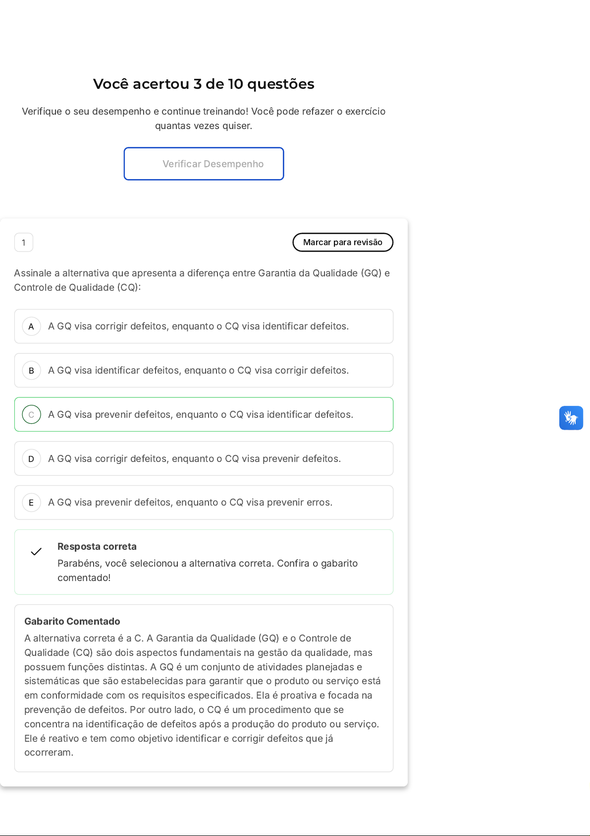 Você acertou 3 de 10 questões Verifique o seu desempenho e continue treinando! Você pode refazer o exercício quantas vezes quiser. Verificar Desempenho A B C D E 1 Marcar para revisão Assinale a alternativa que apresenta a diferença entre Garantia da Qualidade (GQ) e Controle de Qualidade (CQ): A GQ visa corrigir defeitos, enquanto o CQ visa identificar defeitos. A GQ visa identificar defeitos, enquanto o CQ visa corrigir defeitos. A GQ visa prevenir defeitos, enquanto o CQ visa identificar defeitos. A GQ visa corrigir defeitos, enquanto o CQ visa prevenir defeitos. A GQ visa prevenir defeitos, enquanto o CQ visa prevenir erros. Resposta correta Parabéns, você selecionou a alternativa correta. Confira o gabarito comentado! Gabarito Comentado A alternativa correta é a C. A Garantia da Qualidade (GQ) e o Controle de Qualidade (CQ) são dois aspectos fundamentais na gestão da qualidade, mas possuem funções distintas. A GQ é um conjunto de atividades planejadas e sistemáticas que são estabelecidas para garantir que o produto ou serviço está em conformidade com os requisitos especificados. Ela é proativa e focada na prevenção de defeitos. Por outro lado, o CQ é um procedimento que se concentra na identificação de defeitos após a produção do produto ou serviço. Ele é reativo e tem como objetivo identificar e corrigir defeitos que já ocorreram. A B C D E 2 Marcar para revisão Em relação à Garantia da Qualidade, apresentam-se as afirmativas a seguir: I. O plano da qualidade é um documento que descreve, entre outras atribuições, a viabilidade para se obter a qualidade de determinada tarefa. II. O Controle de Qualidade trata das técnicas operacionais e atividades empregadas para o acompanhamento da qualidade e dos custos operacionais, que visam comprovar que a qualidade foi alcançada no período de um ano. III. O manual da qualidade é um documento no qual se estabelece a auditoria da qualidade da empresa e o controle do fluxo de caixa das tarefas desenvolvidas. É correto o que se afirma em: I apenas II e III I e III II apenas III apenas Resposta incorreta Opa! A alternativa correta é a letra A. Confira o gabarito comentado! Gabarito Comentado A alternativa correta é a "I apenas". A afirmativa I está correta, pois o plano da qualidade é um documento que descreve a viabilidade para se obter a qualidade de determinada tarefa. No entanto, as afirmativas II e III estão incorretas. O Controle de Qualidade não se limita a um período de um ano e o manual da qualidade não estabelece o controle do fluxo de caixa das tarefas desenvolvidas, mas sim, define a política de qualidade da empresa e os procedimentos para garantir essa qualidade. 3 Marcar para revisão Os rolamentos são peças de alta precisão e sensíveis a lubrificações e montagens malfeitas. Dada a precária qualidade da mão de obra de uma empresa, dada a região de sua localização, o gestor da manutenção determinou que a manutenção de rolamentos de diversos equipamentos passaria a ser preditiva. Isso significa que: A B C D E A B C D E Após certo tempo, os rolamentos serão forçosamente trocados, independentemente de seu estado. Uma vida útil mais reduzida deverá ser considerada para substituição. O critério de manutenção passou a ser aquele que é conhecido por TPM. A empresa terá de investir em máquinas de ensaio para prever a vida real de todos os rolamentos. A empresa terá de investir em sistemas de monitoramento dos rolamentos. Resposta incorreta Opa! A alternativa correta é a letra E. Confira o gabarito comentado! Gabarito Comentado A alternativa correta é a E. A manutenção preditiva é um tipo de manutenção que se baseia no acompanhamento periódico das condições de funcionamento e desempenho dos equipamentos. Isso é feito por meio de monitoramento constante, utilizando-se para isso sistemas de monitoramento. Portanto, a empresa terá de investir em sistemas de monitoramento dos rolamentos para implementar a manutenção preditiva. Isso permitirá identificar possíveis falhas antes que elas ocorram, evitando paradas não programadas e aumentando a vida útil dos rolamentos. 4 Marcar para revisão A essência da qualidade se baseia em realizar o controle com base em suas causas. Algumas características são fundamentais para este processo, como: Tomar medidas corretivas. Praticar métodos próprios de avaliação. Investir em tecnologia. Terceirizar processos. Investir em profissionais previamente capacitados. Resposta incorreta A B C D E Opa! A alternativa correta é a letra C. Confira o gabarito comentado! Gabarito Comentado O controle de qualidade é um processo que se baseia em diversas ações, entre elas: Estabelecer condições de defeito zero para manter equipamentos e processos de produção que não produzam quaisquer defeitos. Verificar e medir as condições periodicamente. Prevenir defeitos, mantendo as condições nos intervalos padrão. Monitorar as tendências e prever a possível ocorrência de defeitos. Tomar medidas preventivas. Investir em treinamento. Investir em tecnologia. Implantar métricas. Praticar o método PDCA (Planejar, Executar, Verificar e Atuar). Entre as alternativas apresentadas, a opção que melhor se encaixa nesse contexto é a alternativa C: "Investir em tecnologia". A tecnologia é uma ferramenta essencial para o controle de qualidade, pois permite a automação de processos, a coleta e análise de dados, a identificação de tendências e a previsão de possíveis defeitos, entre outras funcionalidades. Portanto, o investimento em tecnologia é uma característica fundamental para a realização do controle de qualidade baseado em suas causas. 5 Marcar para revisão Uma empresa está implantando a confiabilidade como a base de seu plano de manutenção. Ela prevê que deverá seguir estes passos: I. Identificar as potenciais falhas de todo o sistema. II. Analisar os modos de falha e as causas-raiz de todo o sistema. II