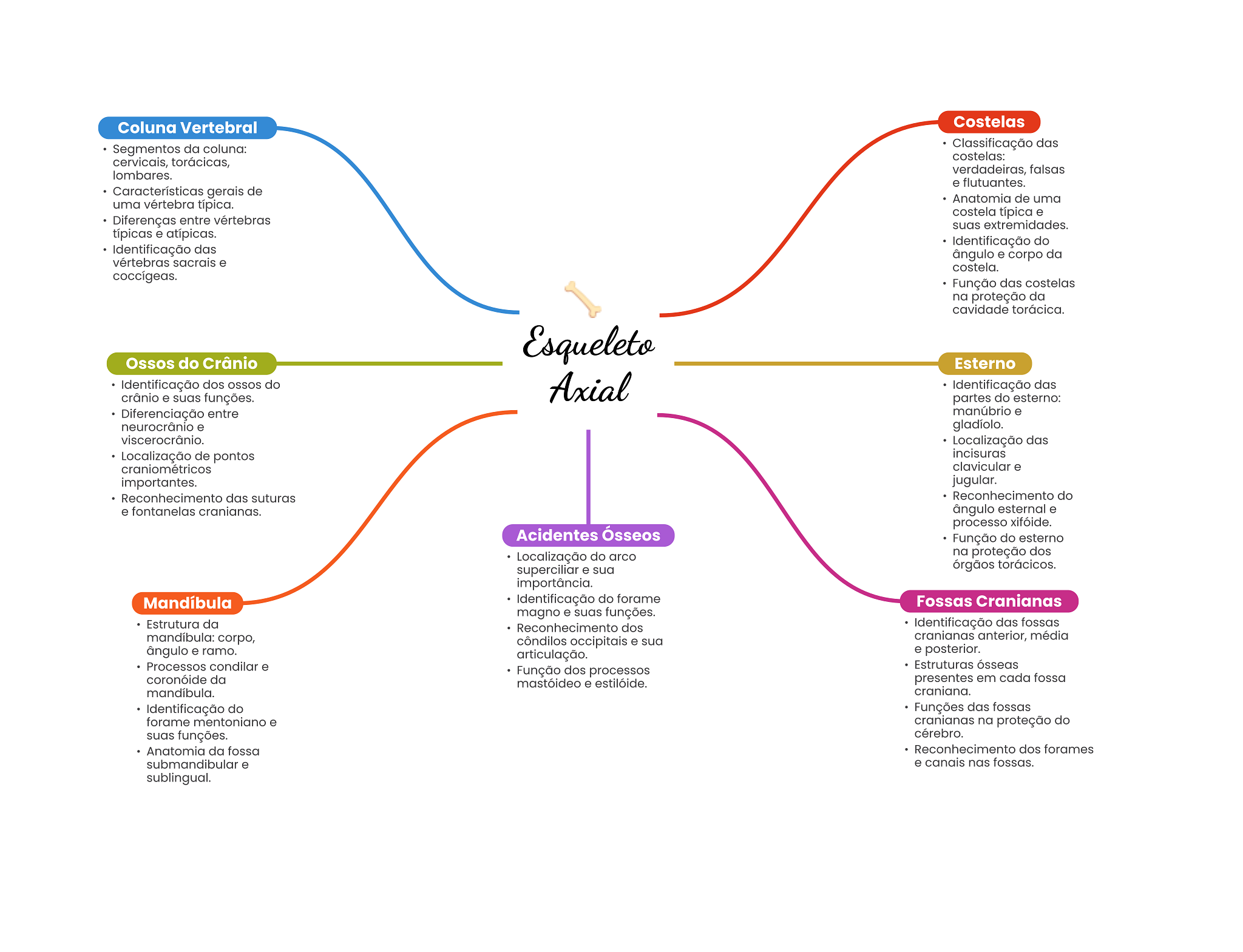 Coluna Vertebral Costelas Segmentos da coluna: Classificação das costelas: cervicais, torácicas, lombares. verdadeiras, falsas e flutuantes. Características gerais de Anatomia de uma uma vértebra típica. costela típica e Diferenças entre vértebras suas extremidades. típicas e atípicas. Identificação do Identificação das ângulo e corpo da vértebras sacrais e costela. coccígeas. Função das costelas na proteção da cavidade torácica. Esqueleto Ossos do Crânio Esterno Identificação dos OSSOS do crânio e suas funções. Axial Identificação das partes do esterno: Diferenciação entre manúbrio e neurocrânio e gladíolo. viscerocrânio. Localização das Localização de pontos incisuras craniométricos clavicular e importantes. jugular. das suturas Reconhecimento do e fontanelas cranianas. ângulo esternal e processo xifóide. Acidentes Ósseos Função do esterno Localização do arco na proteção dos superciliar e sua órgãos torácicos. importância. Mandíbula Identificação do forame Fossas Cranianas magno e suas funções. Estrutura da Reconhecimento dos Identificação das fossas mandíbula: corpo, côndilos occipitais e sua cranianas anterior, média ângulo e ramo. articulação. e posterior. Processos condilar e Estruturas ósseas Função dos processos coronóide da mastóideo e estilóide. presentes em cada fossa mandíbula. craniana. Identificação do Funções das fossas forame mentoniano e cranianas na proteção do suas funções. cérebro. Anatomia da fossa Reconhecimento dos forames submandibular e e canais nas fossas. sublingual.