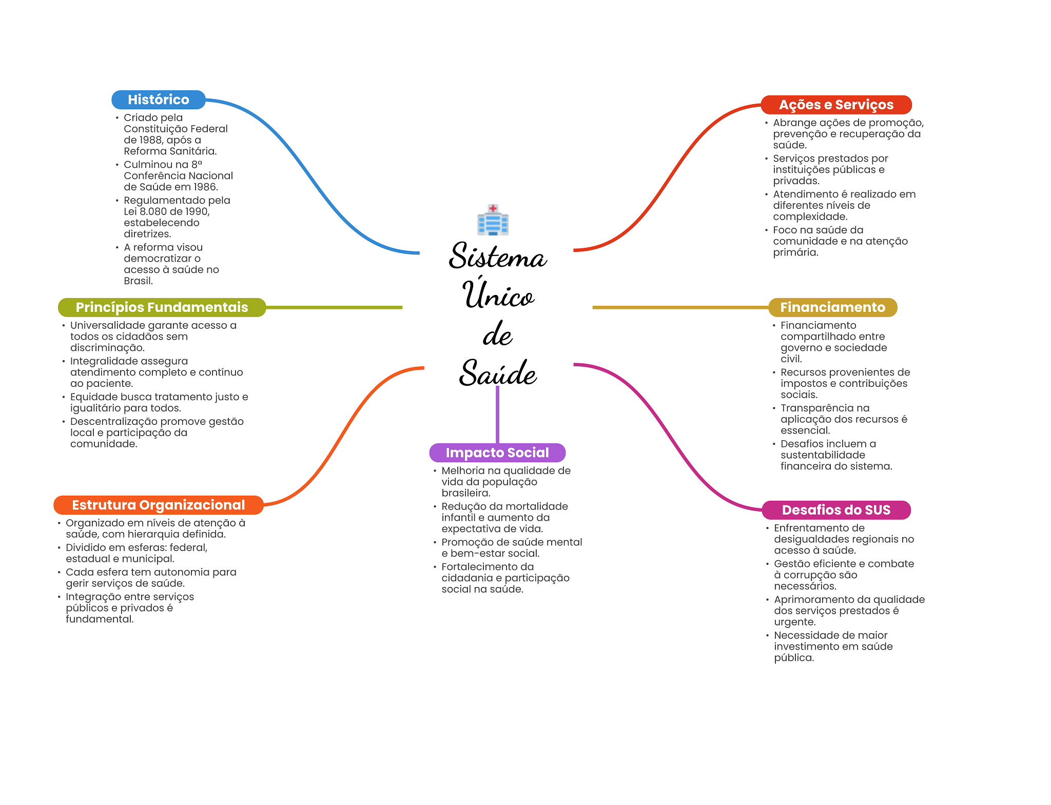 Histórico Ações e Serviços Criado pela Constituição Federal Abrange ações de promoção, de 1988, após a prevenção e recuperação da saúde. Reforma Sanitária. Culminou na Serviços prestados por Conferência Nacional instituições públicas e de Saúde em 1986. privadas. Atendimento é realizado em Regulamentado pela diferentes níveis de Lei 8.080 de 1990, estabelecendo complexidade. diretrizes. Foco na saúde da A reforma visou comunidade e na atenção democratizar Sistema primária. acesso à saúde no Brasil. Único Princípios Fundamentais Financiamento Universalidade garante acesso a todos OS cidadãos sem de Financiamento compartilhado entre discriminação. governo e sociedade Integralidade assegura civil. atendimento completo e contínuo Saúde Recursos provenientes de ao paciente. impostos e contribuições Equidade busca tratamento justo e sociais. igualitário para todos. Transparência na Descentralização promove gestão aplicação dos recursos é local e participação da essencial. comunidade. Desafios incluem a Impacto Social sustentabilidade Melhoria na qualidade de financeira do sistema. vida da população brasileira. Estrutura Organizacional Redução da mortalidade Desafios do SUS infantil e aumento da Organizado em níveis de atenção à expectativa de vida. Enfrentamento de saúde, com hierarquia definida. Promoção de saúde mental desigualdades regionais no Dividido em esferas: federal, e bem-estar social. acesso à saúde. estadual e municipal. Fortalecimento da Gestão eficiente e combate Cada esfera tem autonomia para gerir serviços de saúde. cidadania e participação à corrupção são social na saúde. necessários. Integração entre serviços Aprimoramento da qualidade públicos e privados é dos serviços prestados é fundamental. urgente. Necessidade de maior investimento em saúde pública.
