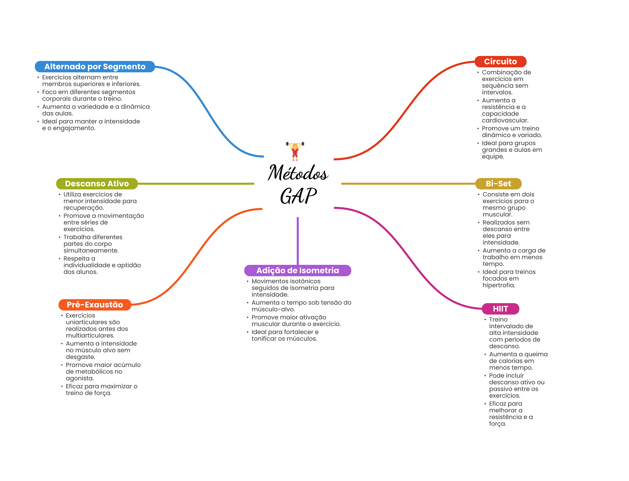 Circuito Alternado por Segmento Combinação de Exercícios alternam entre exercícios em membros superiores e inferiores. sequência sem Foco em diferentes segmentos intervalos. corporais durante treino. Aumenta a Aumenta a variedade e a dinâmica resistência e a das aulas. capacidade Ideal para manter a intensidade cardiovascular. e O engajamento. Promove um treino dinâmico e variado. Ideal para grupos grandes e aulas em equipe. Métodos Descanso Ativo Bi-Set Utiliza exercícios de GAP Consiste em dois menor intensidade para exercícios para o recuperação. mesmo grupo Promove a movimentação muscular. entre séries de Realizados sem exercícios. descanso entre Trabalha diferentes eles para partes do corpo intensidade. simultaneamente. Aumenta a carga de Respeita a trabalho em menos individualidade e aptidão tempo. dos alunos. Adição de Isometria Ideal para treinos Movimentos isotônicos focados em seguidos de isometria para hipertrofia. intensidade. Pré-Exaustão Aumenta tempo sob tensão do músculo-alvo. HIIT Exercícios Promove maior ativação uniarticulares são Treino muscular durante exercício. realizados antes dos intervalado de multiarticulares. Ideal para fortalecer e alta intensidade tonificar OS músculos. com períodos de Aumenta a intensidade descanso. no músculo alvo sem desgaste. Aumenta a queima de calorias em Promove maior acúmulo de metabólicos no menos tempo. agonista. Pode incluir descanso ativo ou Eficaz para maximizar passivo entre OS treino de força. exercícios. Eficaz para melhorar a resistência e a força.
