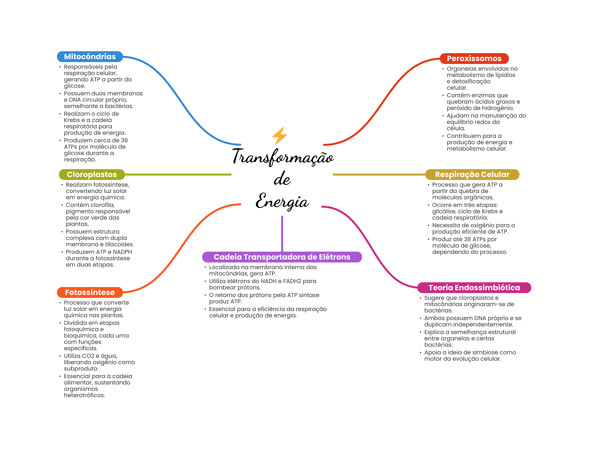 Mitocôndrias Peroxissomos Responsáveis pela Organelas envolvidas no respiração celular, metabolismo de lipídios gerando ATP a partir da e detoxificação glicose. celular. Possuem duas membranas Contêm enzimas que e DNA circular próprio, quebram ácidos graxos e semelhante a bactérias. peróxido de hidrogênio. Realizam ciclo de Ajudam na manutenção do Krebs e a cadeia equilíbrio redox da respiratória para célula. produção de energia. Contribuem para a Produzem cerca de 36 produção de energia e ATPs por molécula de metabolismo celular. glicose durante a respiração. Transformação Cloroplastos de Respiração Celular Realizam fotossíntese, Processo que gera ATP a convertendo luz solar partir da quebra de em energia química. Contêm clorofila, Energia moléculas orgânicas. Ocorre em três etapas: pigmento responsável glicólise, ciclo de Krebs e pela cor verde das cadeia respiratória. plantas. Necessita de oxigênio para a Possuem estrutura produção eficiente de ATP. complexa com dupla Produz até 38 ATPs por membrana e tilacoides. molécula de glicose, Produzem ATP e NADPH dependendo do processo. durante a fotossíntese Cadeia Transportadora de Elétrons em duas etapas. Localizada na membrana interna das mitocôndrias, gera ATP. Utiliza elétrons do NADH e FADH2 para bombear prótons. Teoria Endossimbiótica Fotossíntese retorno dos prótons pela ATP sintase Sugere que cloroplastos e Processo que converte produz ATP. mitocôndrias originaram-se de luz solar em energia Essencial para a eficiência da respiração bactérias. química nas plantas. celular e produção de energia. Ambas possuem DNA próprio e se Dividida em etapas duplicam independentemente. fotoquímica e bioquímica, cada uma Explica a semelhança estrutural com funções entre organelas e certas bactérias. específicas. Apoia a ideia de simbiose como Utiliza CO2 e água, motor da evolução celular. liberando oxigênio como subproduto. Essencial para a cadeia alimentar, sustentando organismos heterotróficos.