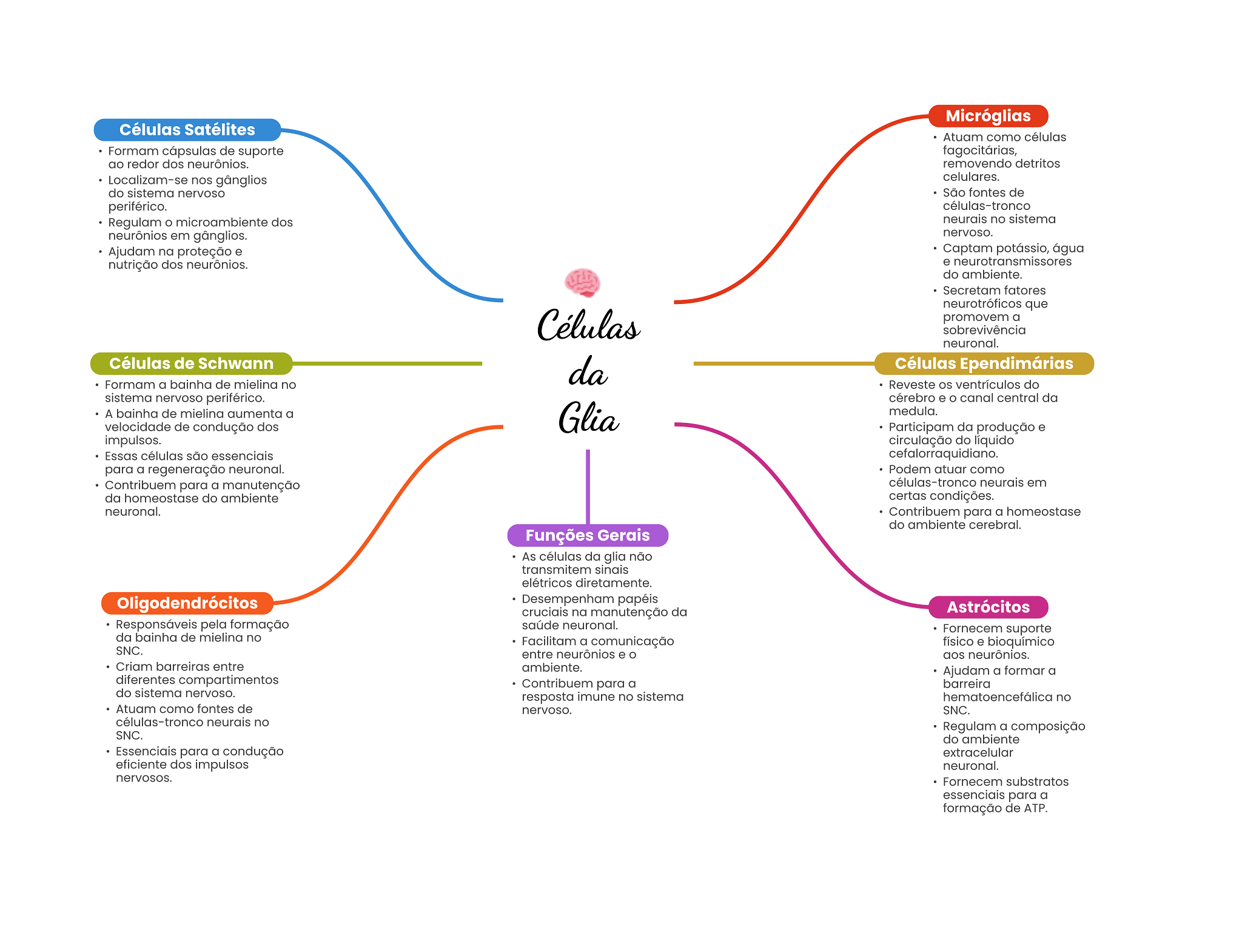 Micróglias Células Satélites Atuam como células Formam cápsulas de suporte fagocitárias, ao redor dos neurônios. removendo detritos Localizam-se nos gânglios celulares. do sistema nervoso São fontes de periférico. células-tronco Regulam microambiente dos neurais no sistema neurônios em gânglios. nervoso. Ajudam na proteção e Captam potássio, água nutrição dos neurônios. e neurotransmissores do ambiente. Secretam fatores neurotróficos que Células promovem a sobrevivência neuronal. Células de Schwann da Células Ependimárias Formam a bainha de mielina no Reveste ventrículos do sistema nervoso periférico. cérebro e O canal central da A bainha de mielina aumenta a Glia medula. velocidade de condução dos Participam da produção e impulsos. circulação do líquido Essas células são essenciais cefalorraquidiano. para a regeneração neuronal. Podem atuar como Contribuem para a manutenção células-tronco neurais em da homeostase do ambiente certas condições. neuronal. Contribuem para a homeostase do ambiente cerebral. Funções Gerais As células da glia não transmitem sinais elétricos diretamente. Oligodendrócitos Desempenham papéis cruciais na manutenção da Astrócitos Responsáveis pela formação saúde neuronal. Fornecem suporte da bainha de mielina no Facilitam a comunicação físico e bioquímico SNC. entre neurônios e aos neurônios. Criam barreiras entre ambiente. Ajudam a formar a diferentes compartimentos Contribuem para a barreira do sistema nervoso. resposta imune no sistema no Atuam como fontes de nervoso. SNC. células-tronco neurais no Regulam a composição SNC. do ambiente Essenciais para a condução extracelular eficiente dos impulsos neuronal. nervosos. Fornecem substratos essenciais para a formação de ATP.