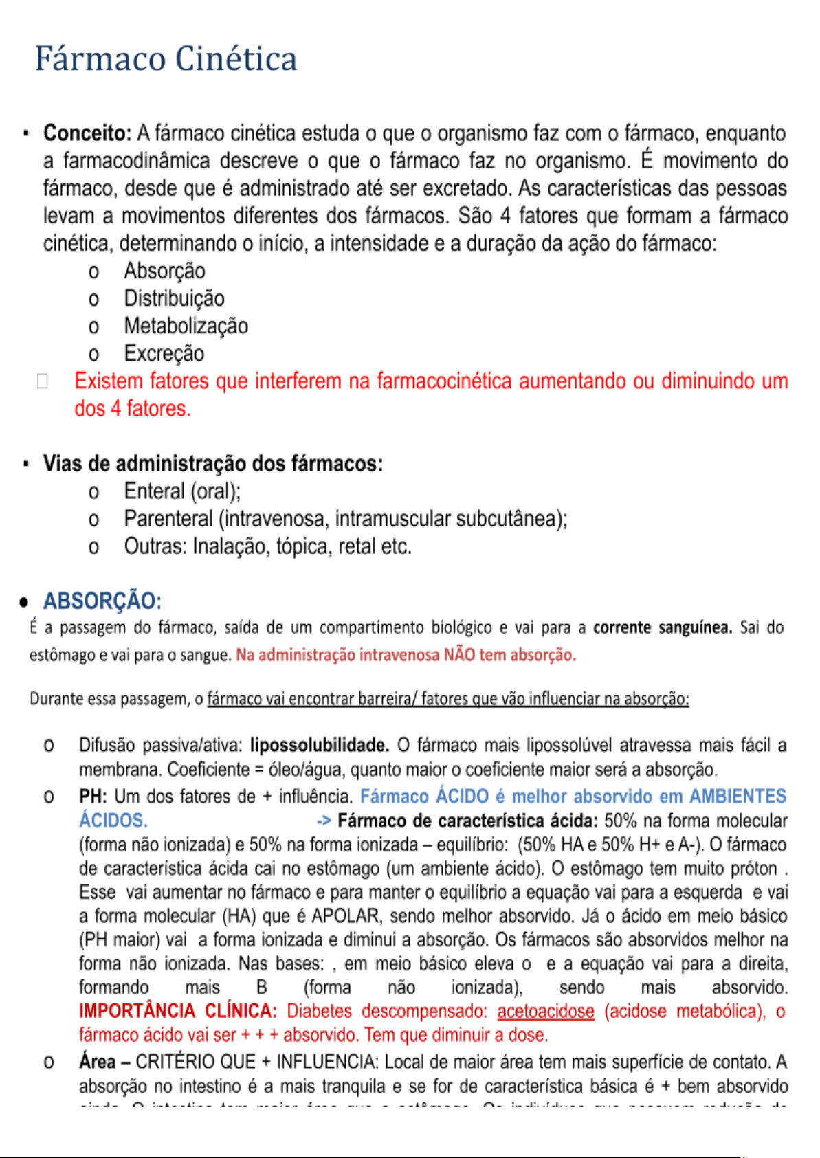 Fármaco Cinética Conceito: A fármaco cinética estuda o que 0 organismo faz com fármaco, enquanto a farmacodinâmica descreve o que fármaco faz no organismo. É movimento do fármaco, desde que é administrado até ser excretado. As características das pessoas levam a movimentos diferentes dos fármacos. São 4 fatores que formam a fármaco cinética, determinando início, a intensidade e a duração da ação do fármaco: Absorção Distribuição o Metabolização Excreção Existem fatores que interferem na farmacocinética aumentando ou diminuindo um dos 4 fatores. Vias de administração dos fármacos: Enteral (oral); Parenteral (intravenosa, intramuscular subcutânea); Outras: Inalação, tópica, retal etc. ABSORÇÃO: É a passagem do fármaco, saída de um compartimento biológico e vai para a corrente sanguínea. Sai do estômago e vai para sangue. Na administração intravenosa NÃO tem absorção. Durante essa passagem, o fármaco vai encontrar barreira/ fatores que vão influenciar na absorção: o Difusão passiva/ativa: lipossolubilidade. 0 fármaco mais lipossolúvel atravessa mais fácil a membrana. Coeficiente = óleo/água, quanto maior coeficiente maior será a absorção. PH: Um dos fatores de + influência. Fármaco ÁCIDO é melhor absorvido em AMBIENTES ÁCIDOS. Fármaco de característica ácida: 50% na forma molecular (forma não ionizada) e 50% na forma ionizada equilíbrio: (50% HA e 50% H+ e A-). o fármaco de característica ácida cai no estômago (um ambiente ácido). o estômago tem muito próton Esse vai aumentar no fármaco e para manter equilíbrio a equação vai para a esquerda e vai a forma molecular (HA) que é APOLAR, sendo melhor absorvido. Já 0 ácido em meio básico (PH maior) vai a forma ionizada e diminui a absorção. Os fármacos são absorvidos melhor na forma não ionizada. Nas bases: em meio básico eleva 0 e a equação vai para a direita, formando mais (forma não ionizada), sendo mais absorvido. IMPORTÂNCIA CLÍNICA: Diabetes descompensado: acetoacidose (acidose metabólica), o fármaco ácido vai ser + + + absorvido. Tem que diminuir a dose. Área CRITÉRIO QUE + INFLUENCIA: Local de maior área tem mais superfície de contato. A absorção no intestino é a mais tranquila e se for de característica básica é + bem absorvidoDISTRIBUIÇÃO: Já na circulação sanguínea (tomou fármaco e foi absorvido). À medida que ele entra no sangue ele encontra proteínas (albumina e -1 glicoproteína ácida). 0 fármaco vai se ligando às proteínas (ácido se liga a albumina e básico a -1 glicoproteína), mas não vai se ligar completamente: 80% LIGADO e 20% LIVRE. É dinâmico, 0 fármaco livre pode se tornar ligado e 0 ligado LIVRE. A porção do fármaco que será distribuída é a LIVRE: causa efeito. Quanto distribuição efeito e quanto a forma livre efeito. Clínica: Individuo toma anticoagulante Varfarina. Se liga 80% na albumina. OK. Toma um antifúngico que se liga a albumina: competição. A Varfarina fica + livre e a distribuição e efeito, pessoa entra em hemorragia. CETOCOMAZOL AUMENTA EFEITO DA VARFARINA, permitindo que ela fique mais livre. Mesmo raciocínio para quem tem deficiência em albumina: diabetes descompensado tem proteinuria 0 que albumina. Prestar atenção na dose do medicamento. Síndrome de Kwashiorkor: Desnutrição, perda esquelética e ganho de lipídios, deficiência em proteínas e muito carboidrato -> Leva a redução da albumina. Fatores que influenciam a distribuição: a absorção e a quantidade de proteínas céricas (+++ INFLUENCIA). Tecidos mais perfundidos: coração, rins, cérebro e intestino fármaco é distribuído mais rapidamente. Importante: Osso e adiposo são menos perfundidos, a distribuição demora +, porém eles acumulam + fármaco, um reservatório, que demora mais para sair. CLÍNICA: pacientes obesos que toma muito remédio e se acumula no tecido adiposo, pessoa faz muito exercício e perde tecido adiposo -> Intoxicação, por isso saber IMC para saber a dose do medicamento por conta dos reservatórios. A excreção é mais rápida nos tecidos mais perfundidos e mais lenta dos tecidos menos perfundidos. METABOLIZAÇÃO: Ou biotransformação: reação que vai converter composto ativo lipossolúvel em inativo hidrossolúvel; precisa inativar ser excretado. X (ativo), REL possui enzimas (fígado é o principal), composto no fígado sofré ação da enzima 1 (vai expor grupo funcional hidrossolúvel) - produz a inativação a partir da exposição do grupo hidrossolúvel Ou se toma um fármaco vida e efeito induz Bastante a 2 FASES: funcion e conjug. INIBE a enzima 1. Vai manter o fármaco ativo por mais tempo ou diminuir pró-fármaco. Enzimas 1 e 2, família enzimática na metabolização (citocromo p450): o CYP3A4: Metabolização de 60% dos fármacos. 60% dos fármacos. Junto com CYP3A4 = 90% dos fármacos. CYP2E1: Metabolização do paracetamol e álcool (pode atuar como inibidor ou indutor). Álcool: inibidor (beber de forma aguda), indutor (beber de forma crônica) etilismo crônico; Paracetamol: hepatotóxico (aumenta e é potencializado em etilismo crônico; sinérgico positivo, dano). No agudo lesão hepática.Excreção: Hepática (via biliar) - FEZES - 10%. Fármacos muito lipossolúveis ou dentro da rota. Urinária/ renal - URINA - 90%. Via principal de excreção. Um fármaco lipossolúvel precisa de transformação hepática (hematopata pode se intoxicar, pois não vai metabolizar para a excreção renal); Quando é hidrossolúvel um renopata pode se intoxicar; Fármaco ácido no néfron ácido é reabsorvido e excreção. Meio básico excreção; Biodisponibilidade = [] total do fármaco no sangue (fármaco livre + fármaco ligado); A excreção e metabolização DIMINUEM a