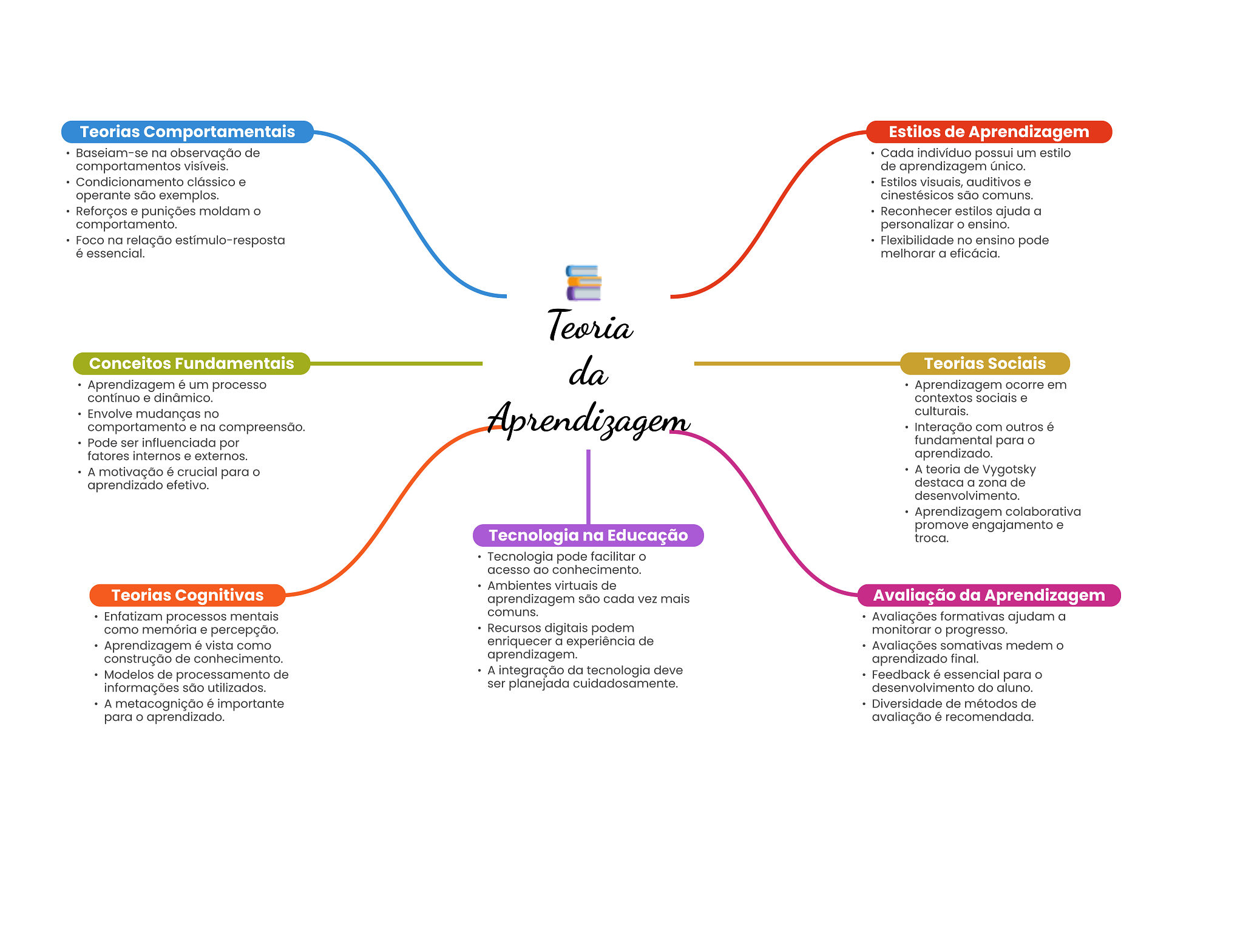 Teorias Comportamentais Estilos de Aprendizagem Baseiam-se na observação de Cada indivíduo possui um estilo comportamentos visíveis. de aprendizagem único. Condicionamento clássico e Estilos visuais, auditivos e operante são exemplos. cinestésicos são comuns. Reforços e punições moldam Reconhecer estilos ajuda a comportamento. personalizar ensino. Foco na relação Flexibilidade no ensino pode é essencial. melhorar a eficácia. Teoria Conceitos Fundamentais da Teorias Sociais Aprendizagem é um processo Aprendizagem ocorre em contínuo e dinâmico. contextos sociais e Envolve mudanças no comportamento e na compreensão. Aprendizagem culturais. Interação com outros é Pode ser influenciada por fundamental para O fatores internos e externos. aprendizado. A motivação é crucial para A teoria de Vygotsky aprendizado efetivo. destaca a zona de desenvolvimento. Aprendizagem colaborativa promove engajamento e Tecnologia na Educação troca. Tecnologia pode facilitar acesso ao conhecimento. Ambientes virtuais de Teorias Cognitivas aprendizagem são cada vez mais Avaliação da Aprendizagem Enfatizam processos mentais comuns. Avaliações formativas ajudam a como memória e percepção. Recursos digitais podem monitorar O progresso. Aprendizagem é vista como enriquecer a experiência de Avaliações somativas medem construção de conhecimento. aprendizagem. aprendizado final. Modelos de processamento de A integração da tecnologia deve Feedback é essencial para informações são utilizados. ser planejada cuidadosamente. desenvolvimento do aluno. A metacognição é importante Diversidade de métodos de para aprendizado. avaliação é recomendada.