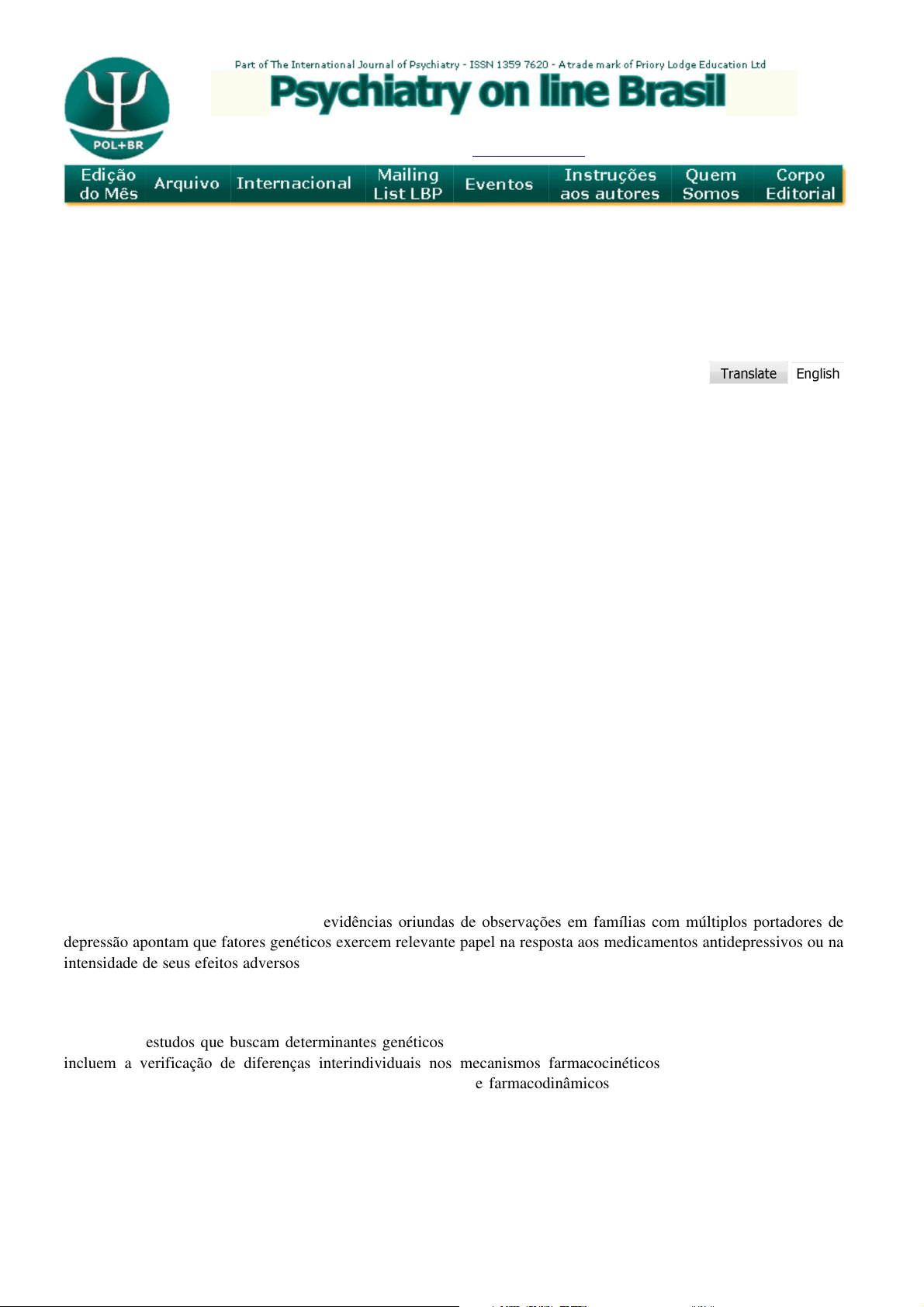 Agosto de 2013 - Vol.18 - Nº 8 Artigo do mês FARMACOGENÔNIMA: JANELA À MEDICINA PERSONALIZADA Carlos Alberto Crespo de Souza ** “A educação dos profissionais de saúde em farmacogenética como parte de seu currículo em farmacologia, e a exposição de seu potencial para a população em geral, serão indispensáveis para o sucesso da medicina personalizada”. Gurvitz e Rehavi, 2005. 1 1. Introdução. Como visto em artigos anteriores, ainda existem dificuldades na prescrição de antidepressivos em razão de seus paraefeitos e resposta inadequada ao tratamento inicial, sendo que cerca de seis semanas podem ser necessárias para caracterizar que um determinado medicamento não é efetivo para um caso específico. De acordo com Meira Lima e cols., em razão desses fatos bem conhecidos pelos psiquiatras, pesquisadores têm buscado identificar preditores clínicos eficientes para uma boa resposta ao fármaco escolhido, o que poderia evitar a exposição do paciente a um longo período de terapia baseado na tentativa e erro, bem como reduziria a chance de reações adversas. 2 Cabe recordar que, nesse processo, muitos pacientes não toleram aguardar algum benefício depois de prescrições ineficazes, abandonando o tratamento. Segundo os mesmos autores, evidências oriundas de observações em famílias com múltiplos portadores de depressão apontam que fatores genéticos exercem relevante papel na resposta aos medicamentos antidepressivos ou na intensidade de seus efeitos adversos. Nesse caminho, a farmacogenética surgiu como uma nova ferramenta diagnóstica que se propõe a buscar informações genéticas para subsidiar e guiar decisões da farmacoterapia e, com isso, melhorar o desfecho clínico com decisões personalizadas. Ibid Os estudos que buscam determinantes genéticos para uma boa ou má resposta ao tratamento farmacológico incluem a verificação de diferenças interindividuais nos mecanismos farmacocinéticos – estudos focalizados em variantes gênicas das enzimas metabolizadoras das drogas – e farmacodinâmicos – estudos que focalizam variantes funcionais dos genes que codificam os sítios envolvidos no mecanismo de ação das drogas. Ibid De acordo com Gurwitz e Rehavi por cinquenta anos a farmacogenética vinha estudando as bases genéticas para a variabilidade na resposta a drogas entre pacientes individuais, tanto no que diz respeito à toxicidade como à sua eficácia. Entretanto, somente depois que o Projeto do Genoma Humano foi completado há sete anos e o desenvolvimento de tecnologias possibilitou uma identificação dos alelos polimórficos usando “chips” de DNA, a farmacogenética conseguiu rapidamente introduzir a medicina personalizada. 1 Volume 22 - Fevereiro de 2017 Editor: Giovanni Torello Farmacogenônima: janela à medicina personalizada http://www.polbr.med.br/ano13/art0813.php 1 de 12 13/03/2017 15:39 Paula Cristina Paula Cristina Paula Cristina Paula Cristina Para Ehret, com a conclusão do Projeto do Genoma Humano foram conduzidos estudos investigando a associação entre a correspondência dos antidepressivos e polimorfismos selecionados. Os estudos foram completados pela investigação dos polimorfismos no sistema monoaminérgico, incluindo os genes transportadores de serotonina, o 1A, 2A e seis genes receptores, os genes G-proteínas-ligantes (G-protein-coupled), o gene triptofano hidroxilase 1, o gene monoamino oxidase, os genes dos receptores de dopamina e os genes noradrenérgicos. 3 Segundo Lynch e Price, as enzimas do Citocromo P450 são essenciais para o metabolismo de muitos fármacos. Embora esta classe possua mais de cinquenta enzimas, sete delas metabolizam 90% das drogas, sendo duas as mais significantes: CYP3A4 e CYP2D6. A variabilidade genética (polimorfismo) nessas enzimas pode influenciar a resposta dos pacientes à prescrição comum de certas classes de fármacos, incluindo betabloqueadores e antidepressivos. 4 Esses autores mostram que as enzimas do Citocromo P450 podem ser inibidas ou induzidas por determinados fármacos, resultando numa significativa interação clínica droga-droga que pode causar reações adversas antecipadas ou falhas terapêuticas. Interações entre warfarina, antidepressivos, drogas antiepilépticas e estatinas muitas vezes envolvem as enzimas do Citocromo P450. O conhecimento das mais importantes drogas metabolizadas pelas enzimas do Citocromo P450, assim como as mais potentes inibidoras ou indutoras, pode ajudar para minimizar a possibilidade de reações adversas e interações. Ibid Há visível otimismo, entre os autores, sobre o novo campo recém descoberto da medicina genética. Manolopoulos, da Democritus University of Thrace, Alexandroupolis, Grécia, afirma: “A farmacogenética e a farmacogenômica lidam com as variações genéticas determinadas nas quais os indivíduos respondem às drogas. Elas detêm o potencial para revolucionar a terapia com drogas”. 5 Brockmöller e Tzvetkov, do Departamento de Farmacologia Clínica da Universidade de Göttingen, Alemanha, enfatizam “A variação no genoma humano é a causa mais importante na resposta variável às drogas e outros xenobióticos. A susceptibilidade para a maioria das doenças é determinada, em alguma extensão, pela variação genética ”. 6 O presente artigo procura contemplar, de forma sumária, esses conhecimentos recentemente adquiridos sobre a farmacogenômica, uma nova luz a clarear nosso entendimento sobre a metabolização de diversos fármacos, entre os quais os antidepressivos. 2. Considerações iniciais. Farmacogenômica é o estudo da relação entre a variabilidade interindividual de um gene candidato e a influência dessa variação na distribuição das drogas e de seus efeitos. O campo da farmacogenômica começou com um foco no metabolismo das drogas, porém tem se estendido atualmente para abarcar o amplo espectro da distribuição das drogas, incluindo receptores e uma crescente lista de trans