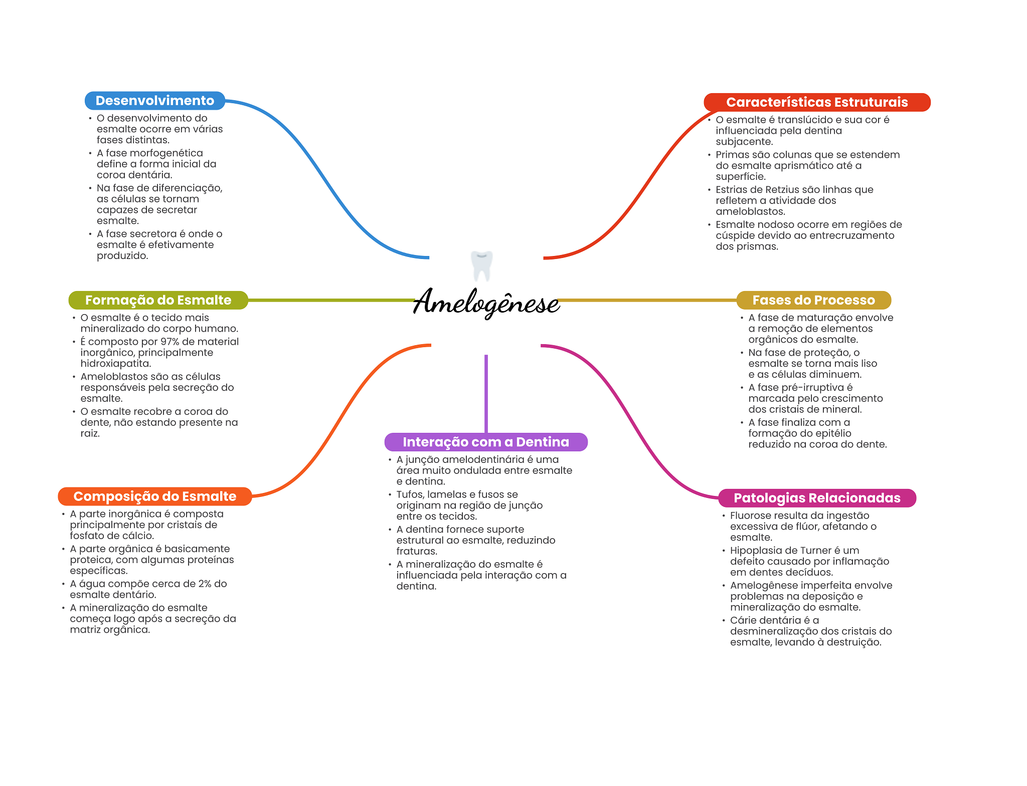 Desenvolvimento Características Estruturais desenvolvimento do esmalte é translúcido e sua cor é esmalte ocorre em várias influenciada pela dentina fases distintas. subjacente. A fase morfogenética Primas são colunas que se estendem define a forma inicial da do esmalte aprismático até a coroa dentária. superfície. Na fase de diferenciação, Estrias de Retzius são linhas que as células se tornam refletem a atividade dos capazes de secretar ameloblastos. esmalte. Esmalte nodoso ocorre em regiões de A fase secretora é onde cúspide devido ao esmalte é efetivamente dos prismas. produzido. Formação do Esmalte Amelogênese Fases do Processo esmalte é tecido mais A fase de maturação envolve mineralizado do corpo humano. a remoção de elementos É composto por 97% de material orgânicos do esmalte. inorgânico, principalmente Na fase de proteção, hidroxiapatita. esmalte se torna mais liso Ameloblastos são as células e as células diminuem. responsáveis pela secreção do A fase pré-irruptiva é esmalte. marcada pelo crescimento esmalte recobre a coroa do dos cristais de mineral. dente, não estando presente na A fase finaliza com a raiz. formação do epitélio Interação com a Dentina reduzido na coroa do dente. A junção amelodentinária é uma área muito ondulada entre esmalte e dentina. Composição do Esmalte Tufos, lamelas e fusos se Patologias Relacionadas originam na região de junção A parte inorgânica é composta entre tecidos. Fluorose resulta da ingestão principalmente por cristais de A dentina fornece suporte excessiva de flúor, afetando fosfato de cálcio. estrutural ao esmalte, reduzindo esmalte. A parte orgânica é basicamente fraturas. Hipoplasia de Turner é um proteica, com algumas proteínas A mineralização do esmalte é defeito causado por inflamação específicas. influenciada pela interação com a em dentes decíduos. A água compõe cerca de 2% do dentina. Amelogênese imperfeita envolve esmalte dentário. problemas na deposição e A mineralização do esmalte mineralização do esmalte. começa logo após a secreção da Cárie dentária é a matriz orgânica. desmineralização dos cristais do esmalte, levando à destruição.