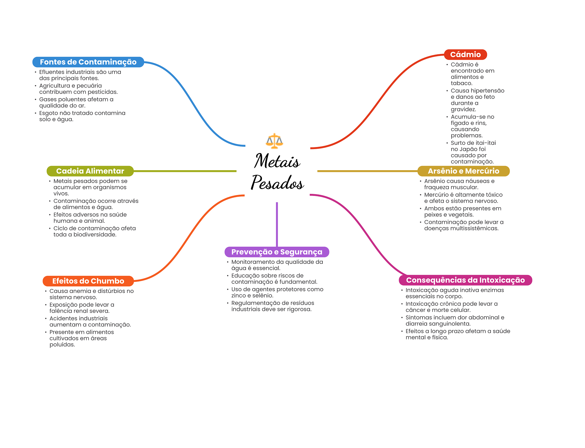 Cádmio Fontes de Contaminação Cádmio é Efluentes industriais são uma encontrado em das principais fontes. alimentos e Agricultura e pecuária tabaco. contribuem com pesticidas. Causa hipertensão Gases poluentes afetam a e danos ao feto durante a qualidade do ar. gravidez. Esgoto não tratado contamina solo e água. Acumula-se no fígado e rins, causando problemas. Surto de itai-itai no Japão foi Metais causado por contaminação. Cadeia Alimentar Arsênio e Mercúrio Metais pesados podem se acumular em organismos Pesados Arsênio causa náuseas e fraqueza muscular. vivos. Mercúrio é altamente tóxico Contaminação ocorre através e afeta sistema nervoso. de alimentos e água. Ambos estão presentes em Efeitos adversos na saúde peixes e vegetais. humana e animal. Contaminação pode levar a Ciclo de contaminação afeta doenças multissistêmicas. toda a biodiversidade. Prevenção e Segurança Monitoramento da qualidade da água é essencial. Educação sobre riscos de Efeitos do Chumbo contaminação é fundamental. Consequências da Intoxicação Causa anemia e distúrbios no Uso de agentes protetores como Intoxicação aguda inativa enzimas sistema nervoso. zinco e selênio. essenciais no corpo. Exposição pode levar a Regulamentação de resíduos Intoxicação crônica pode levar a falência renal severa. industriais deve ser rigorosa. câncer e morte celular. Acidentes industriais Sintomas incluem dor abdominal e aumentam a contaminação. diarreia sanguinolenta. Presente em alimentos Efeitos a longo prazo afetam a saúde cultivados em áreas mental e física. poluídas.