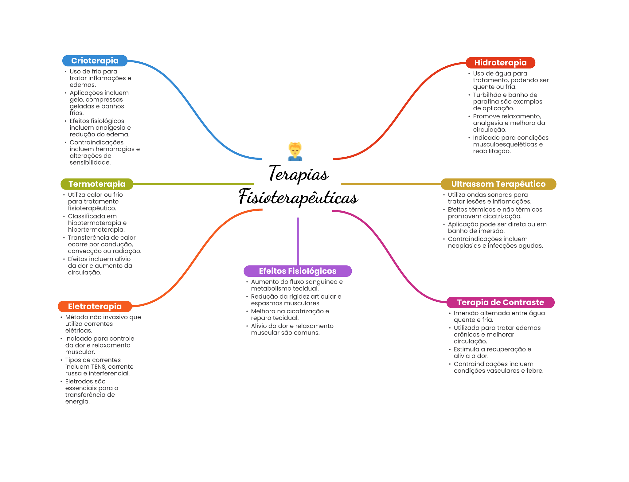 Crioterapia Hidroterapia Uso de frio para Uso de água para tratar inflamações e tratamento, podendo ser edemas. quente ou fria. Aplicações incluem Turbilhão e banho de gelo, compressas parafina são exemplos geladas e banhos de aplicação. frios. Promove relaxamento, Efeitos fisiológicos analgesia e melhora da incluem analgesia e circulação. redução do edema. Indicado para condições Contraindicações e incluem hemorragias e reabilitação. alterações de sensibilidade. Terapias Termoterapia Ultrassom Terapêutico Utiliza calor ou frio Fisioterapêuticas Utiliza ondas sonoras para para tratamento tratar lesões e inflamações. fisioterapêutico. Efeitos térmicos e não térmicos Classificada em promovem cicatrização. hipotermoterapia e Aplicação pode ser direta ou em hipertermoterapia. banho de imersão. Transferência de calor Contraindicações incluem ocorre por condução, neoplasias e infecções agudas. convecção ou radiação. Efeitos incluem alívio da dor e aumento da circulação. Efeitos Fisiológicos Aumento do fluxo sanguíneo e metabolismo tecidual. Redução da rigidez articular e Eletroterapia espasmos musculares. Terapia de Contraste Melhora na cicatrização e Imersão alternada entre água Método não invasivo que reparo tecidual. quente e fria. utiliza correntes Alívio da dor e relaxamento elétricas. Utilizada para tratar edemas muscular são comuns. crônicos e melhorar Indicado para controle circulação. da dor e relaxamento muscular. Estimula a recuperação e alivia a dor. Tipos de correntes incluem TENS, corrente Contraindicações incluem russa e interferencial. condições vasculares e febre. Eletrodos são essenciais para a transferência de energia.