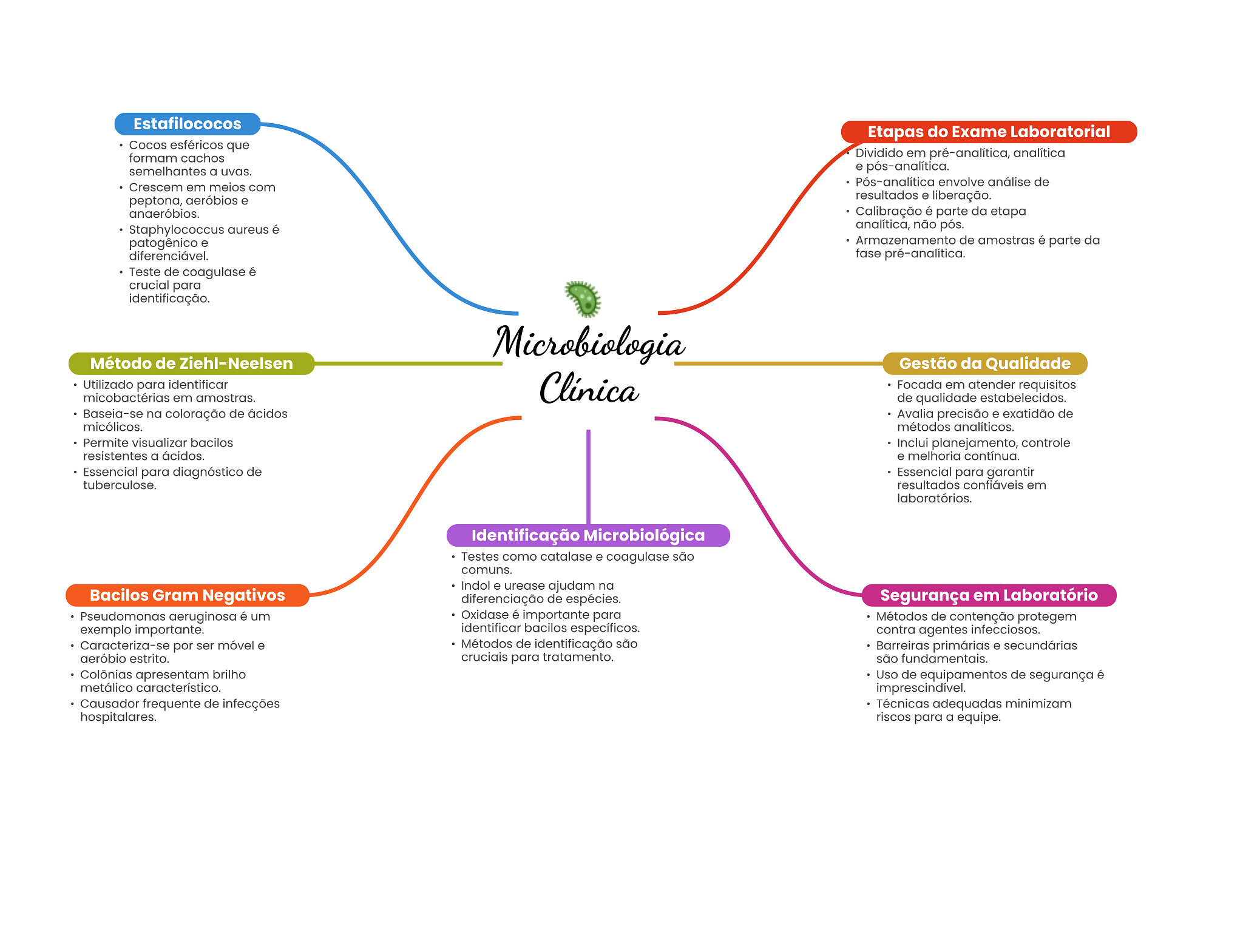 Estafilococos Etapas do Exame Laboratorial Cocos esféricos que formam cachos Dividido em pré-analítica, analítica semelhantes a uvas. e Crescem em meios com Pós-analítica envolve análise de peptona, aeróbios e resultados e liberação. anaeróbios. Calibração é parte da etapa Staphylococcus aureus é analítica, não pós. patogênico e Armazenamento de amostras é parte da diferenciável. fase pré-analítica. Teste de coagulase é crucial para identificação. Microbiologia Método de Ziehl-Neelsen Gestão da Qualidade Utilizado para identificar Clínica Focada em atender requisitos micobactérias em amostras. de qualidade estabelecidos. Baseia-se na coloração de ácidos Avalia precisão e exatidão de micólicos. métodos analíticos. Permite visualizar bacilos Inclui planejamento, controle resistentes a ácidos. e melhoria contínua. Essencial para diagnóstico de Essencial para garantir tuberculose. resultados confiáveis em laboratórios. Identificação Microbiológica Testes como catalase e coagulase são comuns. Indol e urease ajudam na Bacilos Gram Negativos diferenciação de espécies. Segurança em Laboratório Pseudomonas aeruginosa é um Oxidase é importante para Métodos de contenção protegem exemplo importante. identificar bacilos específicos. contra agentes infecciosos. Caracteriza-se por ser móvel e Métodos de identificação são Barreiras primárias e secundárias aeróbio estrito. cruciais para tratamento. são fundamentais. Colônias apresentam brilho Uso de equipamentos de segurança é metálico característico. imprescindível. Causador frequente de infecções Técnicas adequadas minimizam hospitalares. riscos para a equipe.