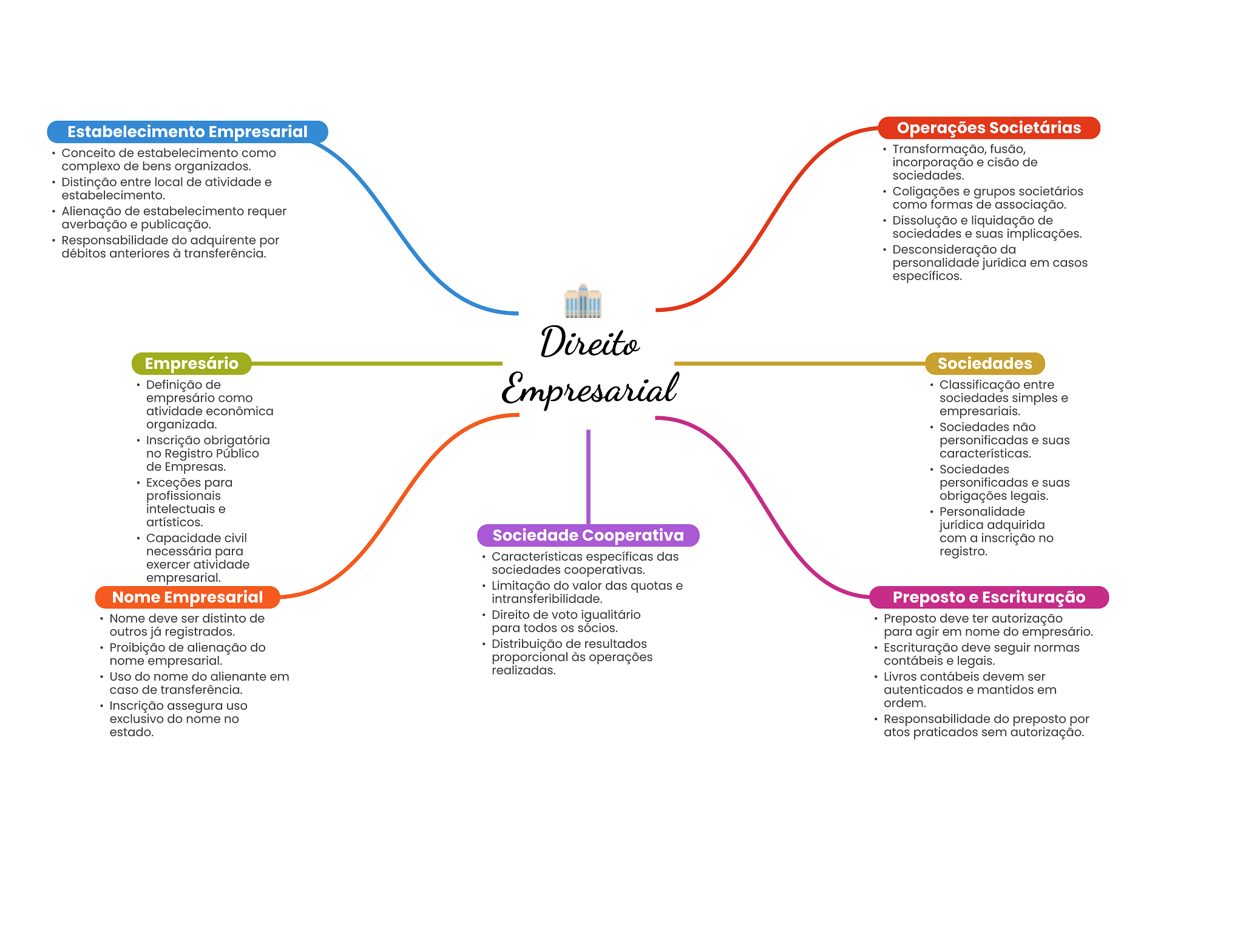 Estabelecimento Empresarial Operações Societárias Conceito de estabelecimento como Transformação, fusão, complexo de bens organizados. incorporação e cisão de sociedades. Distinção entre local de atividade e Coligações e grupos societários Alienação de estabelecimento requer como formas de associação. averbação e publicação. Dissolução e liquidação de Responsabilidade do adquirente por sociedades e suas implicações. débitos anteriores à transferência. Desconsideração da personalidade jurídica em casos específicos. Direito Empresário Sociedades Definição de empresário como Empresarial Classificação entre sociedades simples e atividade econômica empresariais. organizada. Sociedades não Inscrição obrigatória personificadas e suas no Registro Público características. de Empresas. Sociedades Exceções para personificadas e suas profissionais obrigações legais. intelectuais e Personalidade artísticos. jurídica adquirida Capacidade civil Sociedade Cooperativa com a inscrição no necessária para Características específicas das registro. exercer atividade sociedades cooperativas. empresarial. Limitação do valor das quotas e Nome Empresarial intransferibilidade Preposto e Escrituração Nome deve ser distinto de Direito de voto igualitário Preposto deve ter autorização outros já registrados. para todos OS sócios. para agir em nome do empresário. Proibição de alienação do Distribuição de resultados Escrituração deve seguir normas nome empresarial. proporcional às operações contábeis e legais. Uso do nome do alienante em realizadas. Livros contábeis devem ser caso de transferência. autenticados e mantidos em Inscrição assegura uso ordem. exclusivo do nome no Responsabilidade do preposto por estado. atos praticados sem autorização.