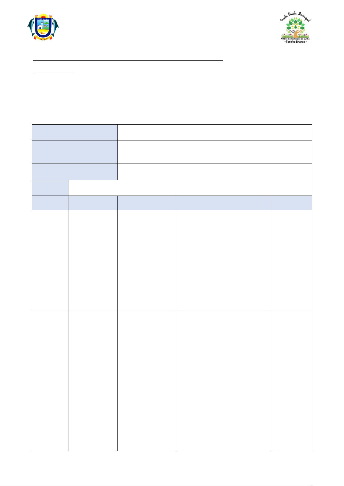 PREFEITURA DA CIDADE DE ARMAÇÃO DOS BÚZIOS SECRETARIA MUNICIPAL DE EDUCAÇÃO, CIÊNCIA E TECNOLOGIA CRECHE ANTÔNIO CARLOS PEREREIRA DA CUNHA Kelly C. da S. Penha – Supervisora Pedagógica – Port. MEC Nº 7843 PLANO DE AULA / PLANEJAMENTO PEDAGÓGICO – EDUCAÇÃO INFANTIL 1. Identificação Turma: Período: Faixa etária: ( ) Bebês | ( X) Crianças bem pequenas | ( ) Crianças pequenas Professora(o): Tema Gerador/Campo de investigação: Eu, meu corpo e meu lugar Intencionalidade Pedagógica: Promover o contato com alimentos saudáveis por meio de experiências lúdicas e sensoriais, incentivando hábitos alimentares saudáveis desde a infância Campos de Experiência: Objetivos: Incentivar o conhecimento e a valorização de alimentos saudáveis através de experiências lúdicas e sensoriais. DATA: ROTINA EXPERIÊNCIAS/VIVÊN CIAS ORGANIZAÇÃO DO ESPAÇO E TEMPO RECURSOS 11/03 *Acolhida *Roda inicial *Vivência corporal * Histórias contadas e ilustradas. *Parquinho *Lanche *Atividade de registro *Brincar livre *Encerramento Frutinhas das Mãos Realizar uma vivência artística utilizando o carimbo das mãos para representar frutas, explorando cores, formas e o tema da alimentação saudável. A atividade será realizada em aproximadamente 40 minutos, incluindo conversa inicial, pintura das mãos e montagem do mural. Tinta guache colorida, papel branco ou papel cartão, pincel ou esponja, canetinhas, tesoura, barbante e um galho para montar o mural das frutinhas. 12/03 *Acolhida *Roda inicial *Vivência corporal * Histórias contadas e ilustradas. *Parquinho *Lanche *Atividade de registro *Brincar livre *Encerramento Arte com Frutas *Acolhida – 15 min Música ou brincadeira sobre alimentos (ex: imitar frutas ou falar nomes de alimentos). *Exploração – 15 min Observação das frutas cortadas para perceber formato e textura. *Vivência – 25 min Atividade artística com carimbo de frutas usando tinta guache em papel, explorando cores e formas. *Encerramento – 10 min Exposição das produções das crianças e conversa sobre as cores e formas usadas. Frutas cortadas (maçã, banana, laranja ou batata para carimbo) Tinta guache colorida Pratos ou bandejas para colocar a tinta Folhas de papel ou cartolina PREFEITURA DA CIDADE DE ARMAÇÃO DOS BÚZIOS SECRETARIA MUNICIPAL DE EDUCAÇÃO, CIÊNCIA E TECNOLOGIA CRECHE ANTÔNIO CARLOS PEREREIRA DA CUNHA Kelly C. da S. Penha – Supervisora Pedagógica – Port. MEC Nº 7843 13/03 *Acolhida *Roda inicial *Vivência corporal * Histórias contadas e ilustradas. *Parquinho *Lanche *Atividade de registro *Brincar livre *Encerramento Pequenos Chefs (Culinária) *Acolhida – 15 min Conversa sobre as frutas que serão usadas na atividade. *Exploração – 15 min Apresentação dos ingredientes e observação das cores, cheiros e formatos. *Vivência – 25 min Preparação de uma vitamina usando bananas , ,maças e beterraba.(misturar, observar e ajudar). *Encerramento – 10 min Degustação coletiva e conversa sobre a importância de comer alimentos saudáveis. Frutas variadas (banana, maçã, beterraba ) Tigela ou recipiente grande Colheres para misturar Pratinhos ou copinhos para servir Colheres pequenas para as crianças PREFEITURA DA CIDADE DE ARMAÇÃO DOS BÚZIOS SECRETARIA MUNICIPAL DE EDUCAÇÃO, CIÊNCIA E TECNOLOGIA CRECHE ANTÔNIO CARLOS PEREREIRA DA CUNHA Kelly C. da S. Penha – Supervisora Pedagógica – Port. MEC Nº 7843 Tema Gerador/Campo de investigação: Meu caminho até escola Intencionalidade Pedagógica: Estimular a criança a reconhecer e explorar o caminho até a escola, percebendo os espaços do seu cotidiano e fortalecendo o sentimento de pertencimento ao lugar onde vive. Campos de Experiência: Espaços, tempos, relações e transformações”, “O eu, o outro e o nós”, “Escuta, fala, pensamento e imaginação” e “Traços, sons, cores e formas” Objetivos: Reconhecer o caminho de casa até a escola e identificar lugares do cotidiano no bairro. Estimular a expressão, a comunicação e o sentimento de pertencimento à comunidade. DATA: ROTINA EXPERIÊNCIAS/VIVÊN CIAS ORGANIZAÇÃO DO ESPAÇO E TEMPO RECURSOS 18/03 *Acolhida *Roda inicial *Vivência corporal * Histórias contadas e ilustradas. *Parquinho *Lanche *Atividade de registro *Brincar livre *Encerramento Minha casa, de onde eu venho. Roda de conversa sobre onde moram e com quem vivem. Desenho ou colagem representando a própria casa. Acolhida e conversa inicial Exploração de imagens de casas Atividade de desenho ou colagem Socialização das produções imagens de ruas e caminhos, fotos da escola, cartolina. 19/03 *Acolhida *Roda inicial *Vivência corporal * Histórias contadas e ilustradas. *Parquinho *Lanche *Atividade de registro *Brincar livre *Encerramento Meu Caminho O caminho até a escola Conversa sobre como chegam à escola. Desenho livre do caminho casa–escola, Roda de conversa *Observação de imagens de ruas e caminhos * Desenho do trajeto * Exposição dos desenhos folhas de papel, giz de cera, lápis de cor. 20/03 Lugares do Bairro O que existe no caminho Apresentação de imagens de lugares do bairro (praça, mercado, padaria). Conversa sobre o que veem no caminho para a escola. Conversa inicial *Observação de imagens * Relato das crianças * Registro com desenho imagens de praça, mercado, padaria, escola PREFEITURA DA CIDADE DE ARMAÇÃO DOS BÚZIOS SECRETARIA MUNICIPAL DE EDUCAÇÃO, CIÊNCIA E TECNOLOGIA CRECHE ANTÔNIO CARLOS PEREREIRA DA CUNHA Kelly C. da S. Penha – Supervisora Pedagógica – Port. MEC Nº 7843 25/03 Construindo o Caminho Vivência: Mapa coletivo Criação de um mapa coletivo representando casas, ruas e escola. Conversa sobre o caminho * Construção do mapa *Participação coletiva *Observação do resultado cartolina grande, canetões, papéis coloridos, cola. 26/03 Brincando de Cidade Maquete do bairro Construção de casas e ruas utilizando caixas, areia, folhas e gravetos, papel