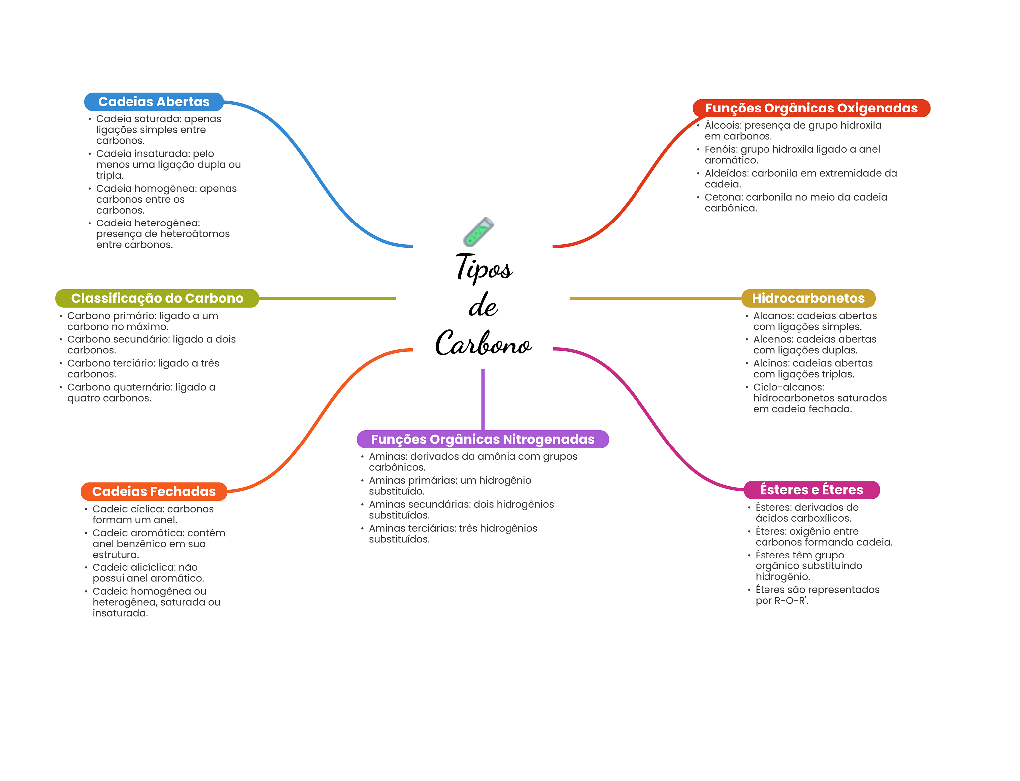 Cadeias Abertas Funções Orgânicas Oxigenadas Cadeia saturada: apenas ligações simples entre Álcoois: presença de grupo hidroxila carbonos. em carbonos. Cadeia insaturada: pelo Fenóis: grupo hidroxila ligado a anel menos uma ligação dupla ou aromático. tripla. Aldeídos: carbonila em extremidade da Cadeia homogênea: apenas cadeia. carbonos entre Cetona: carbonila no meio da cadeia carbonos. carbônica. Cadeia heterogênea: presença de heteroátomos entre carbonos. Tipos Classificação do Carbono de Hidrocarbonetos Carbono primário: ligado a um Alcanos: cadeias abertas carbono no máximo. com ligações simples. Carbono secundário: ligado a dois Carbono Alcenos: cadeias abertas carbonos. com ligações duplas. Carbono terciário: ligado a três Alcinos: cadeias abertas carbonos. com ligações triplas. Carbono quaternário: ligado a Ciclo-alcanos: quatro carbonos. hidrocarbonetos saturados em cadeia fechada. Funções Orgânicas Nitrogenadas Aminas: derivados da amônia com grupos carbônicos. Aminas primárias: um hidrogênio Cadeias Fechadas substituído. Ésteres e Éteres Cadeia cíclica: carbonos Aminas secundárias: dois hidrogênios Ésteres: derivados de formam um anel. substituídos. ácidos carboxílicos. Cadeia aromática: contém Aminas terciárias: três hidrogênios Éteres: oxigênio entre anel benzênico em sua substituídos. carbonos formando cadeia. estrutura. Ésteres têm grupo Cadeia alicíclica: não orgânico substituindo possui anel aromático. hidrogênio. Cadeia homogênea ou Éteres são representados heterogênea, saturada ou por insaturada.